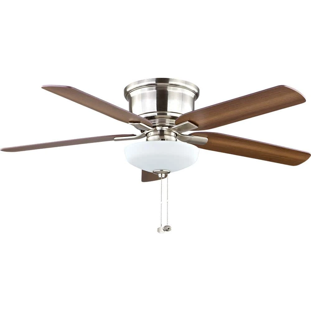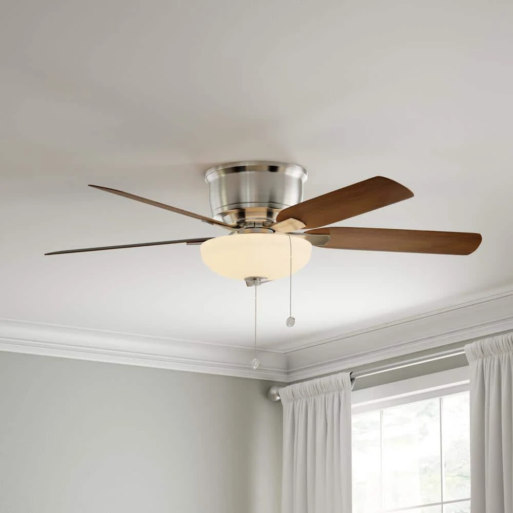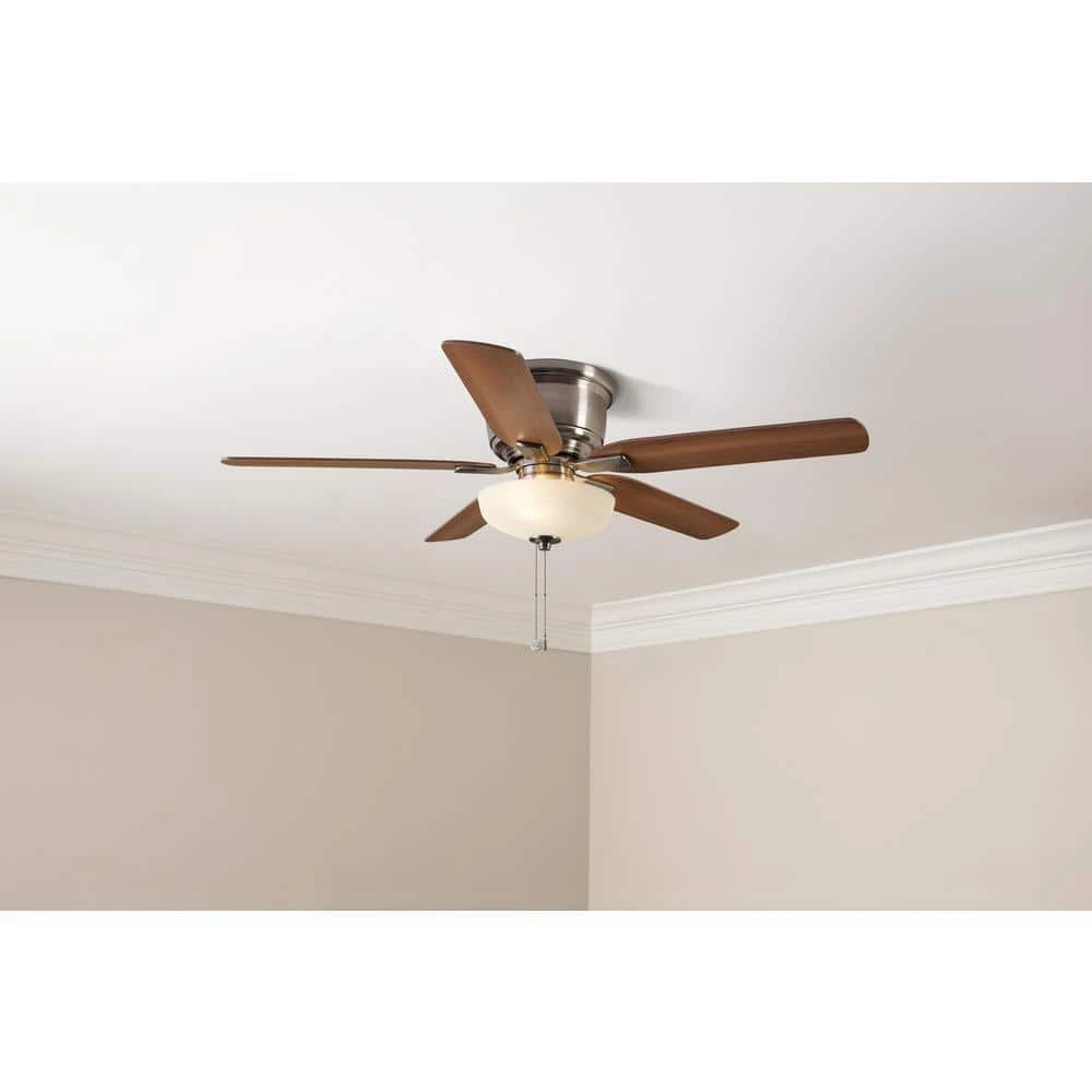 The Hampton Bay 52 in. Holly Springs Low Profile ceiling fan is the perfect solution for large rooms with low ceilings. The low profile design delivers optimal airflow without hanging too low. The Holly Springs Low Profile fan includes QuickFit features like a slide-on mounting bracket, AccuArm blade arms, and QuickInstall blades to make installation quick and easy. The fan is complemented by the frosted glass bowl light kit that uses three LED bulbs which last longer and use less energy than CFL or incandescent bulbs.