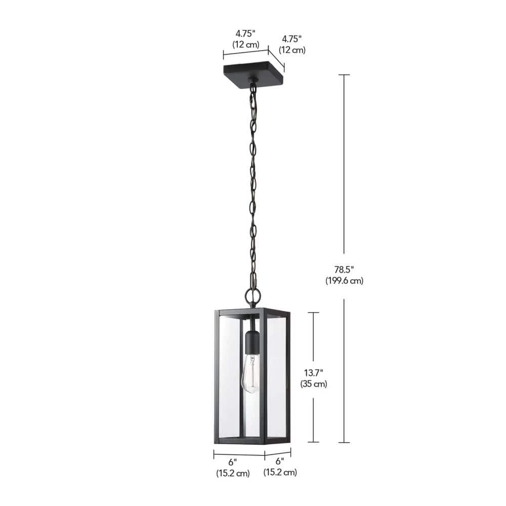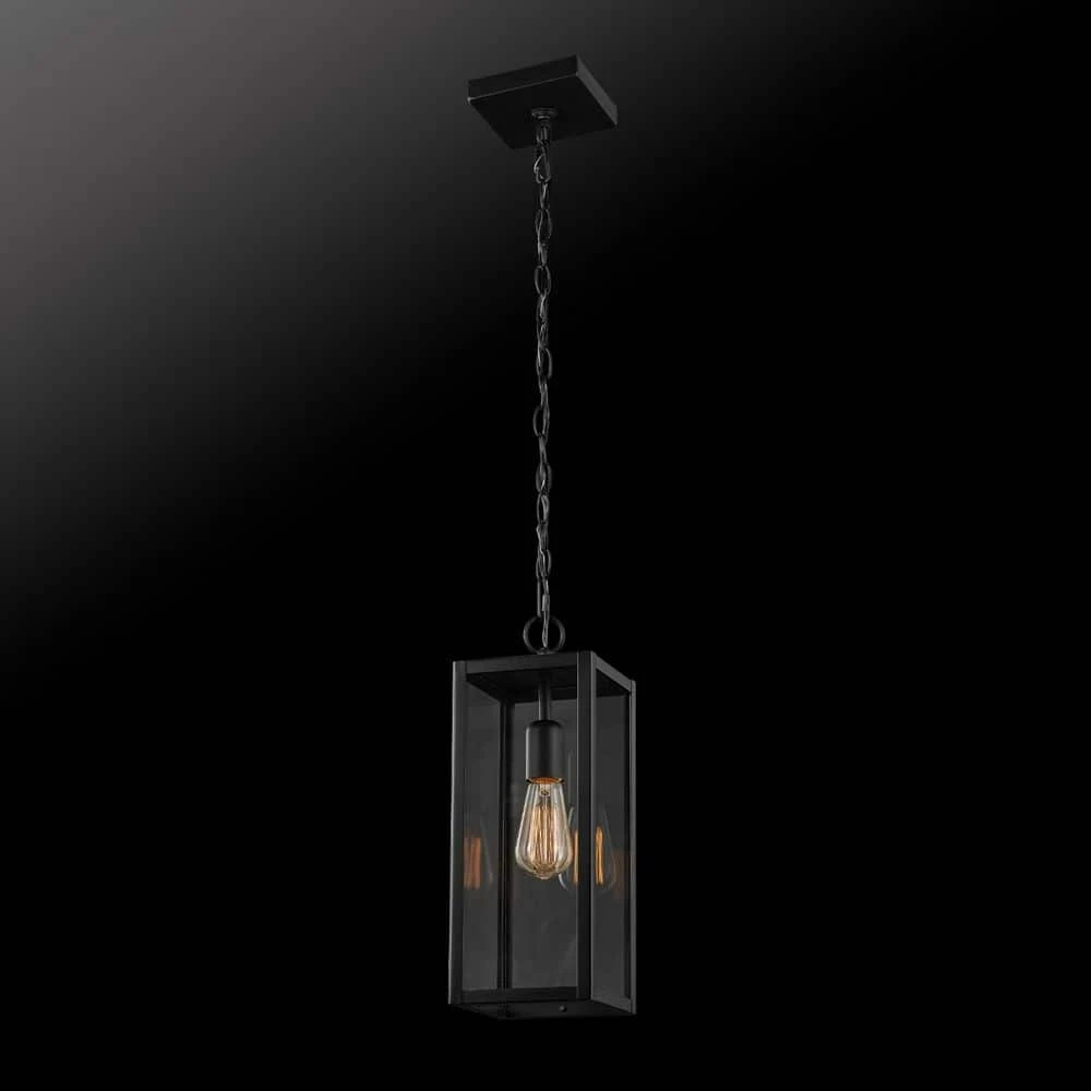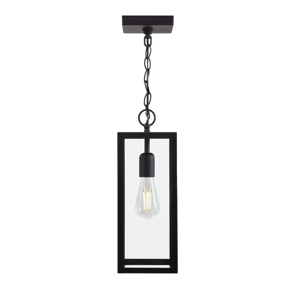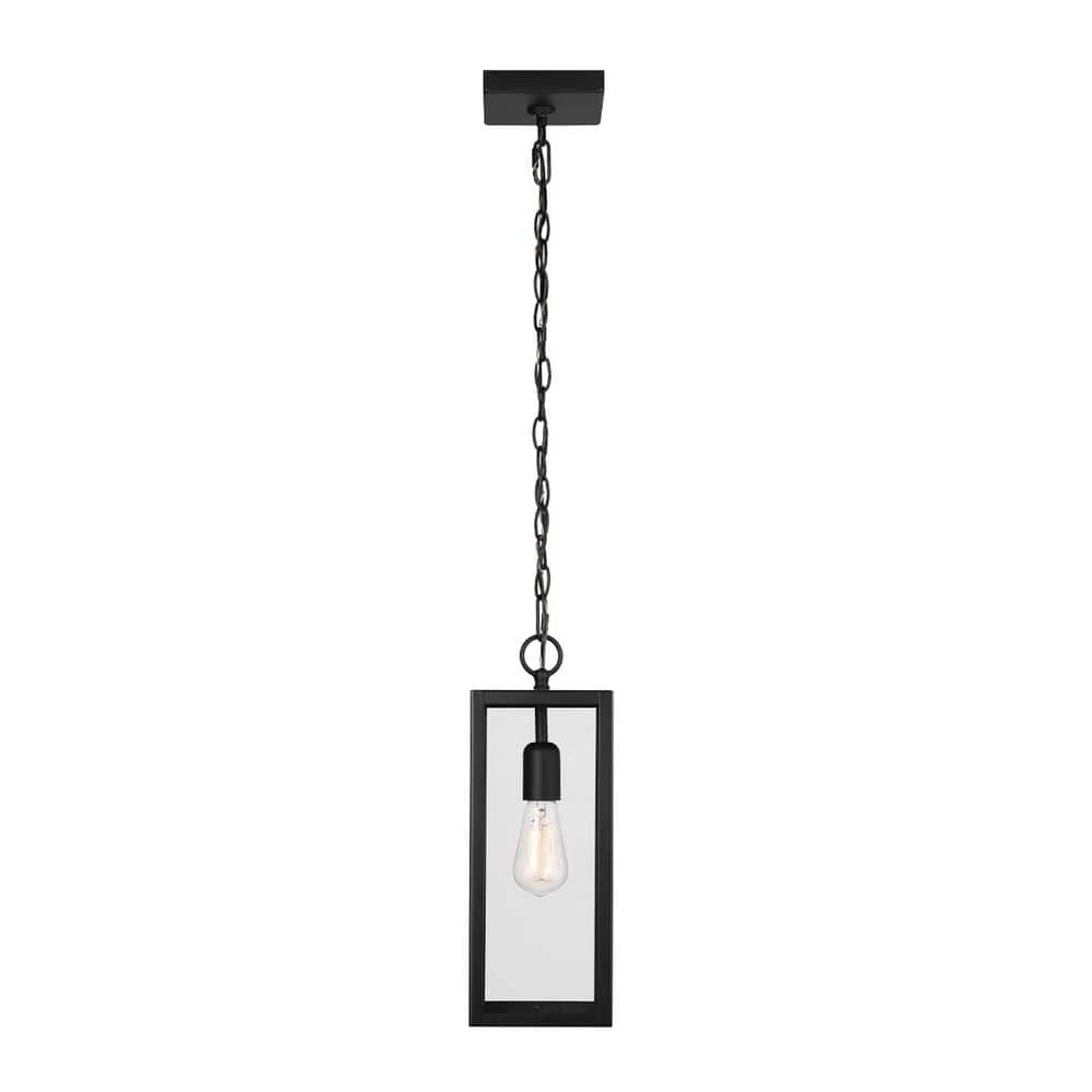 Straight lines and clear glass panels bring the Hampton Bay 1-Light Outdoor Pendant Light into the modern design world. A vintage-inspired bulb would add the right embellishment to make this piece truly a work of art. while the matte black finish complements all decor and showcases your bulb in just the right way. This light fixture has such clean lines you can use it indoors too!