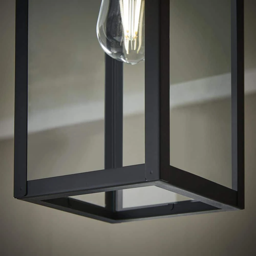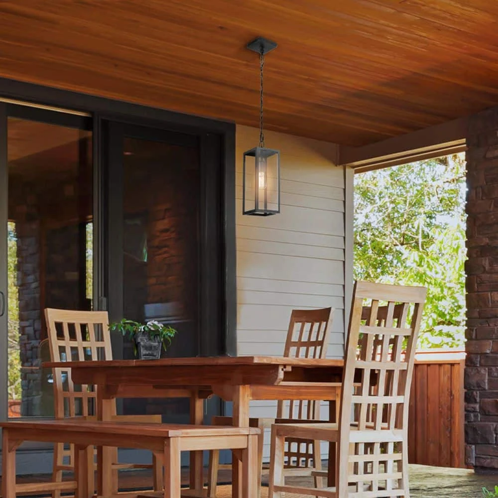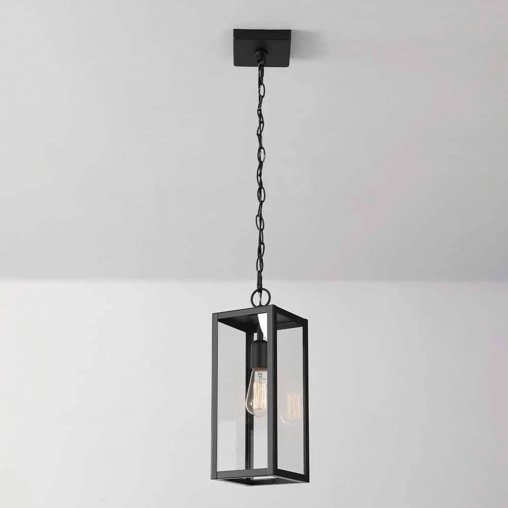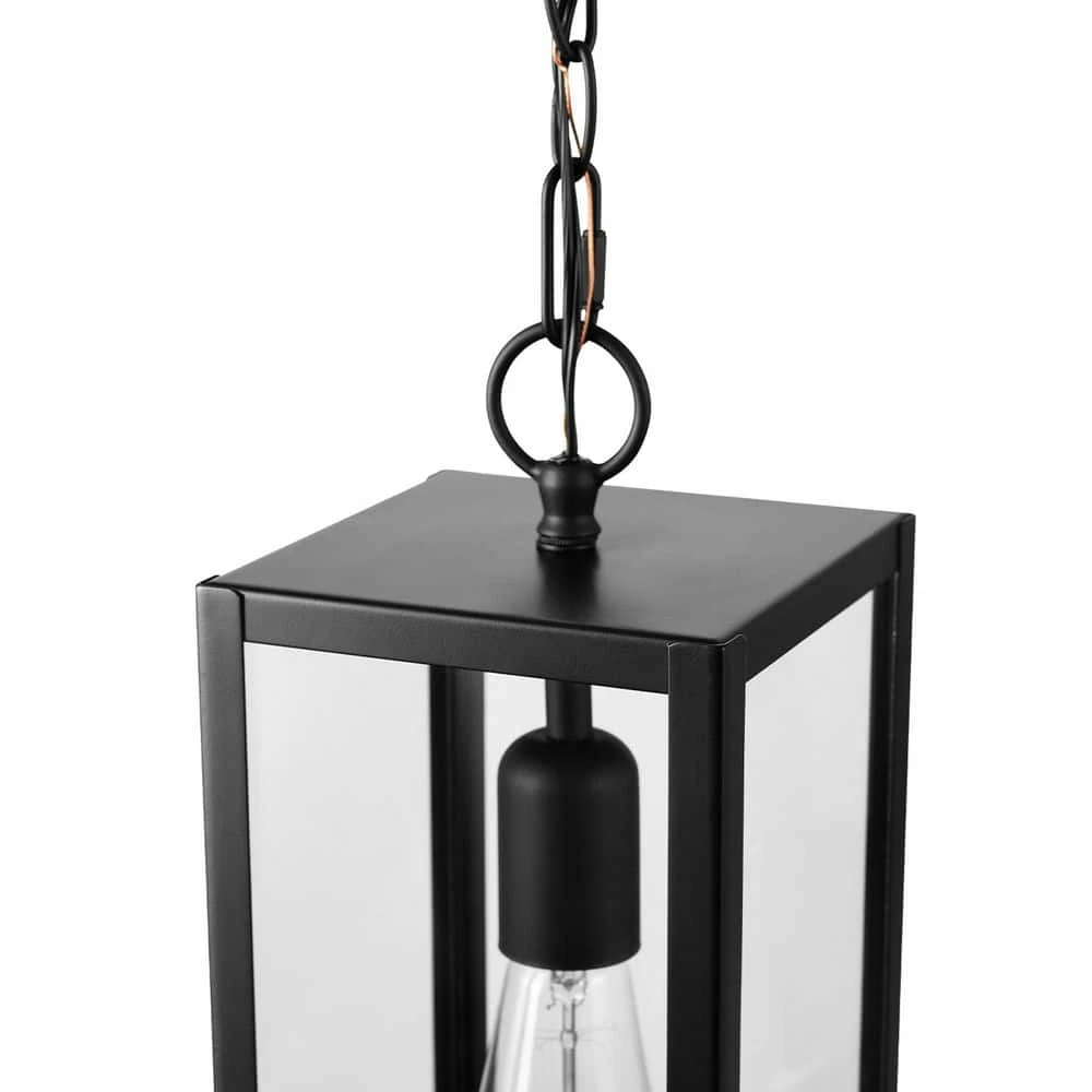Straight lines and clear glass panels bring the Hampton Bay 1-Light Outdoor Pendant Light into the modern design world. A vintage-inspired bulb would add the right embellishment to make this piece truly a work of art. while the matte black finish complements all decor and showcases your bulb in just the right way. This light fixture has such clean lines you can use it indoors too!