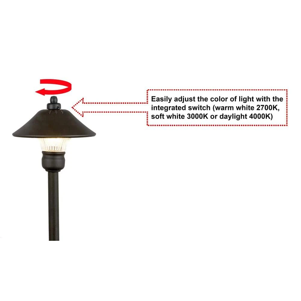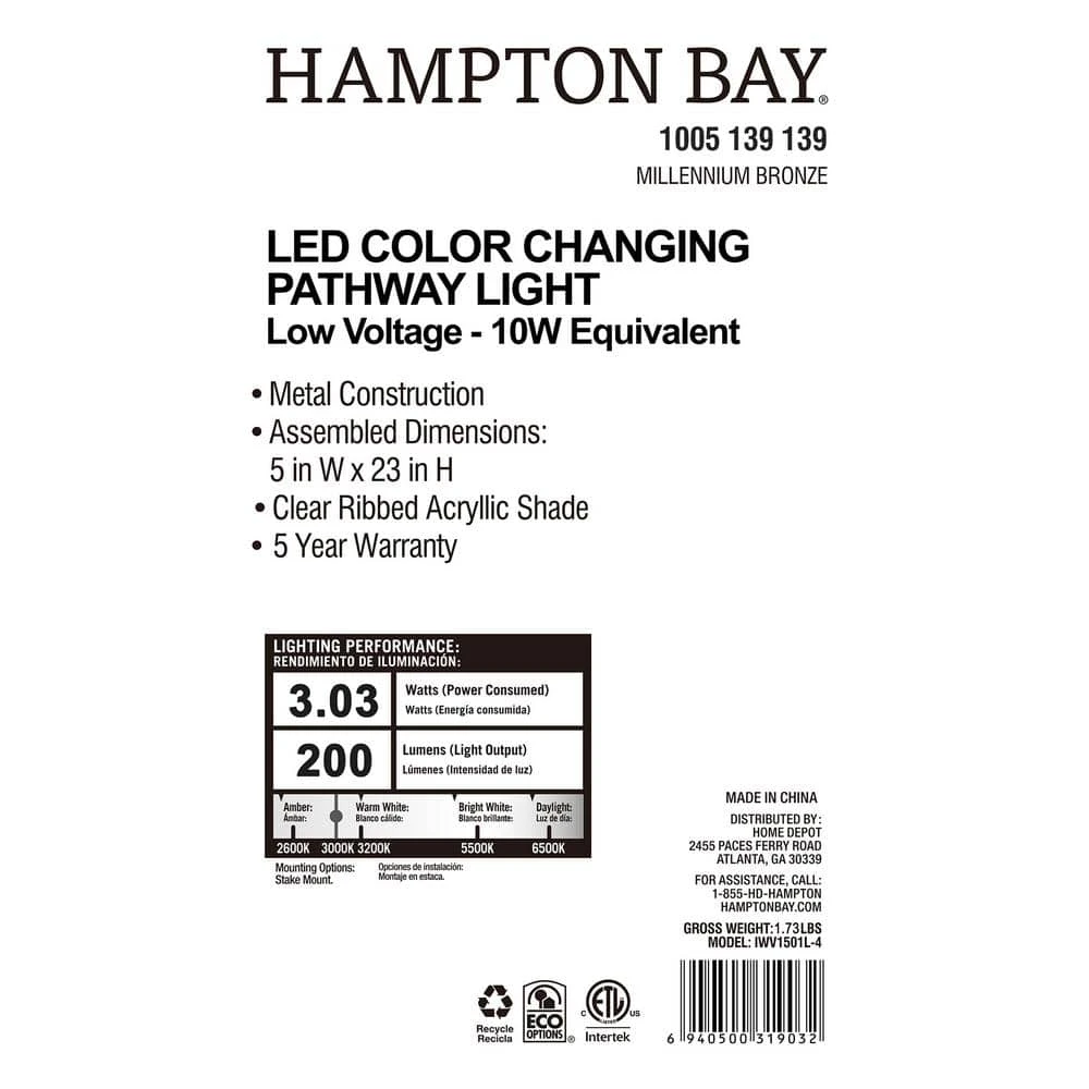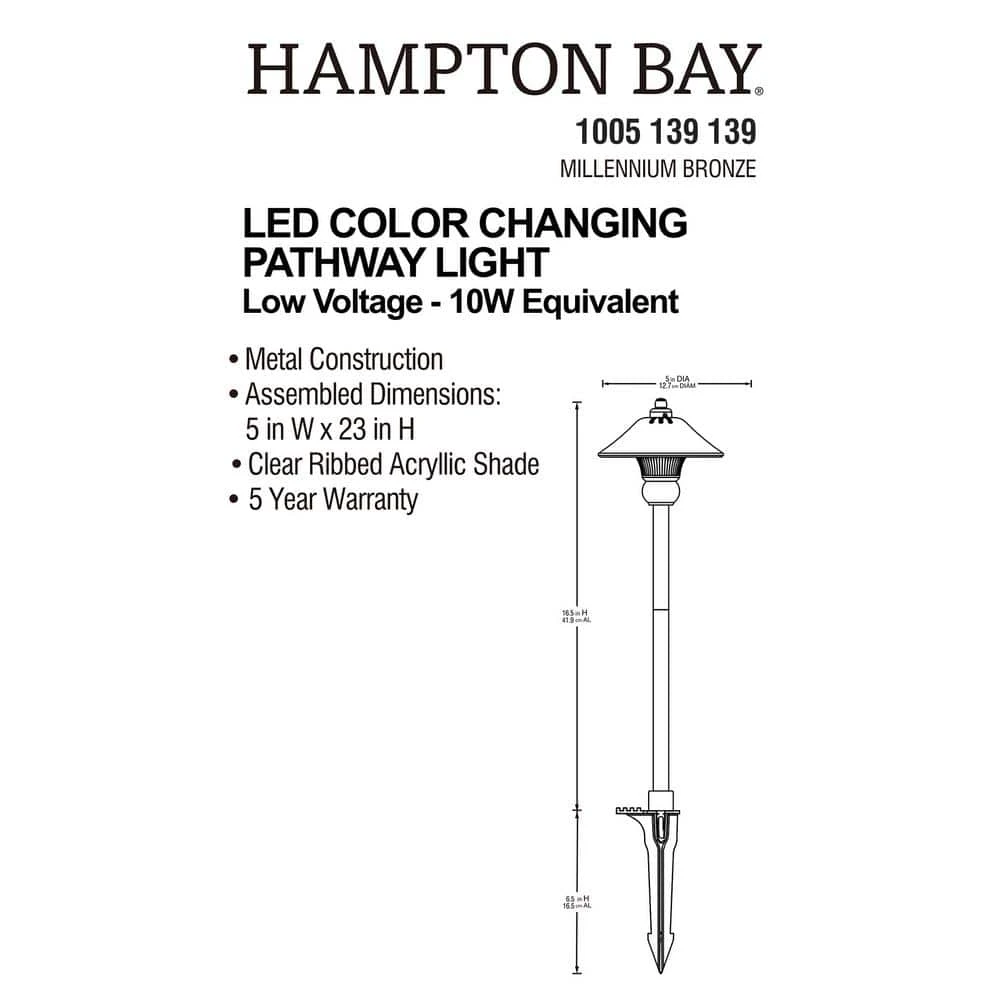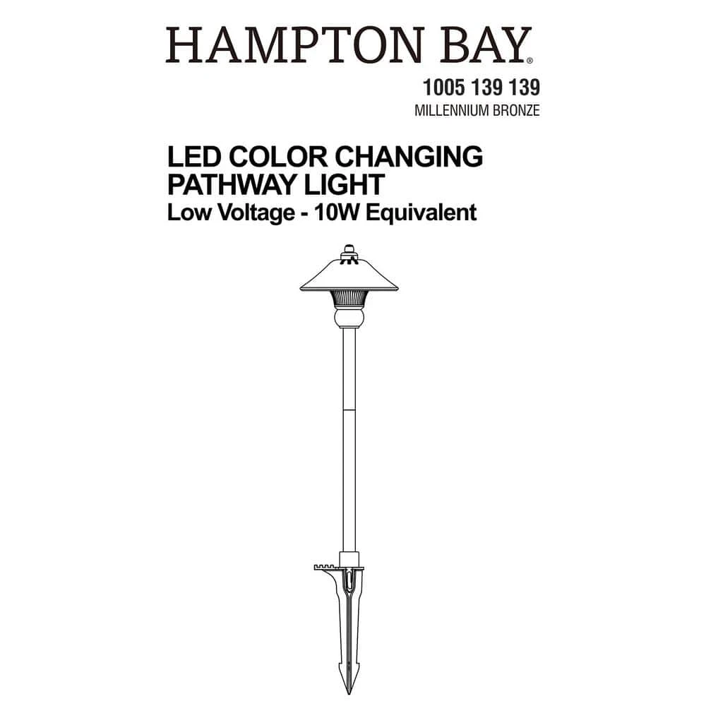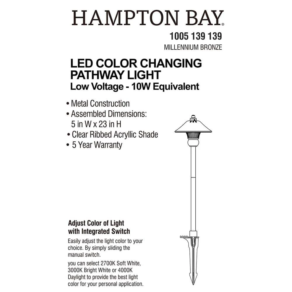 This Hampton Bay Low Voltage 10-Watt Equivalent LED Path Light offers the option of 3-light colors. The integrated switch rotates to choose from 2700K Warm White, 3000K Soft White or 4000K Daylight light color. On any of the 3-light color settings, it consumes over 80% less energy than a typical halogen light and has a rated life of 50,000-hours. The LED system provides maintenance free operation and there are no bulbs to change. The quick-install wire connector means easy do-it-yourself installation that is quick and safe. This fixture’s light is directed toward the ground, creating a beautiful pattern of soft light that can illuminate steps, pathways and smaller plants, offering a valuable outdoor security feature for your home.