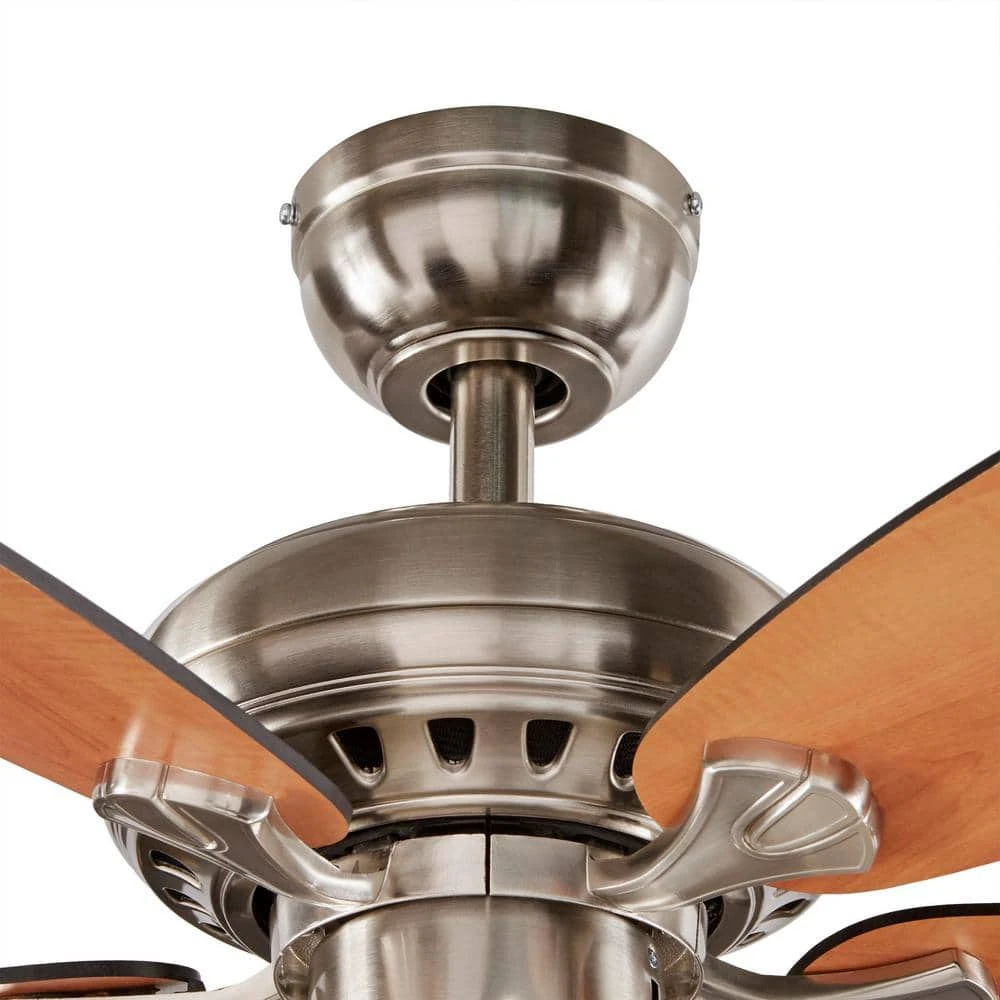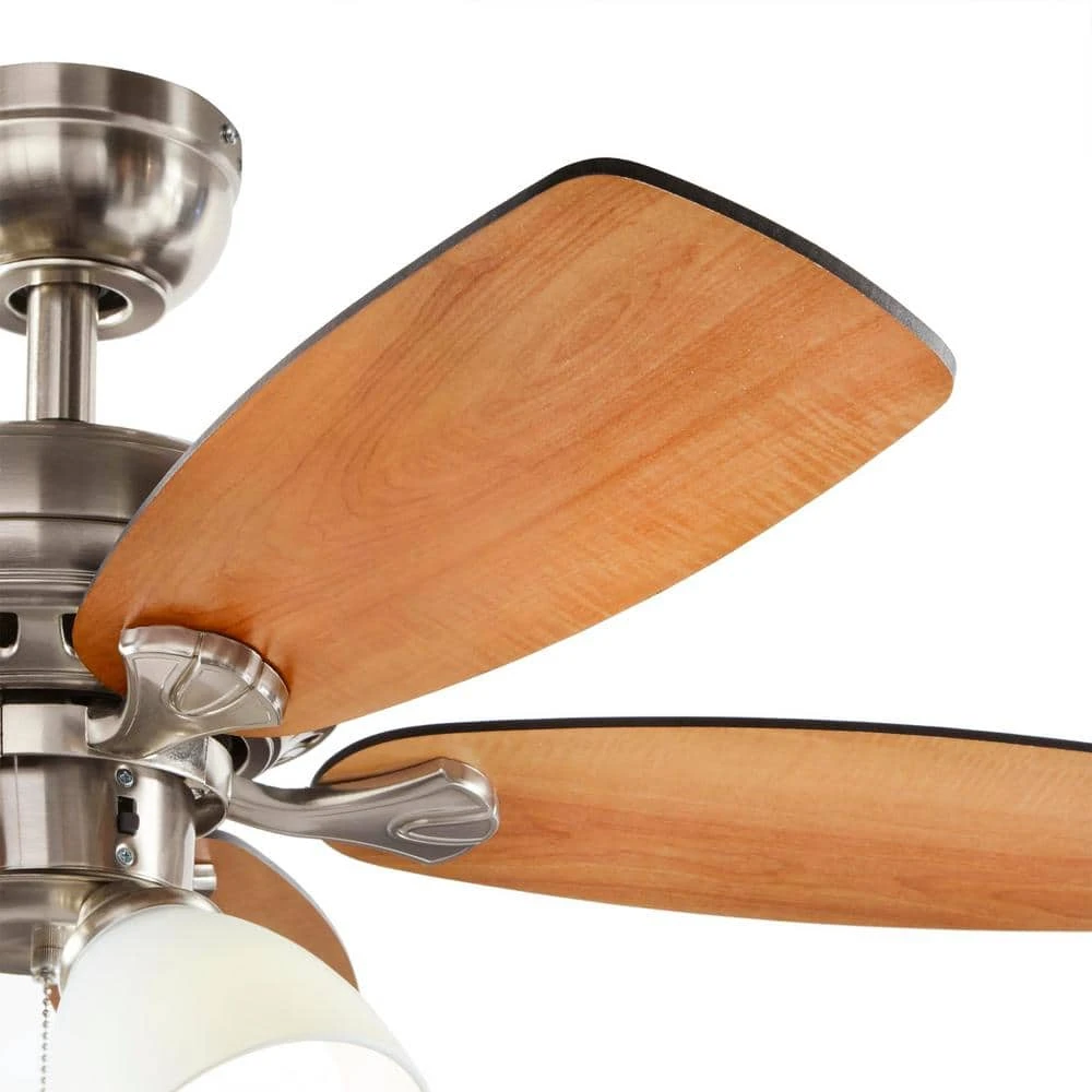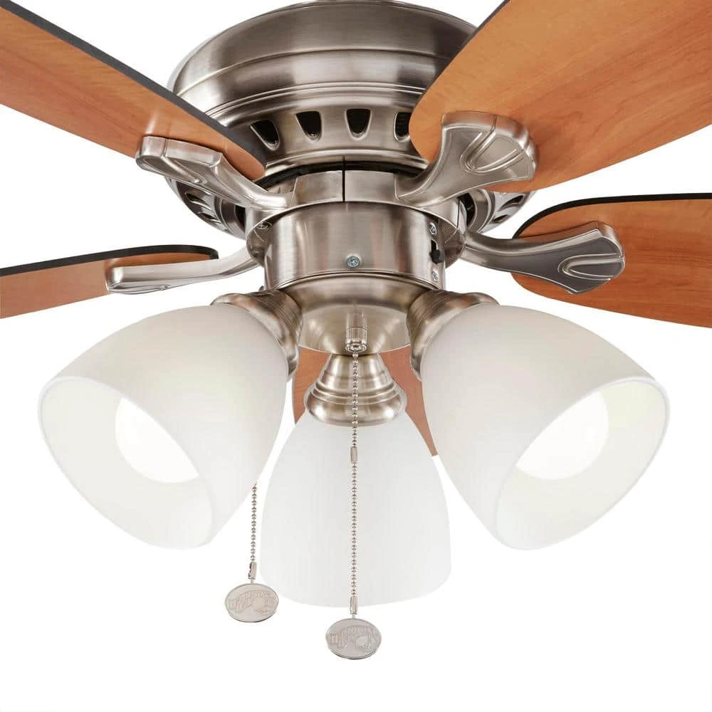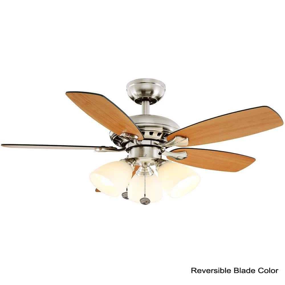 The traditional style ceiling fan offers a great solution to any small room. It features 5 reversible blades in a matte black or maple finish, complemented by a brushed nickel finish. The tri-mount installation offers versatility, and the three-speed, pull-chain design helps circulate air briskly for a comfortable environment. The fan includes three bulbs for nice lighting and can be installed easily with the quick-install blades feature.