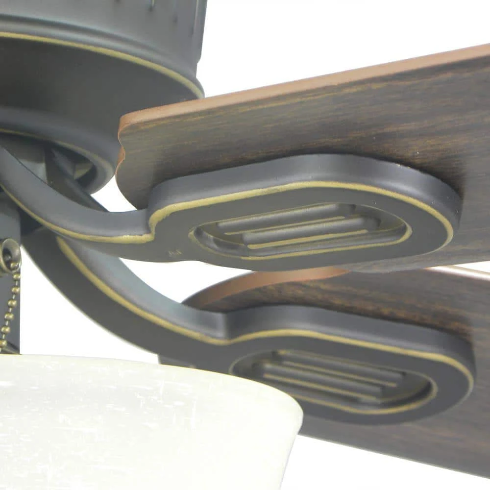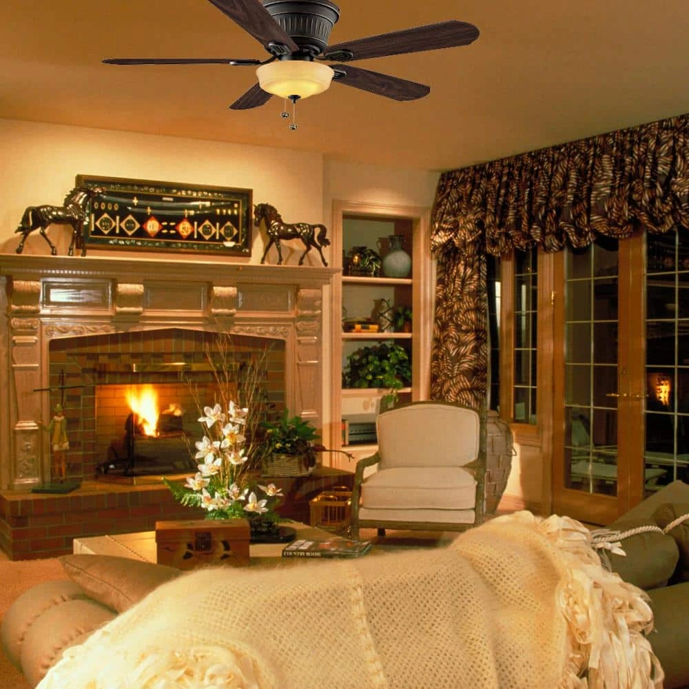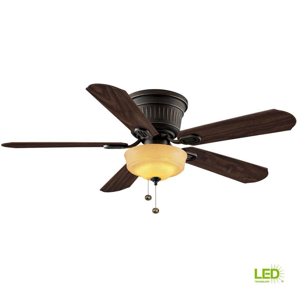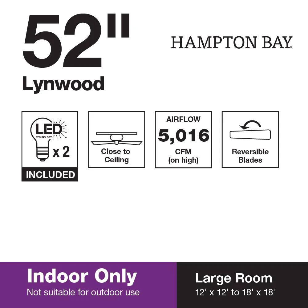 Add a touch of style to a low-ceiling room with the Hampton Bay Lynwood 52 in. Oil Rubbed Bronze Ceiling Fan. A stylish way to increase air circulation in any room, the Lynwood features a handsome, oil-rubbed bronze finish and five reversible rosewood/walnut blades that provide versatile decor options. A 2-light kit includes a Beige Linen bowl-shaped glass and two 9.5-Watt LED bulbs (included) to provide ample lighting.