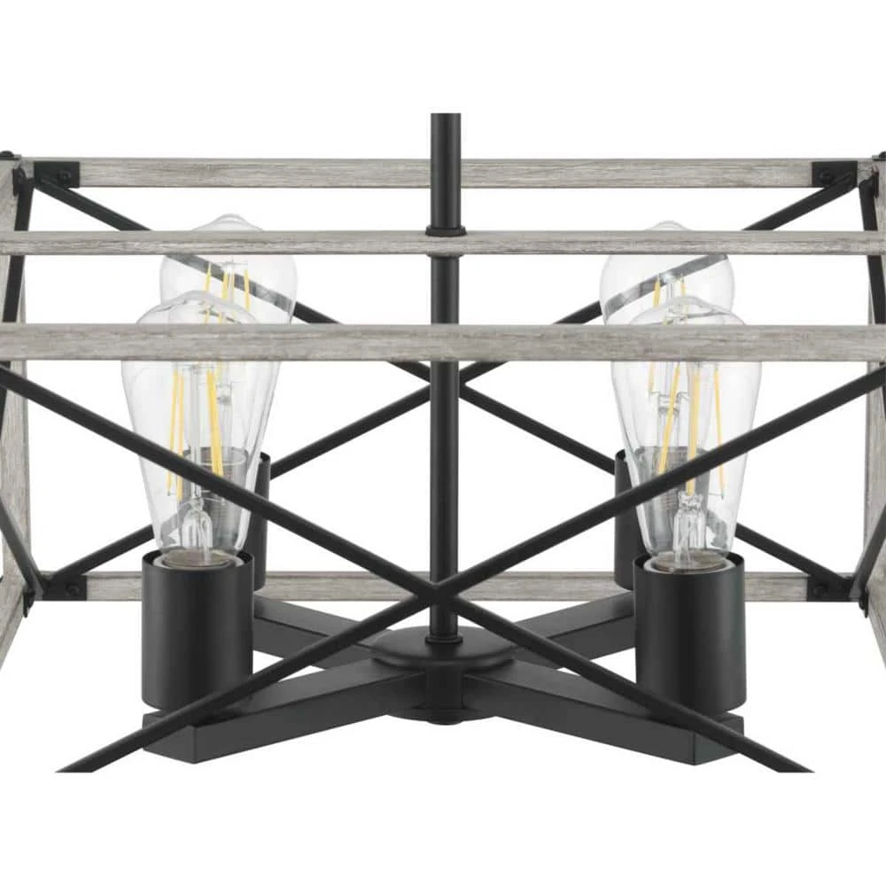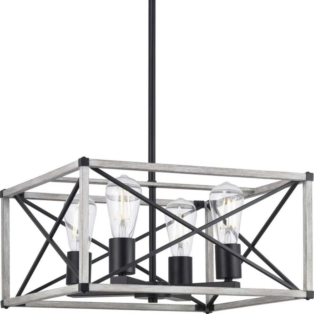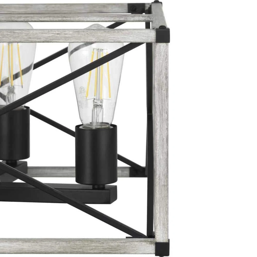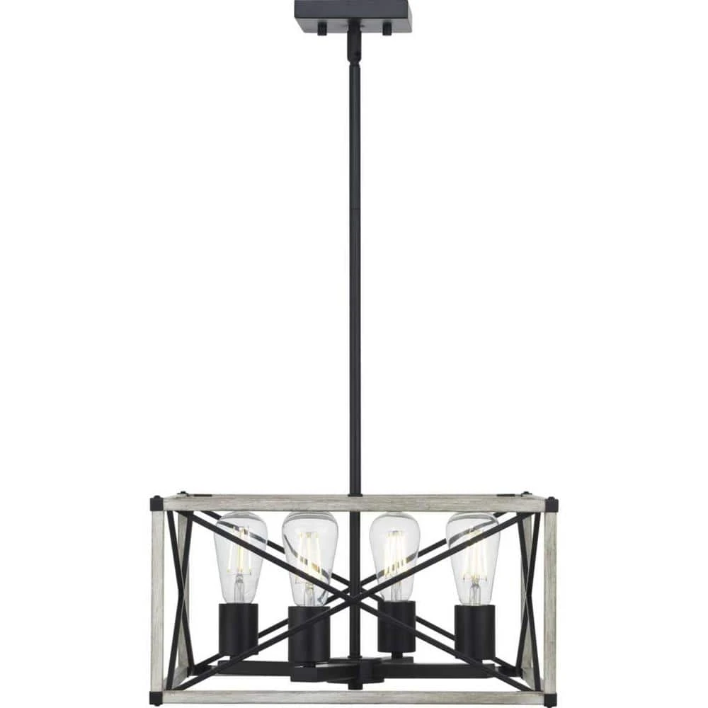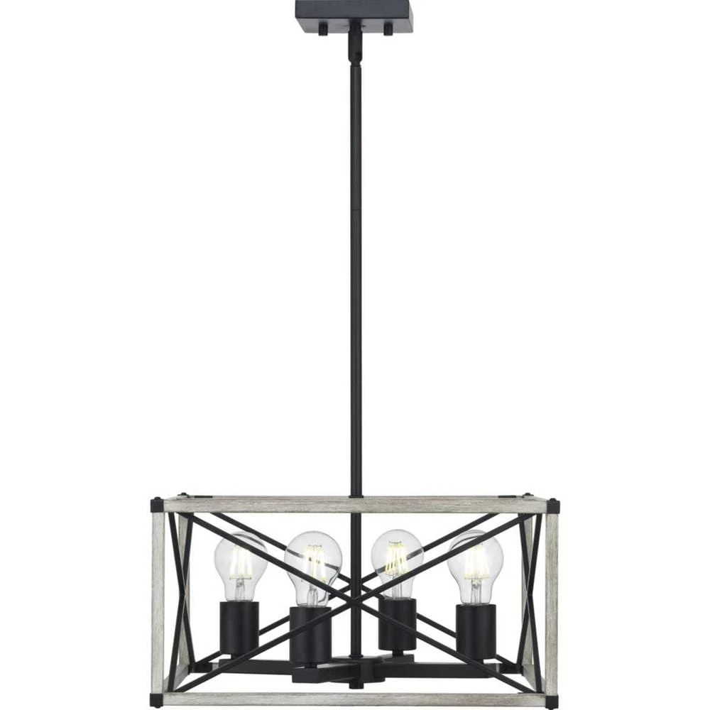 Incorporate a farmhouse-inspired lighting experience with the Madison Landing 4-Light Pendant. A rectangular frame is coated in a matte black finish with rustic washed white wood accents for an organic aesthetic. Signature X-brace designs inspired by country barn doors adorn each side of the chandelier’s frame.