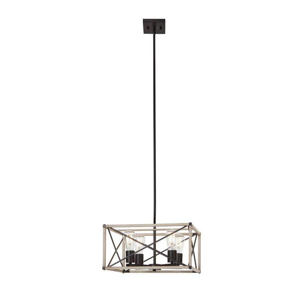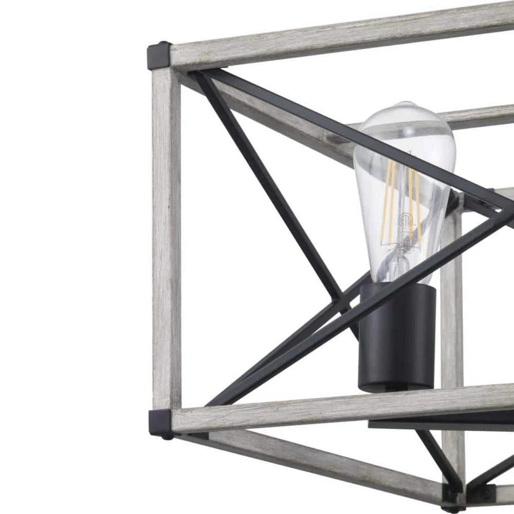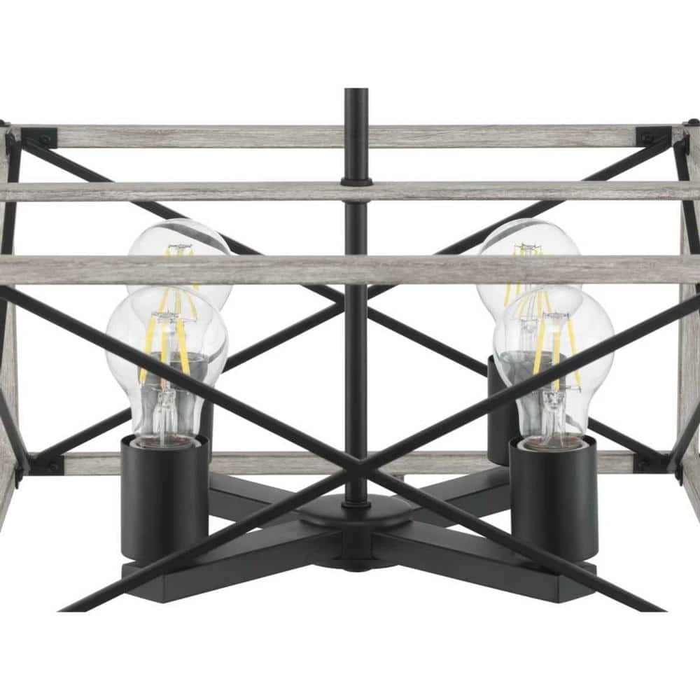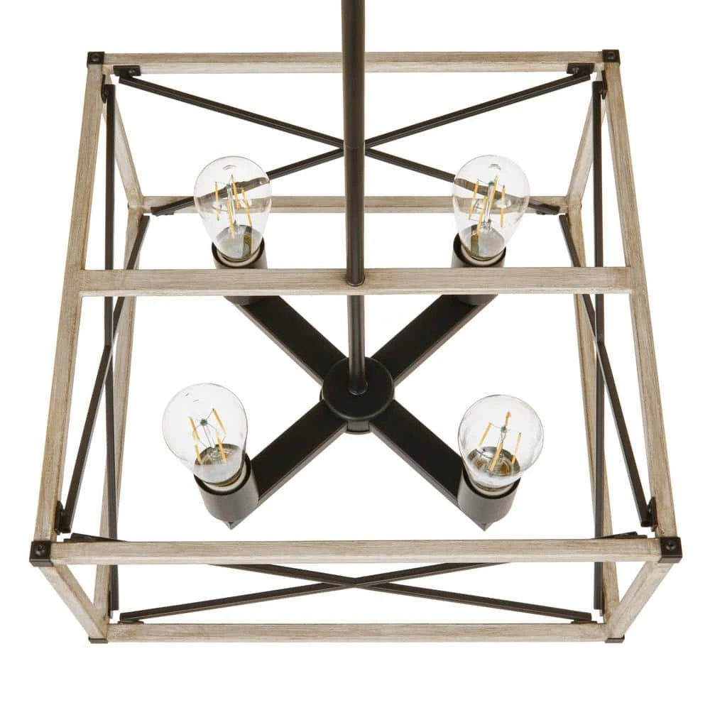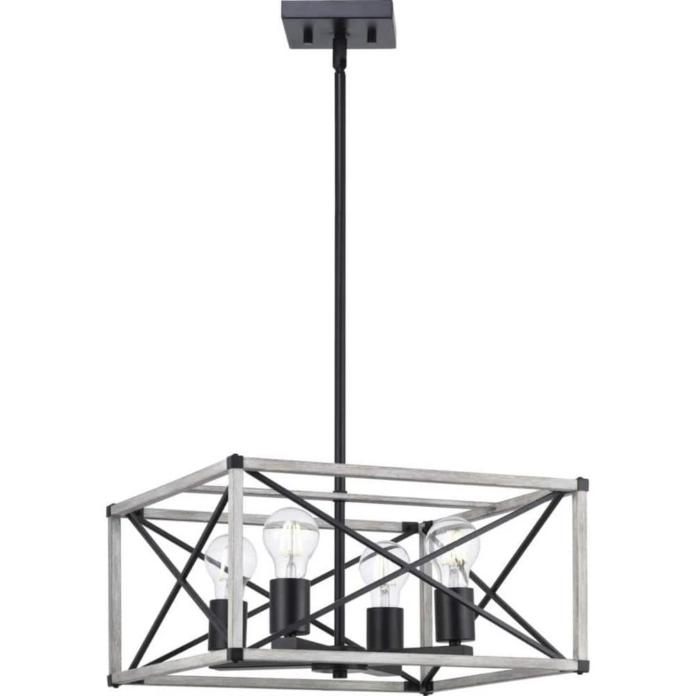 Incorporate a farmhouse-inspired lighting experience with the Madison Landing 4-Light Pendant. A rectangular frame is coated in a matte black finish with rustic washed white wood accents for an organic aesthetic. Signature X-brace designs inspired by country barn doors adorn each side of the chandelier’s frame.