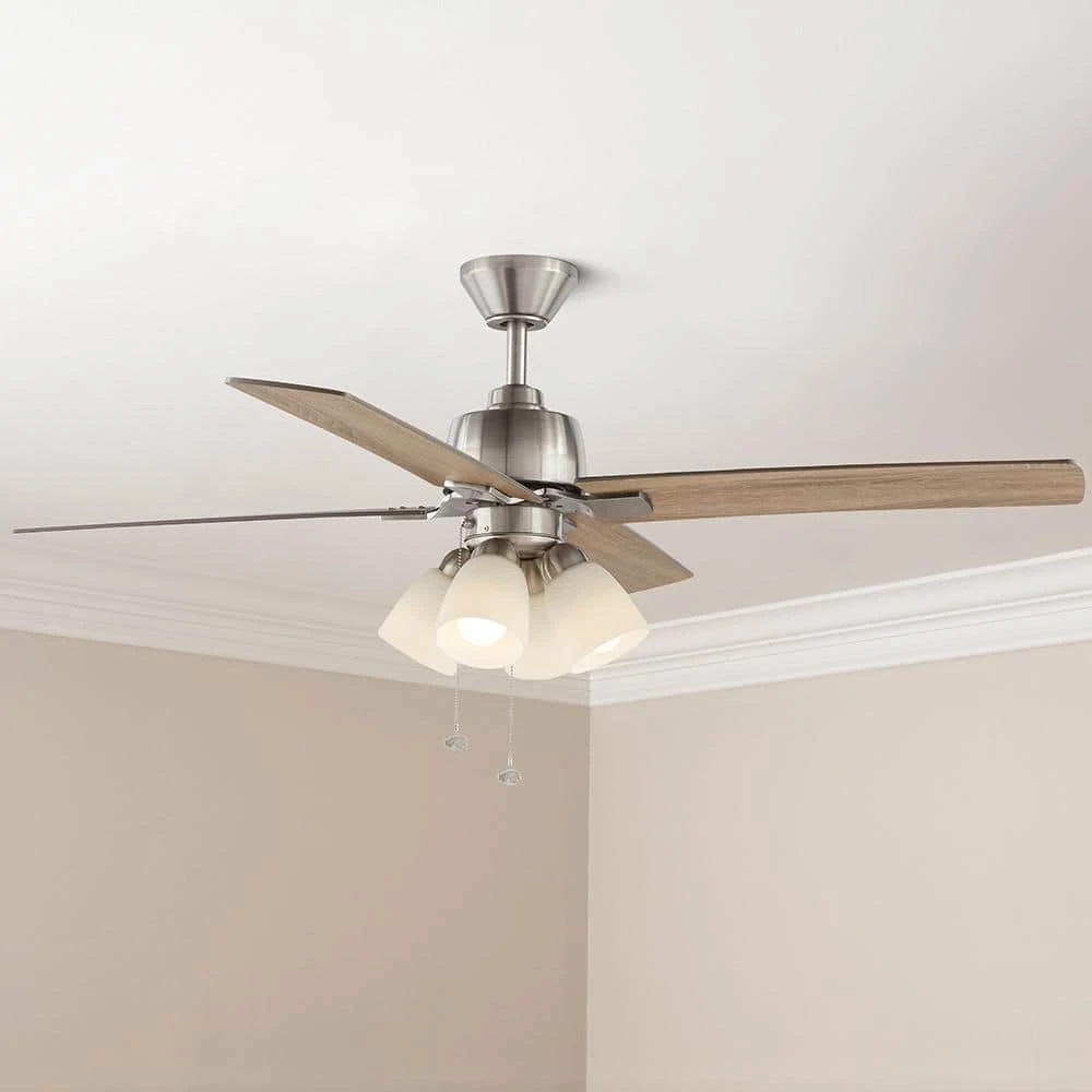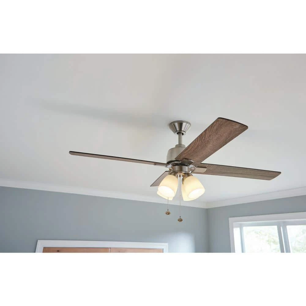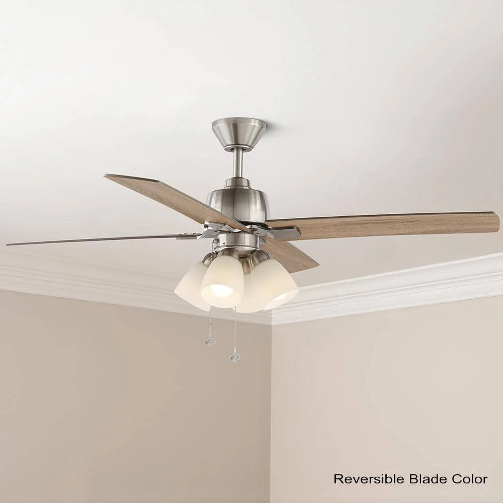 The Hampton Bay 54 in. Malone fan offers dependable performance and beautiful styling to enhance your indoor living space. The fan’s attractive brushed nickel finish is complemented with frosted glass shades and four reversible blades in seasoned wood and espresso finishes to blend with many of today’s indoor decor trends. The Malone features a 3-speed reversible motor for year-round comfort and a 4-light light kit to produce ample illumination. The light kit uses four 9-Watt LED bulbs (included).