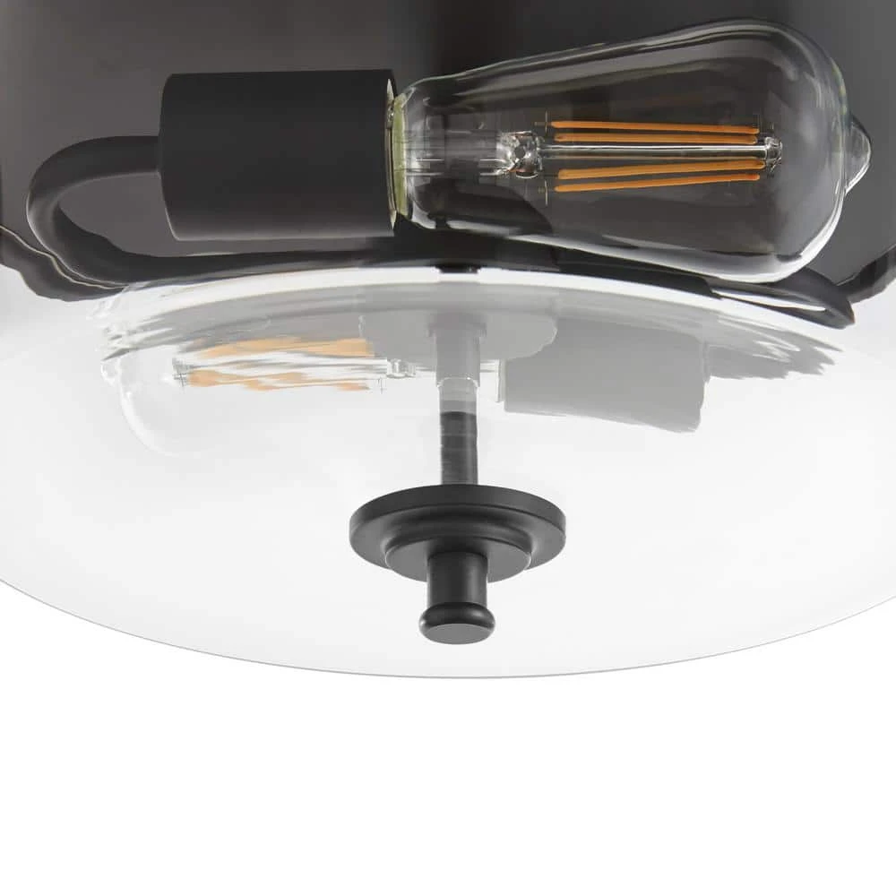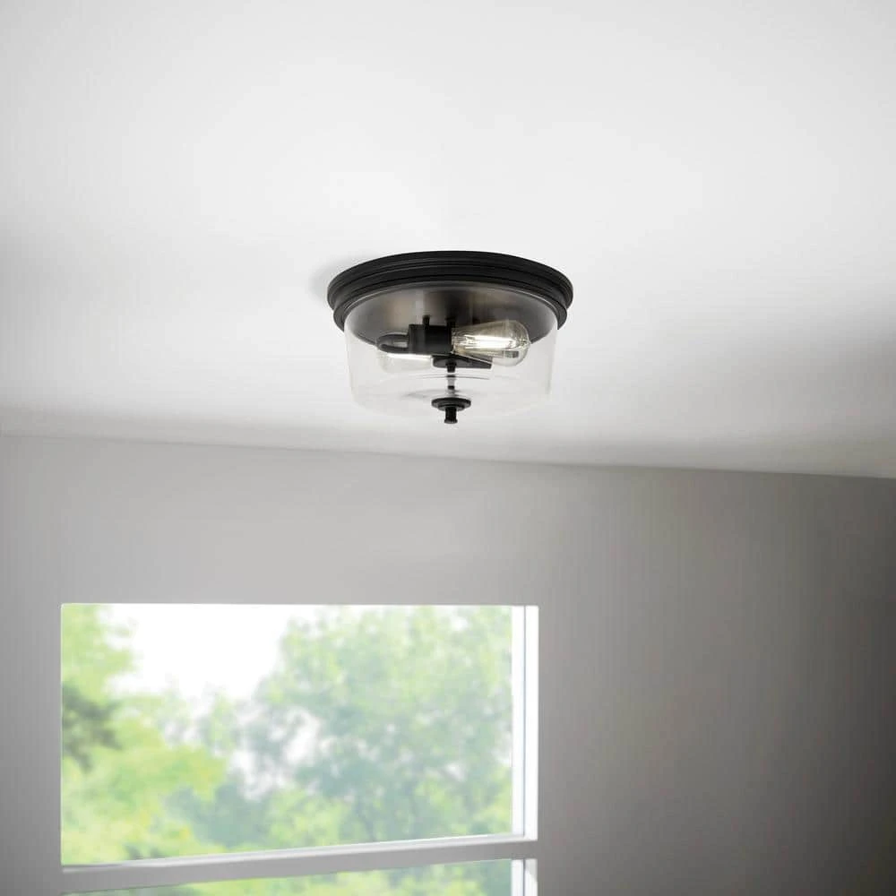 Freshen up a variety of spaces in need of illumination with the simple silhouette of the Manor 2-Light Flush Mount. A durable Matte Black finish provides for a clean, classic appearance. A clear glass shade softens the design ever so slightly and allows the 2-light bases nestled within to share their welcoming glow with space below.