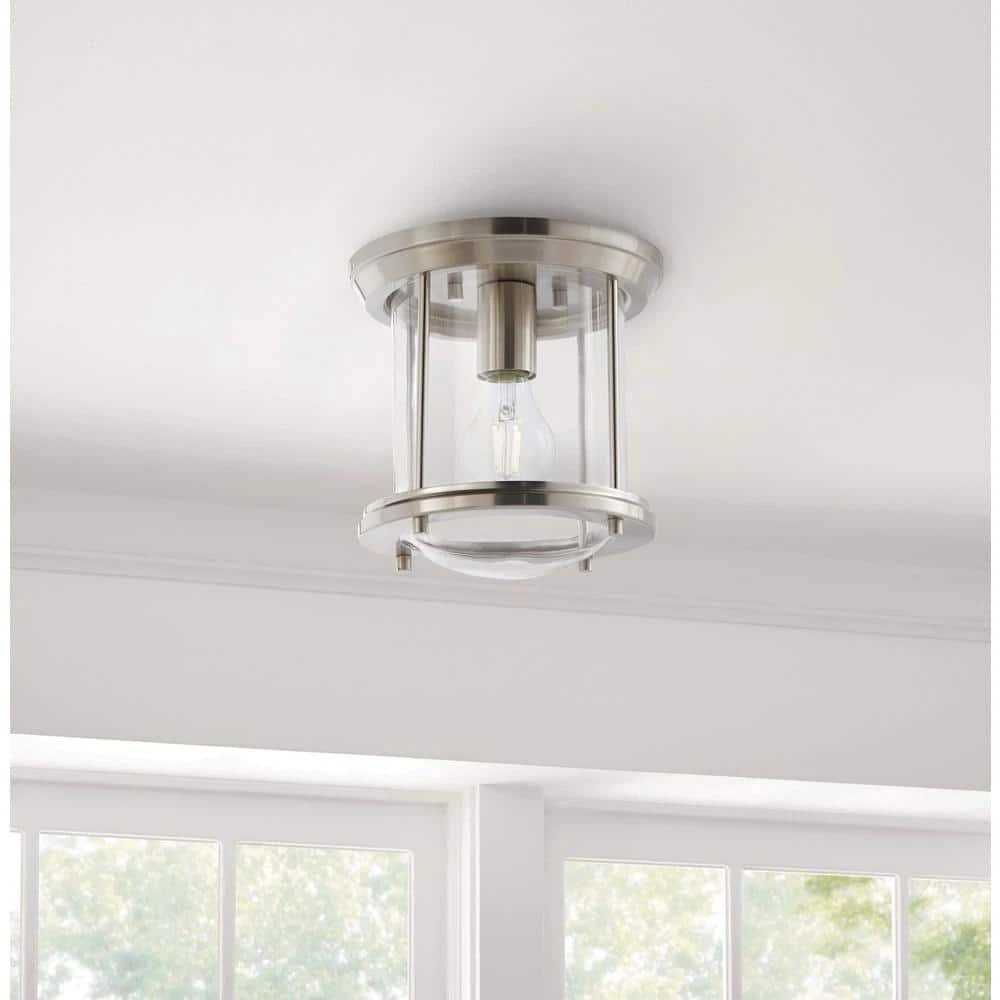 With its solid brushed nickel finish, this ceiling light will be the star of your room. The oversized clear shade highlights the vintage style bulb. Hardware included for easy installation. This ceiling light is designed for dining areas, nooks, sitting areas, living rooms, bedrooms, hallways, entryways.