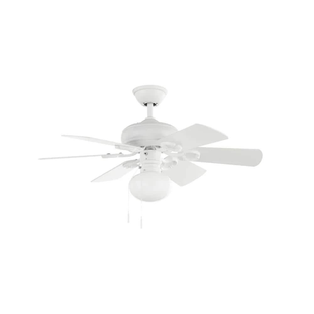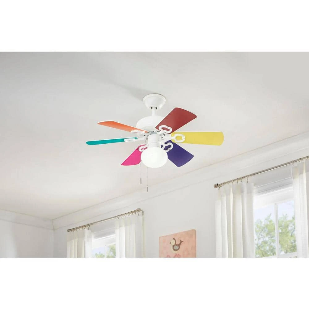 This white small ceiling room fan by Hampton Bay features 6-reversible blades in matte white and multiple solid colors, you can choose the style you want to decorate small rooms up to 10 ft. x 10 ft. Boasting a motor with quiet operation, this fan offers 3 speeds and a reverse direction function. Its light fixture is covered by a dome-style opal glass shade that houses 1 provided 9-Watt LED bulb.