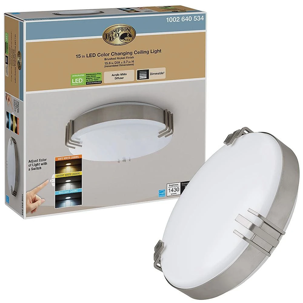 Mission is a style of furniture that originated in the late 19th century as a popular manifestation of the American arts and crafts movement. This style is best known for geometric lines and flat panels. Hampton Bay’s 4 ft. Round Brushed Nickel LED Flush Mount Ceiling Light features a cross between Mission style and Industrial finish showcasing a simple Brushed Nickel border and vertical line accents. Emits 1430 Lumens of brightness using only 22-Watts of electricity. The LED technology ensures long-lasting, energy-efficient service with no bulbs to replace. Ideal for large kitchen, laundry room, garages, basements, hallways, dressing rooms, retail stores, waiting rooms or offices.