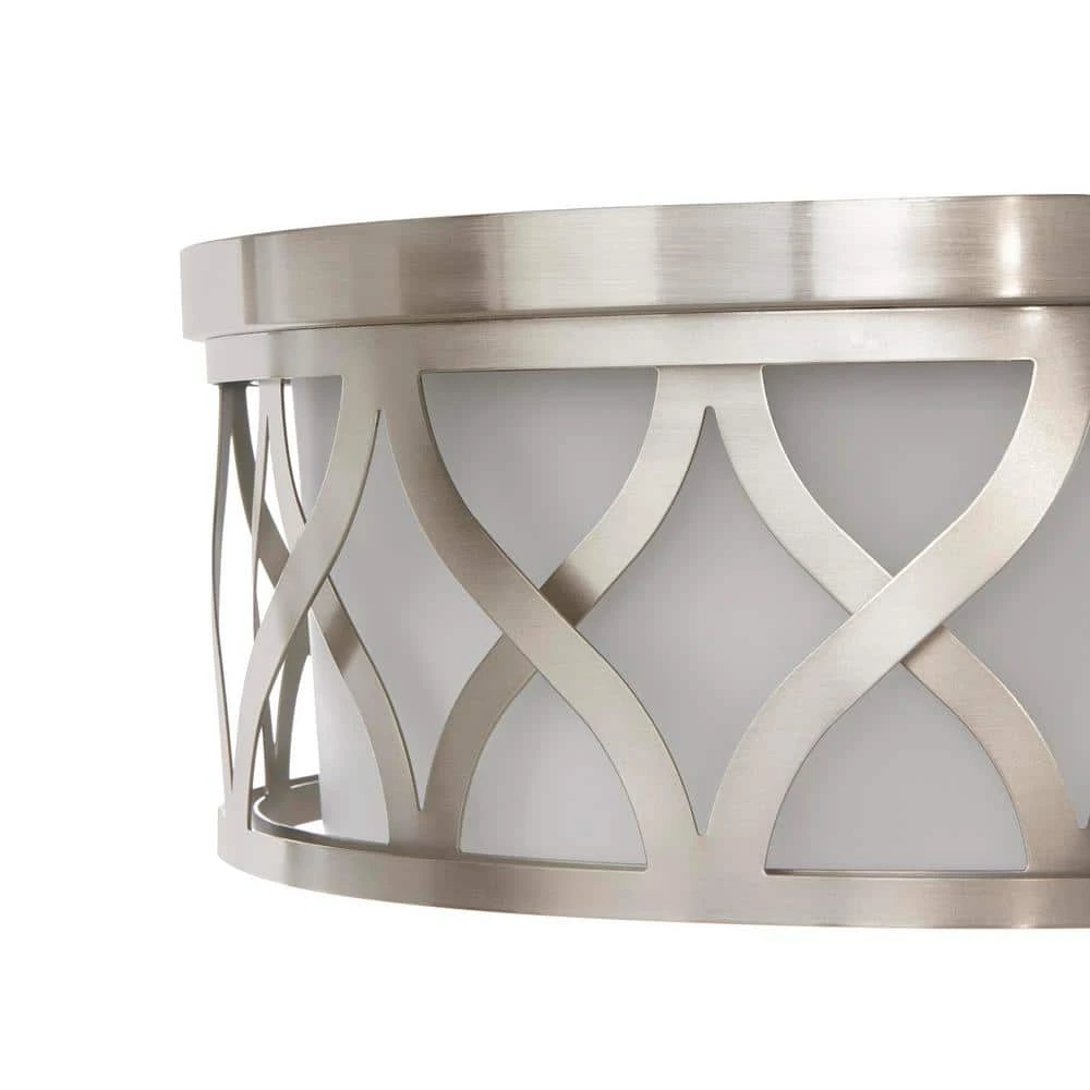 This 3-Light Flush mount features an interesting geometric pattern that has a graphic feel without overpowering the space. with It is Brushed Nickel finished frame and Etched White glass shade, the light gently diffuses with a touch of class. This flush mount is an elegant addition sure to add a little glitz to any room.