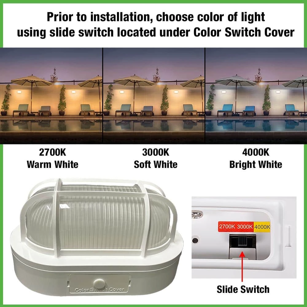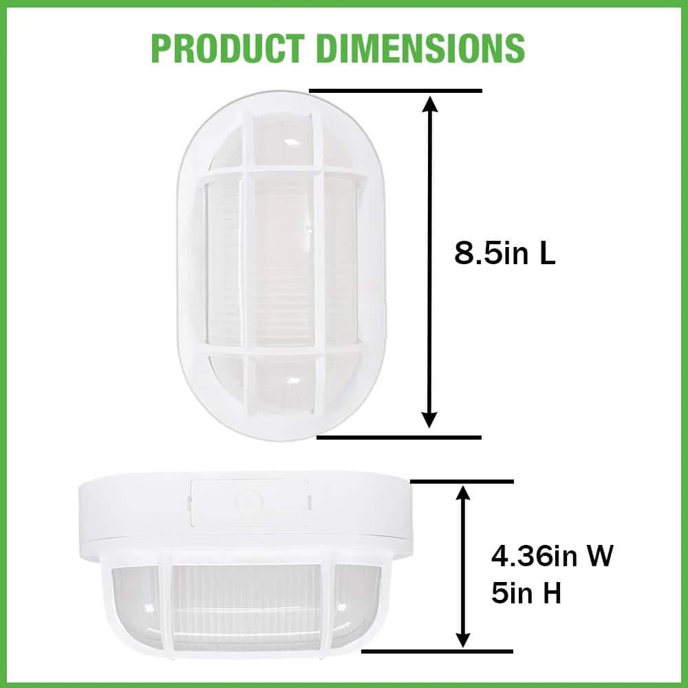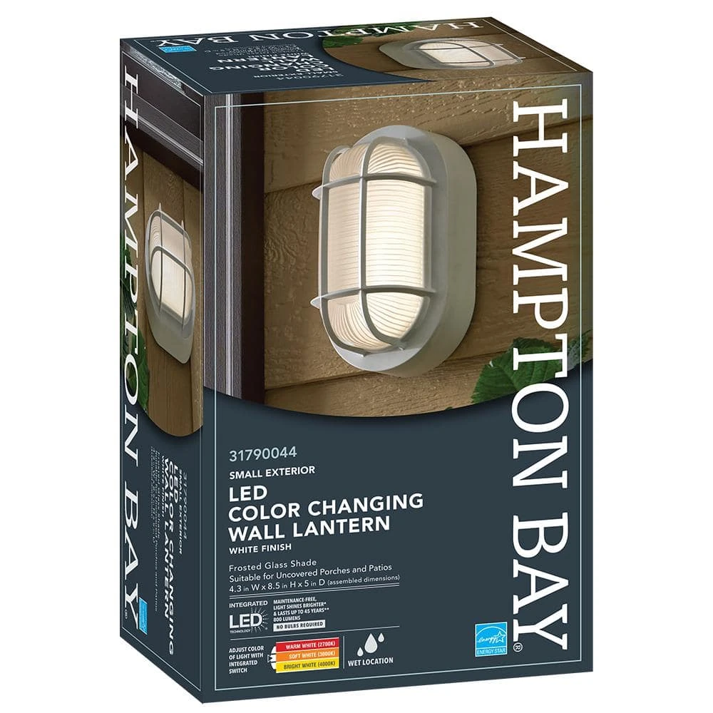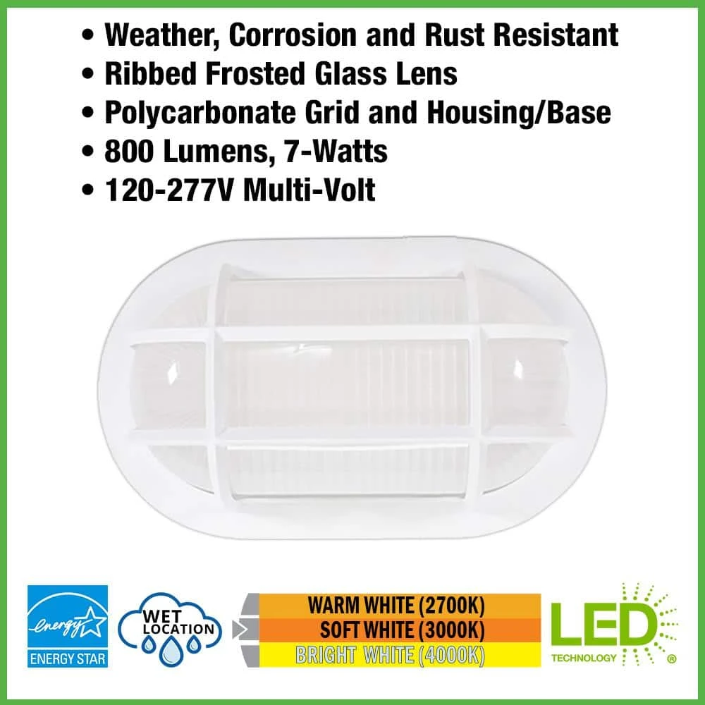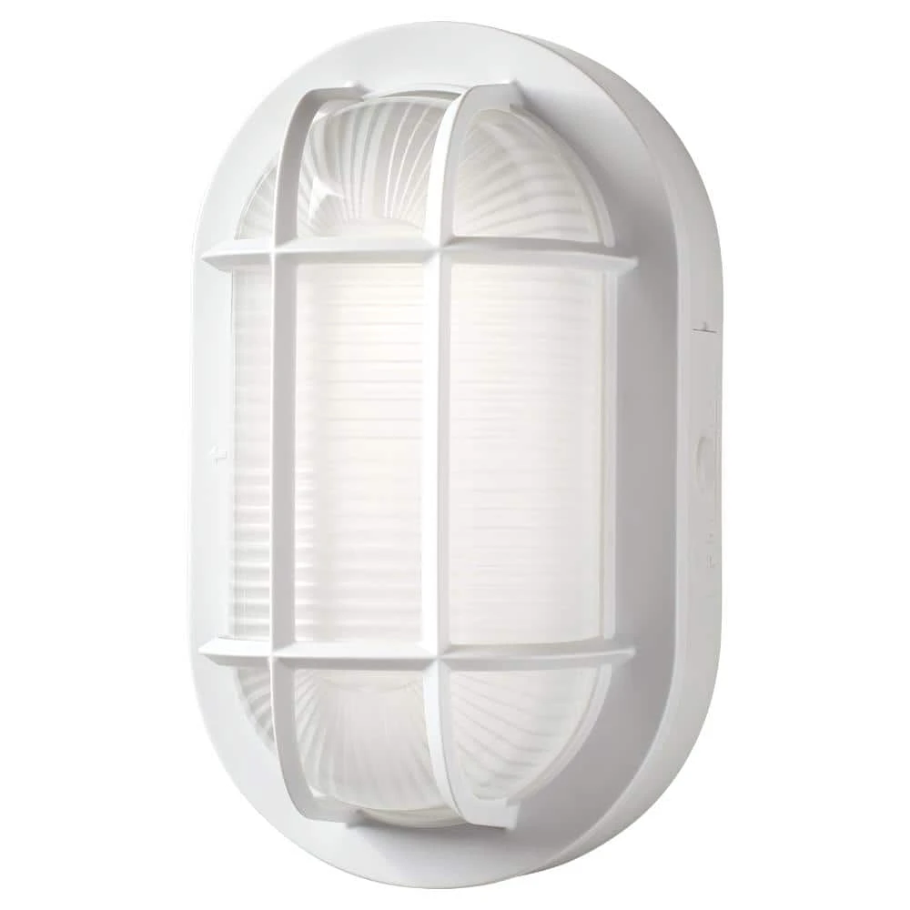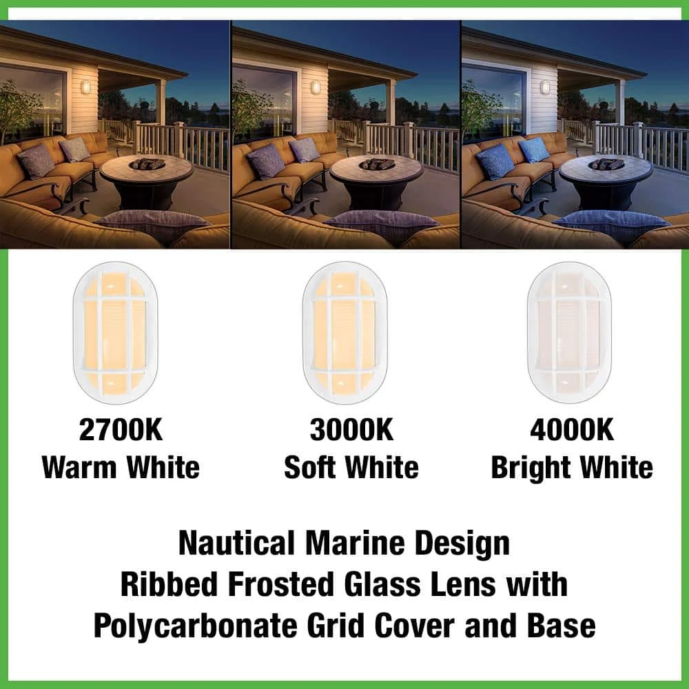 Hampton Bay Nautical Coastal 8.5in Oval LED Outdoor Bulkhead light is versatile, durable and made to withstand anything Mother Nature can deliver. With ribbed frosted glass lens and polycarbonate grid and housing/base, this fixture starts reliably even in unconditioned applications with sub-zero temperatures all the way down to -40°F! This light replaces outdated yellowing incandescent or halogen lights with high quality energy-efficient integrated LEDs. Prior to installation, choose between 3 color temperatures of light output: Warm White, Soft White or Bright White for security or accent lighting. With our superior long-lasting light engine, this bulkhead light offers maintenance free service with no bulbs to replace. Our weather resistant bulkhead light is the ideal solution to combat even the harshest weather, yet seamlessly compliments any entryway, porch, patio, deck, dock or walkway.