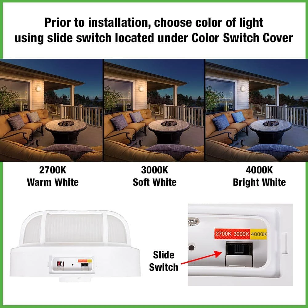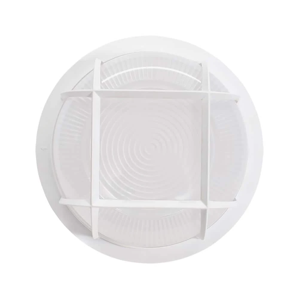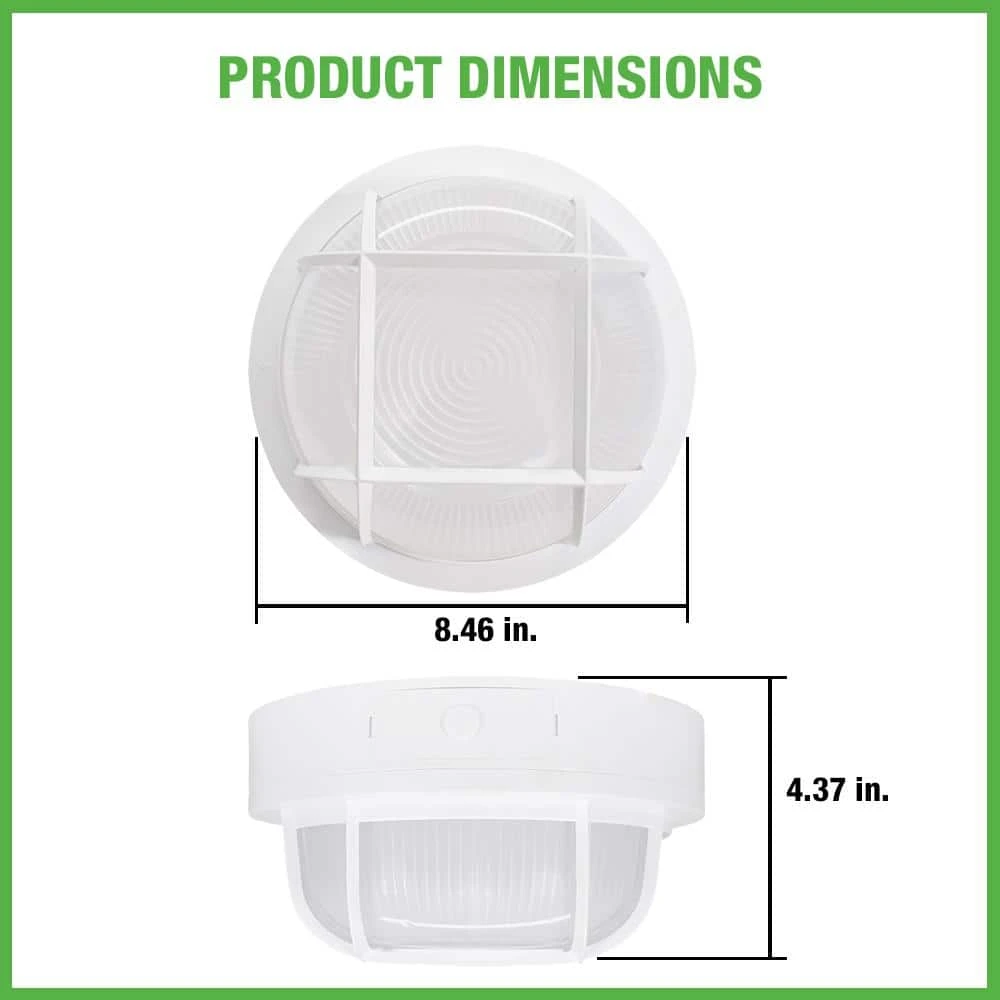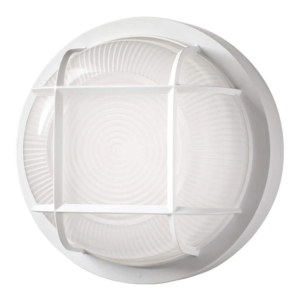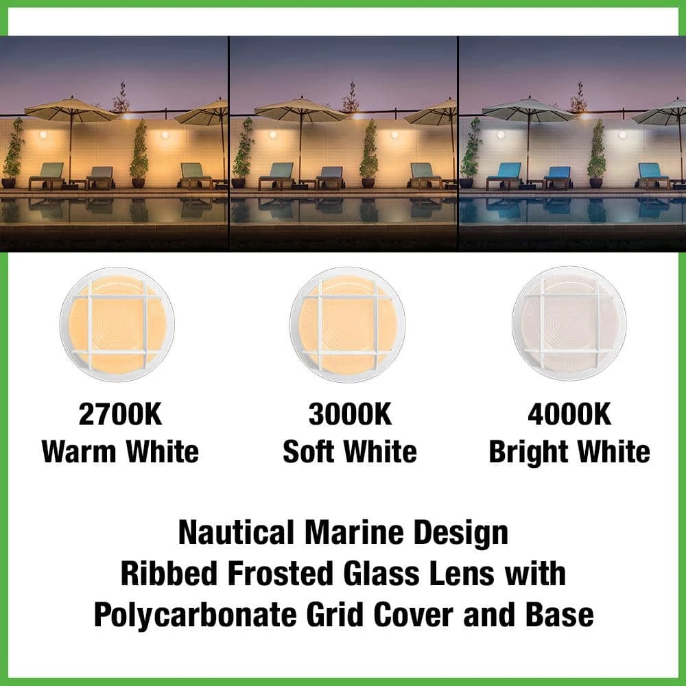 Hampton Bay Nautical Coastal 8.5in. Round LED Outdoor Bulkhead light is versatile, durable and made to withstand anything Mother Nature can deliver. With ribbed frosted glass lens and polycarbonate grid and housing/base, this fixture operates reliably in extremely frigid temperatures all the way down to -40°F! Prior to installation, choose between (3) color temperatures of light output: Warm White, Soft White or Bright White for security or accent lighting. This light replaces outdated yellowing incandescent or halogen lights with high quality energy-efficient integrated LEDs and is maintenance free with no bulbs to replace for up to 50,000 hours. Our weather resistant bulkhead light is the ideal solution to combat even the harshest weather, yet seamlessly compliments any entryway, porch, patio, deck, dock or walkway.