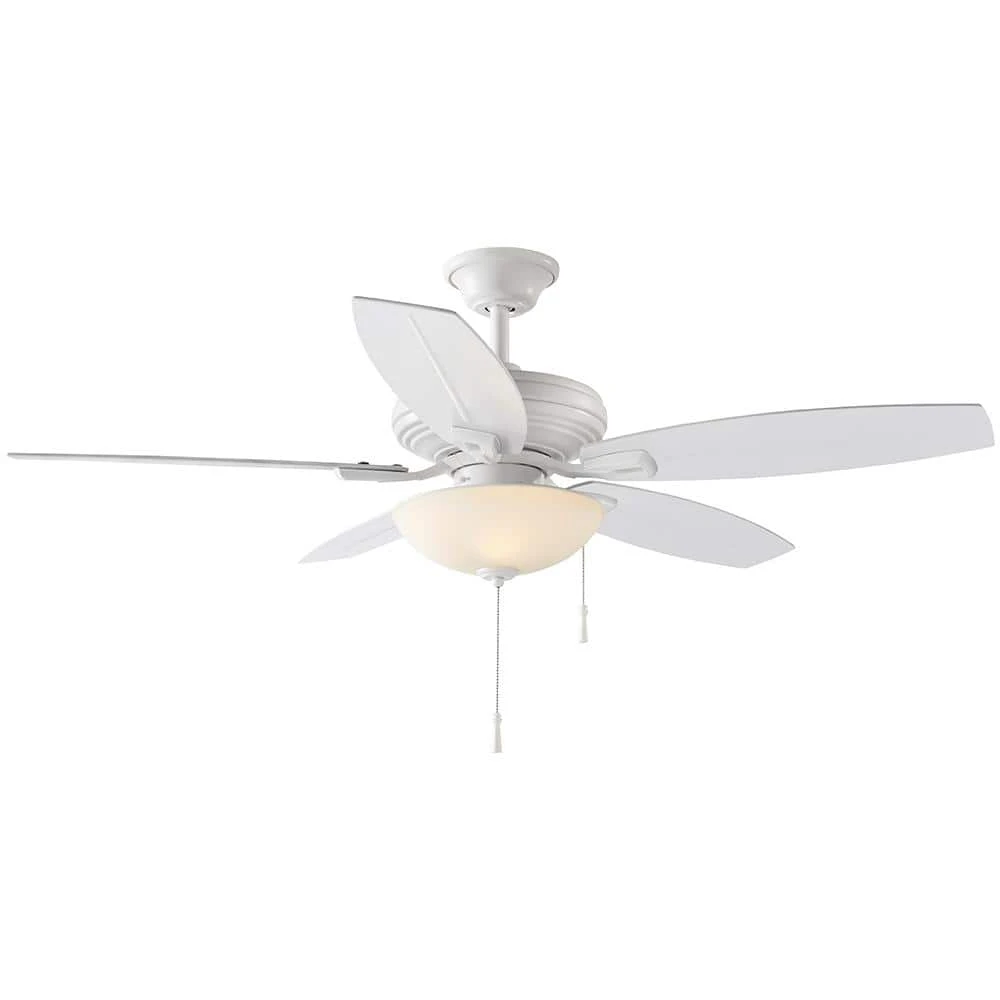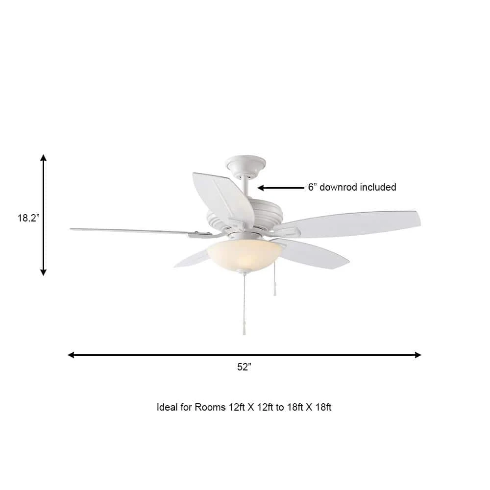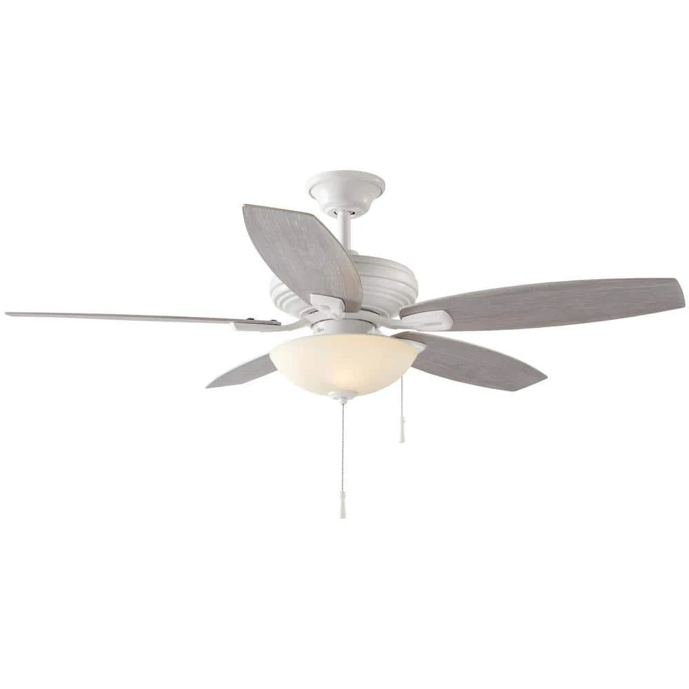 The Hampton Bay 52 in. North Pond outdoor ceiling fan is designed to enhance your outdoor living spaces and withstand the outdoor elements. This wet rated fan can be installed in any outdoor setting and will complement many of today’s outdoor decor trends. The powerful 3-speed reversible motor allows for optimal airflow during warm or cool weather. Utilizing QuickFit technology, the North Pond installs quickly with included features like the slide-on mounting bracket, AccuArm blade arms and QuickInstall blades. The included light kit features a frosted white glass bowl and uses two 9-Watt LED bulbs (included).