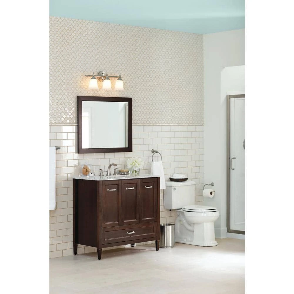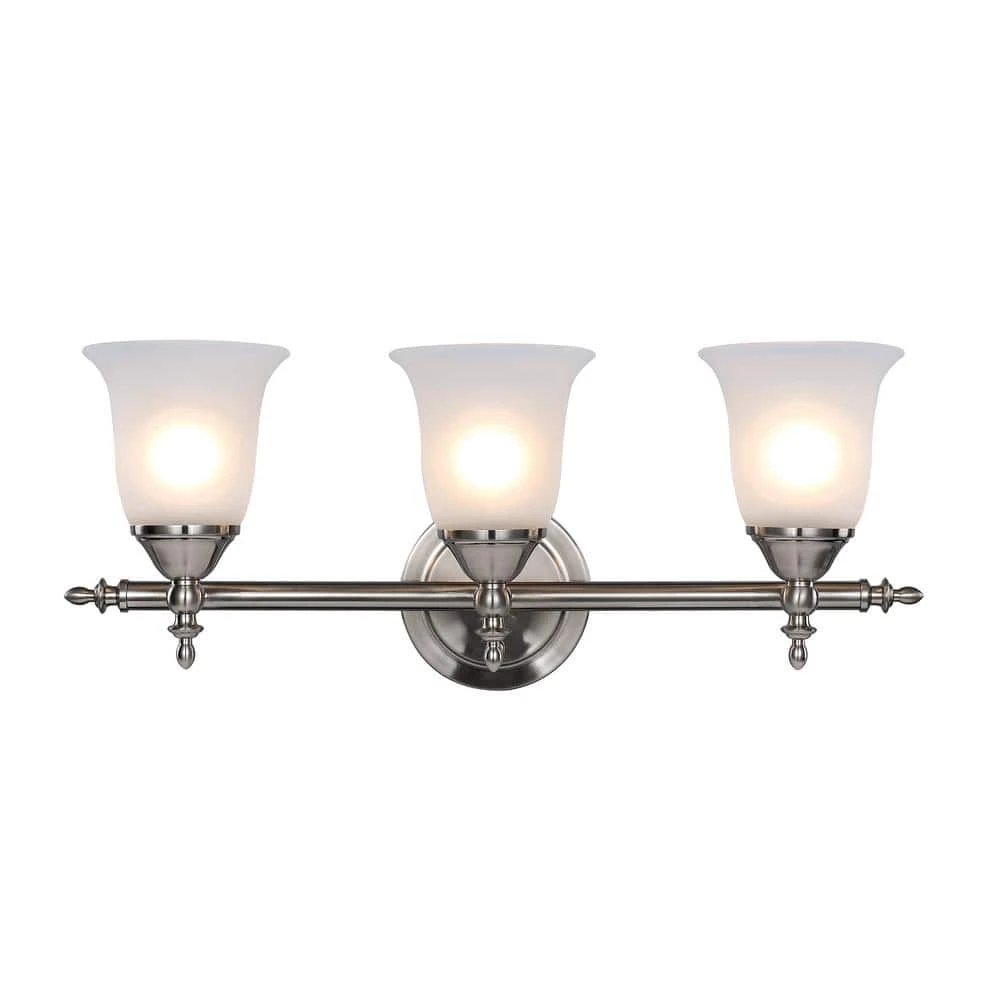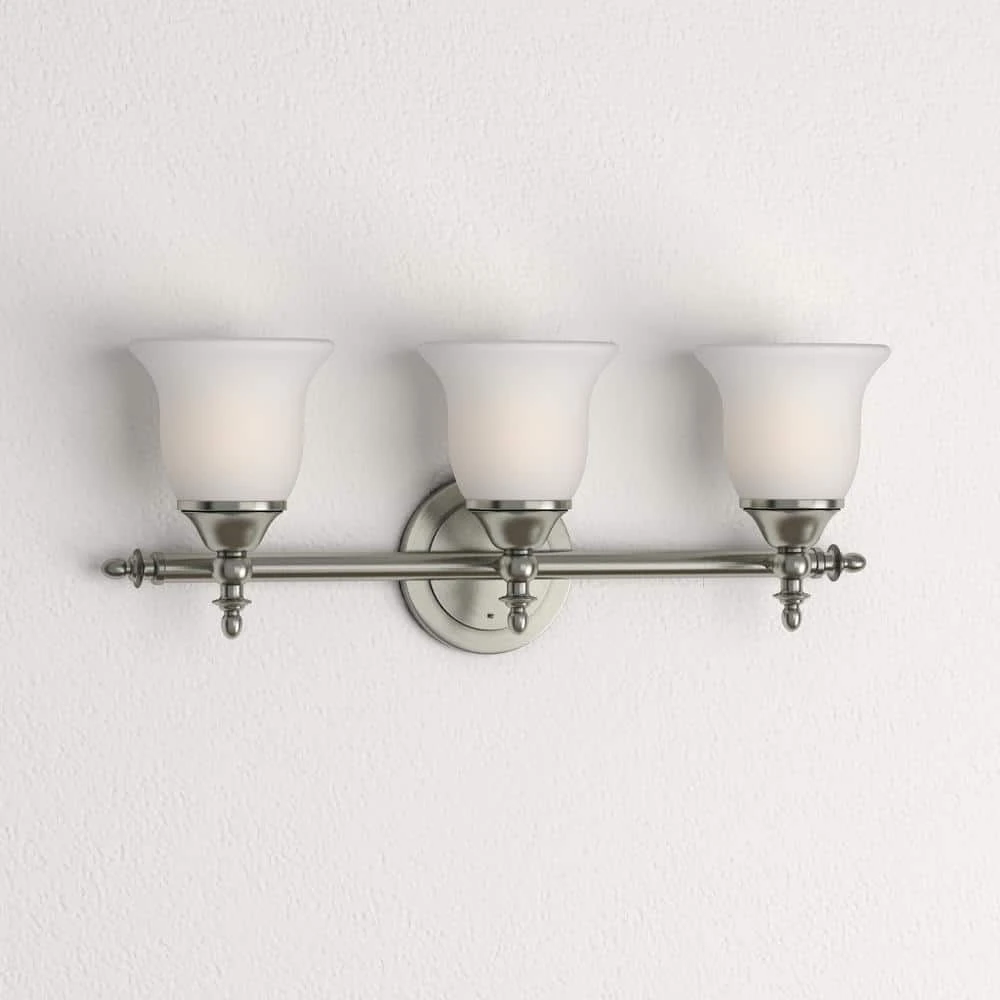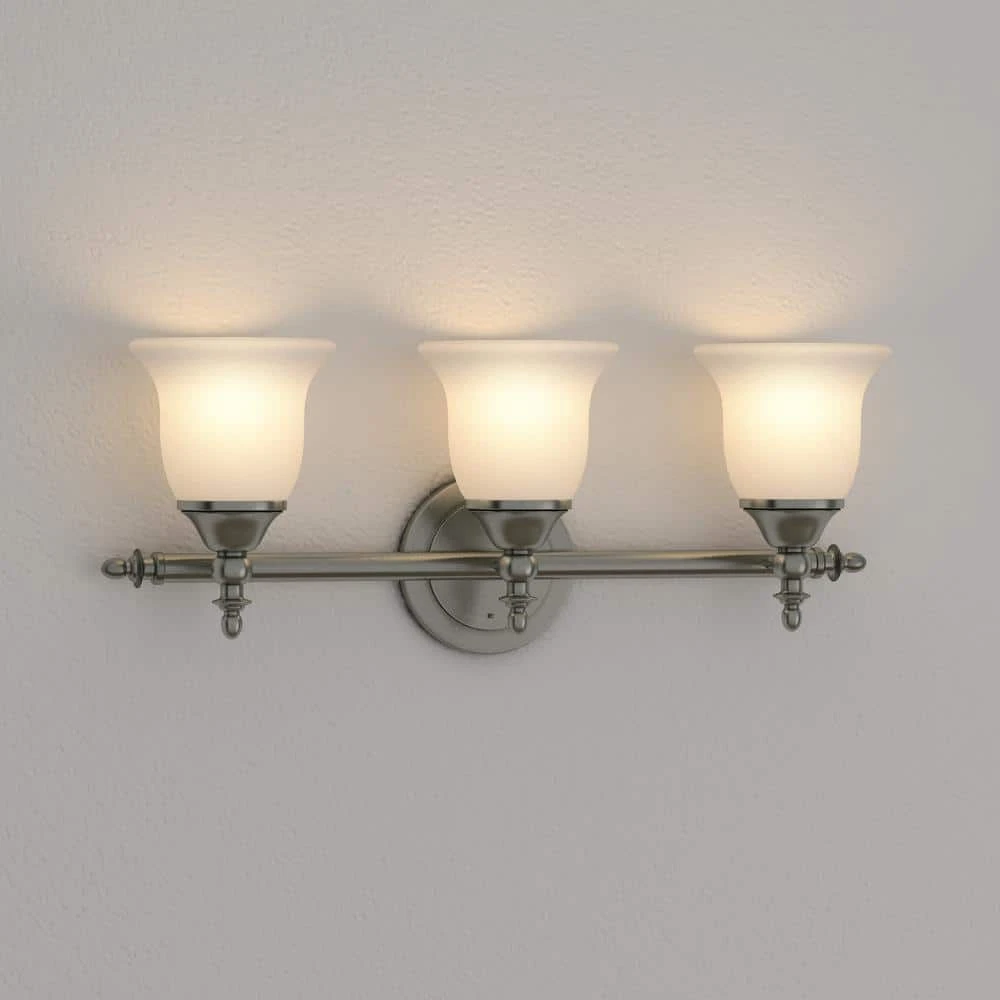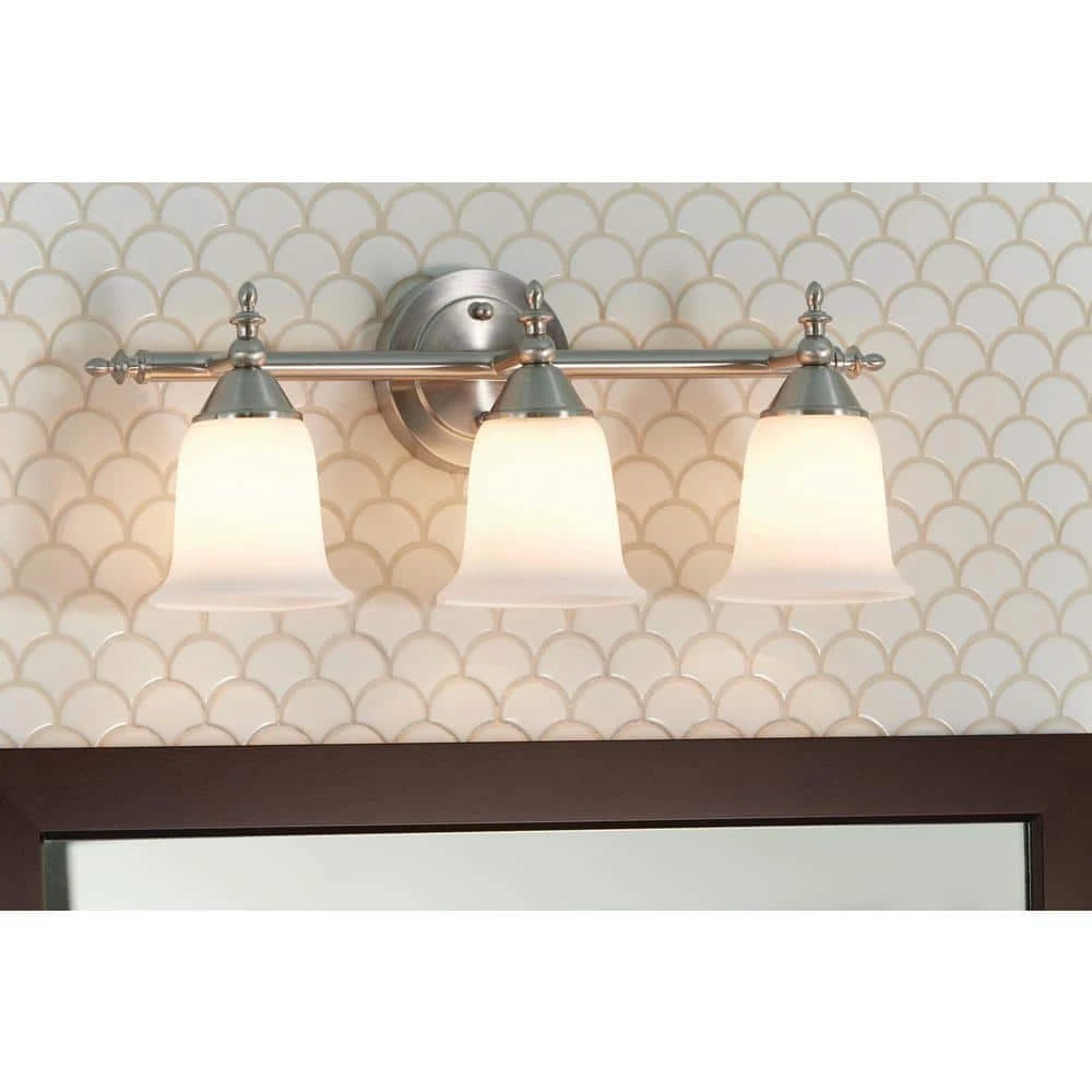 The Hampton Bay Olgelthorpe Collection exhibits transitional style vanity lighting that will upgrade your bathroom or powder room with contemporary, elegant style. The Olgelthorpe 22 inch vanity bar uses three 60-watt bulbs, each of which is shaded by white frosted glass. The white glass is complimented by a classic, brushed nickel finish that will easily coordinate with existing bathroom styles. The bell shaped shades are open at the bottom, allowing easy access to change the bulbs. The shades are held in place by a matching round back plate and straight bar design with decorative finials for added style. This vanity light bar can be mounted with the shades facing upwards or downwards for a customizable look.