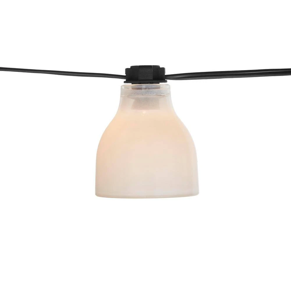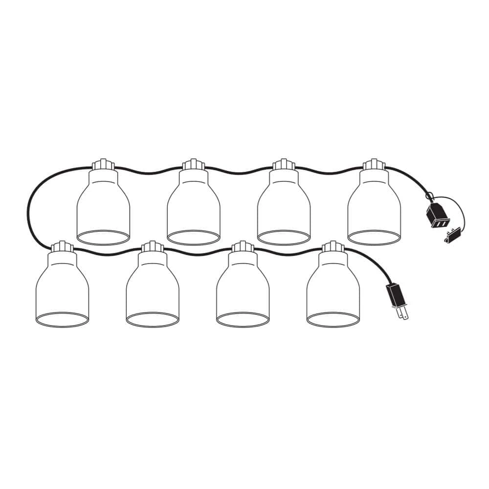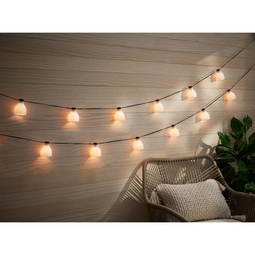 Illuminate your indoor and outdoor spaces with this set of Hampton Bay String Lights. The set includes a ten foot wire with eight bulb sockets evenly spaced throughout. Bulbs are included, and are shaded by white glass bell-shaped shades. Light filters through the white glass and out the open bottom, offering a warm and relaxing glow to your interior and exterior spaces. Use as a single strand, or connect up to four strands with the included end-to-end connectors to illuminate a larger area. These string lights will look great hanging from a patio or deck, and can also be used indoors to provide accent lighting in bedrooms, living areas, and more.