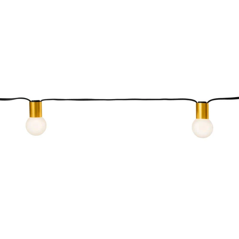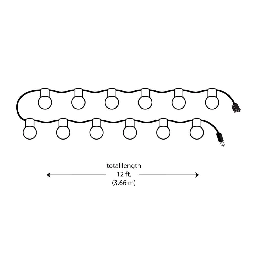 Illuminate your indoor and outdoor spaces with this set of decorative string lights from Hampton Bay. The set includes a 12-foot strand containing 12 metallic gold bulb sockets evenly spaced along the black wire. Incandescent globe-shaped bulbs are included for easy setup, giving you everything you need to decorate your porch and patio spaces. The frosted glass bulbs look great with the lights on or off, providing a unique and whimsical focal point during the day and at night. These string lights will add a warm glow to interior or exterior spaces, creating the perfect ambiance for your home. Use as a single strand or connect up to seven strands for larger areas.
