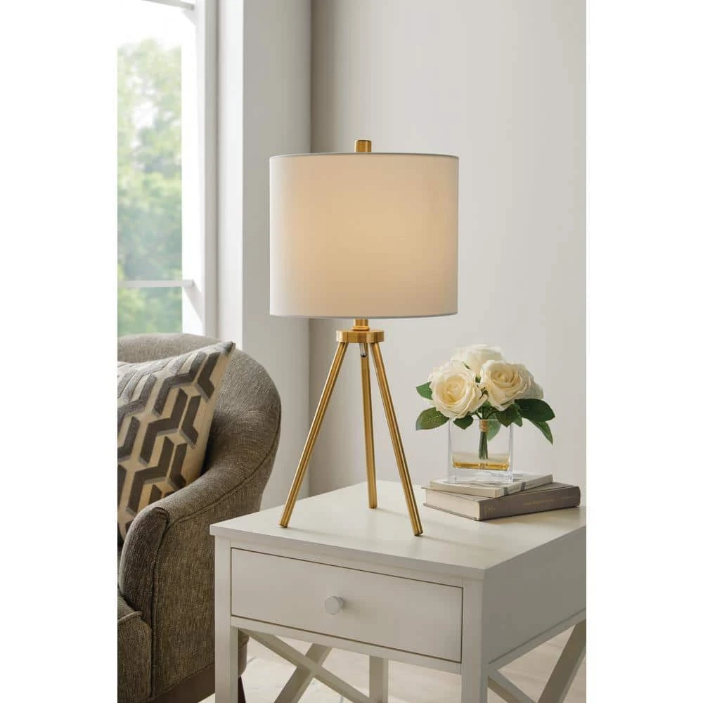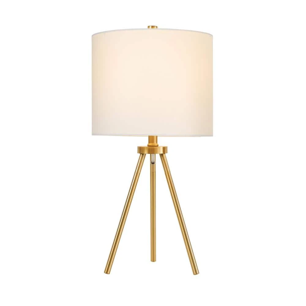 Elegantly illuminate your space with this classically designed tri-frame table lamp from the Quinby Collection. Offering a nod to a classic Mid-century modern aesthetic, this light manages to offer both efficient functionality and effortless elegance. The antique gold plating is topped off with a simple, yet chic, white fabric shade.