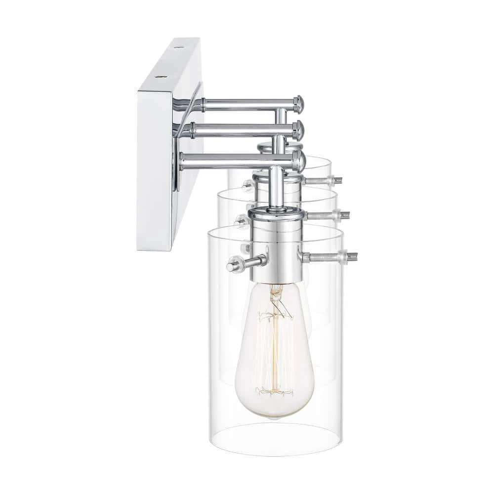 Add a touch of contemporary industrial style to your bathroom with this chrome bath light. This light features 3 cylinder clear glass shades with open bottoms exposing the bulbs inside. Define your living space with the handsome look of this transitional bath light.