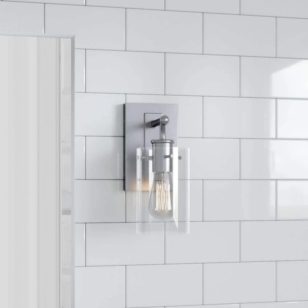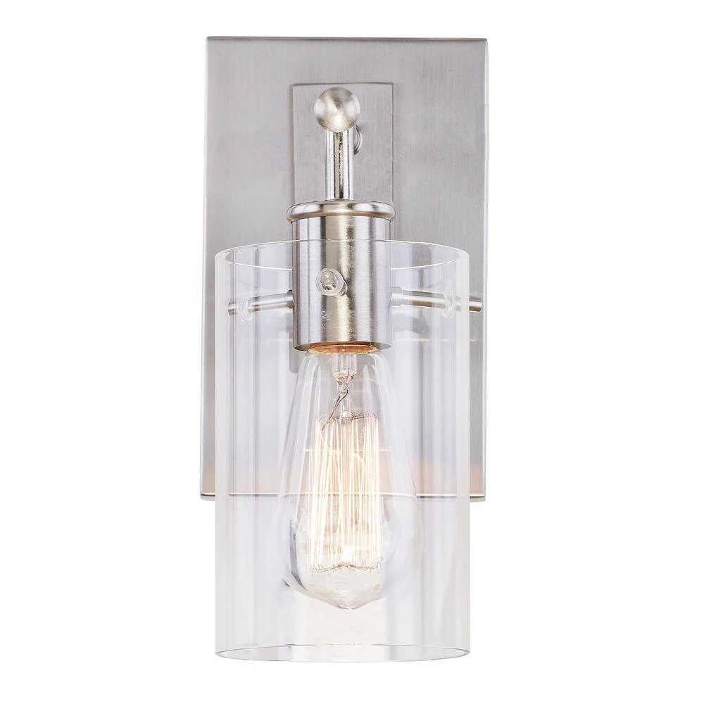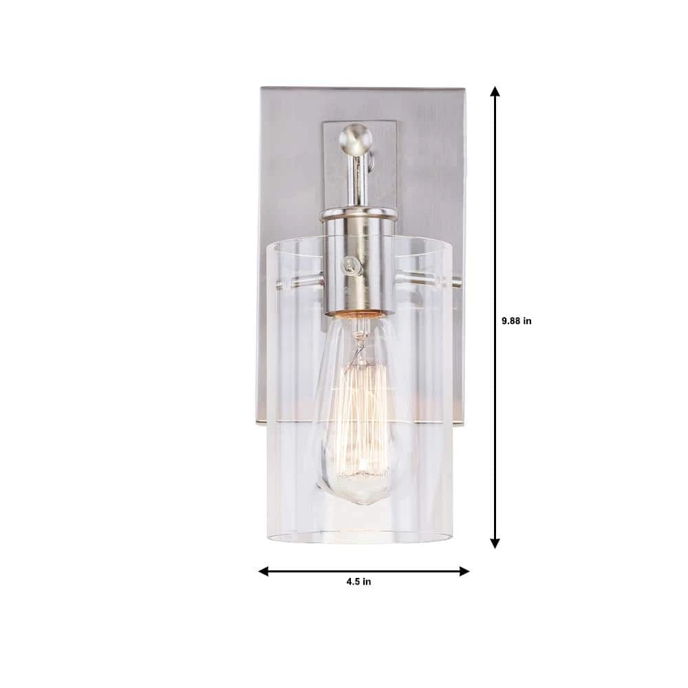 Add a touch of modern industrial style to your bathroom with this vintage inspired Brushed Nickel bath light. This light features 1-cylinder clear glass shade with open bottom exposing the bulb inside. Define your living space with the handsome look of this transitional bath light.