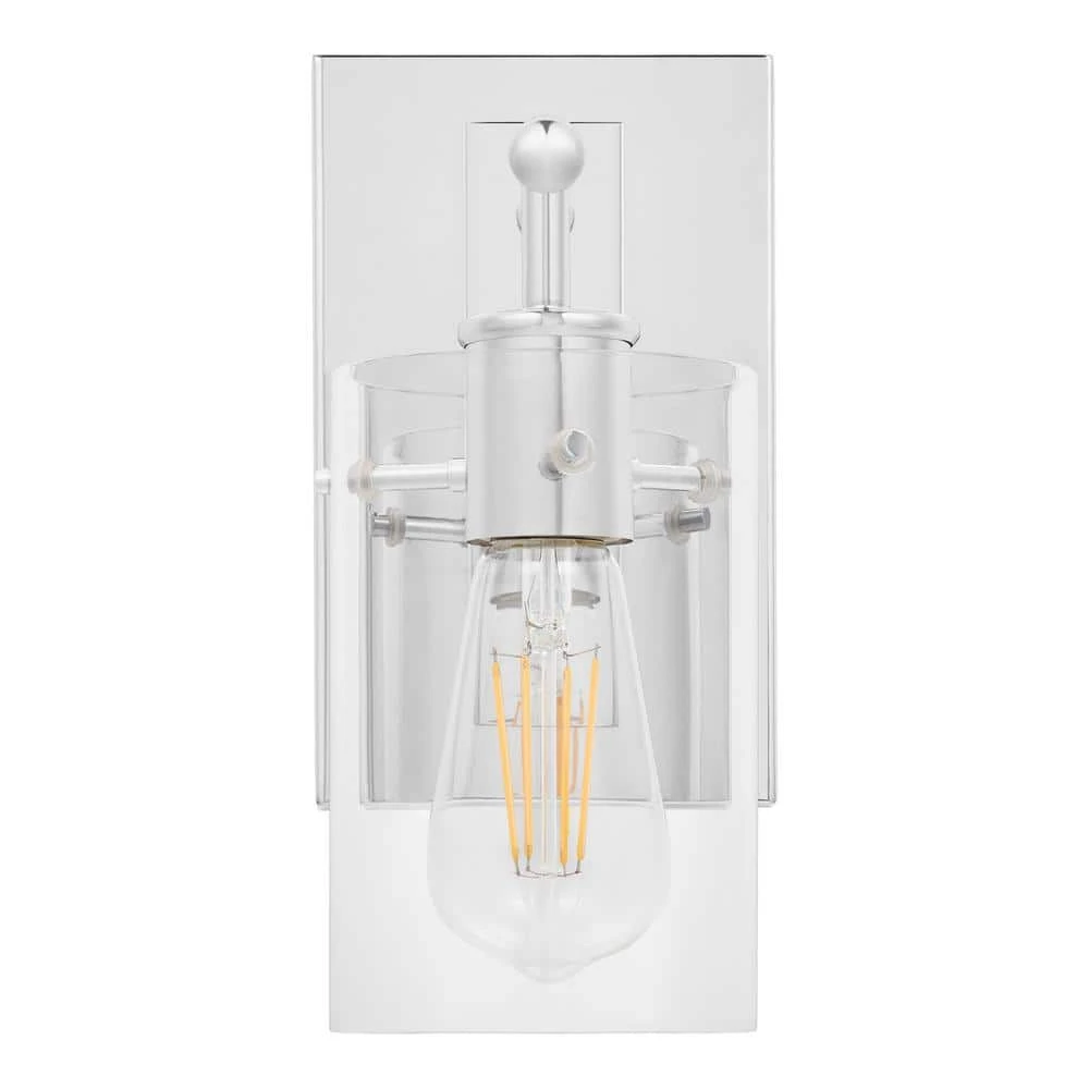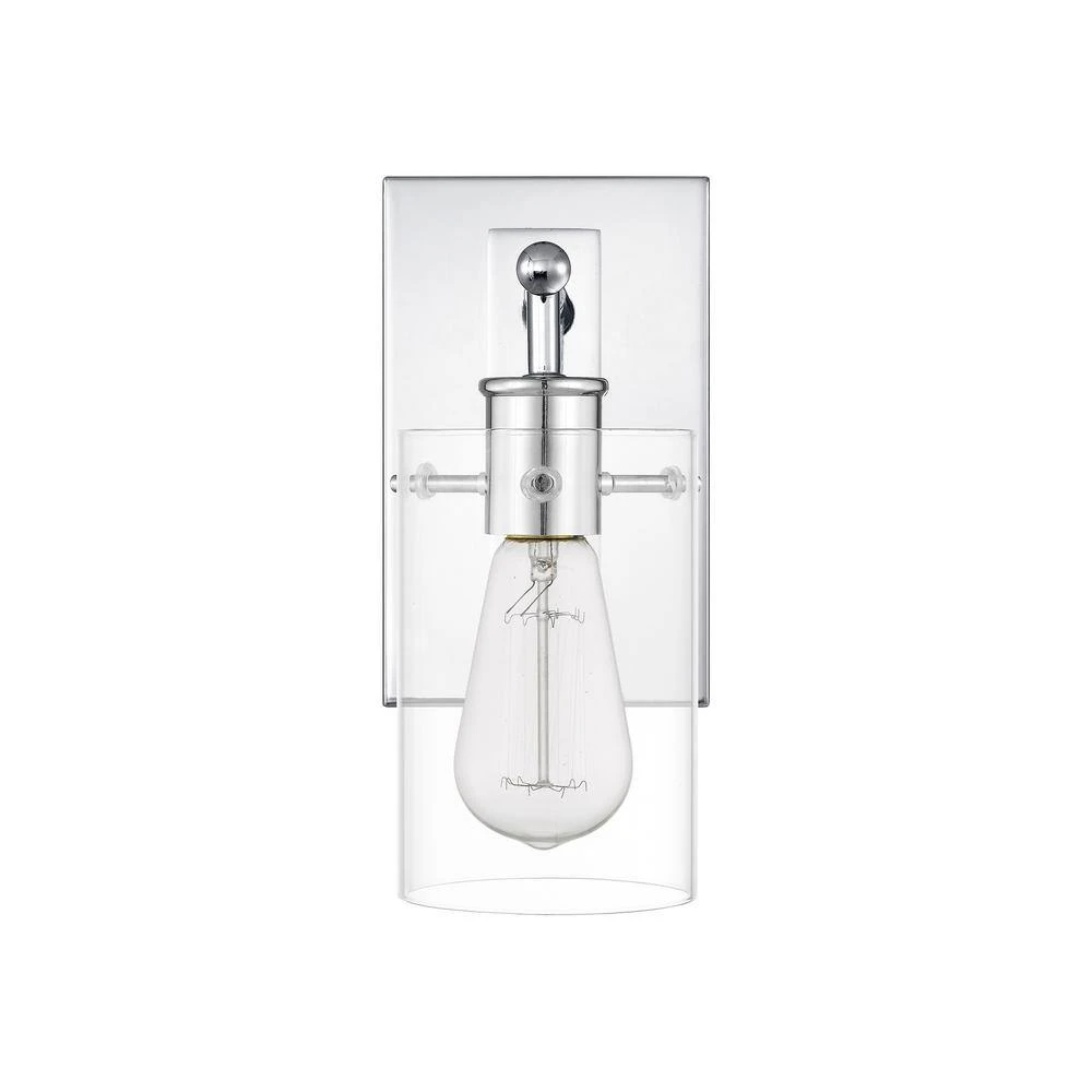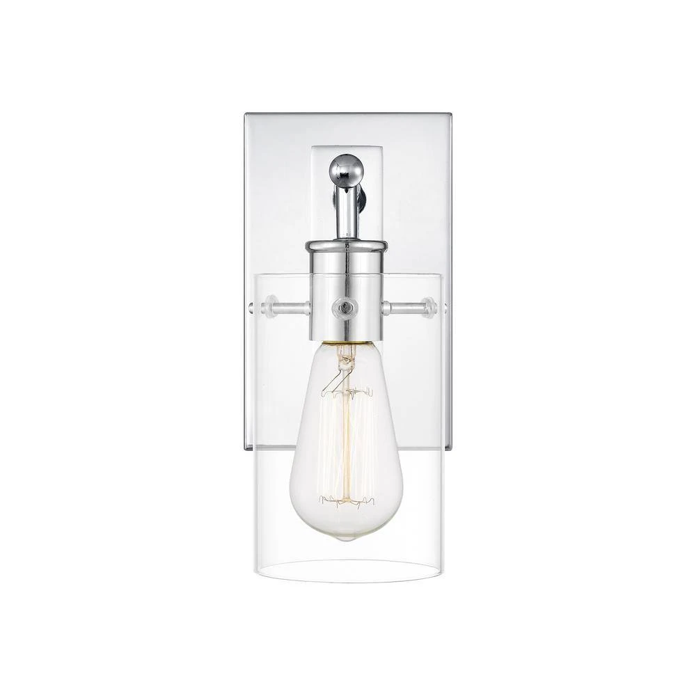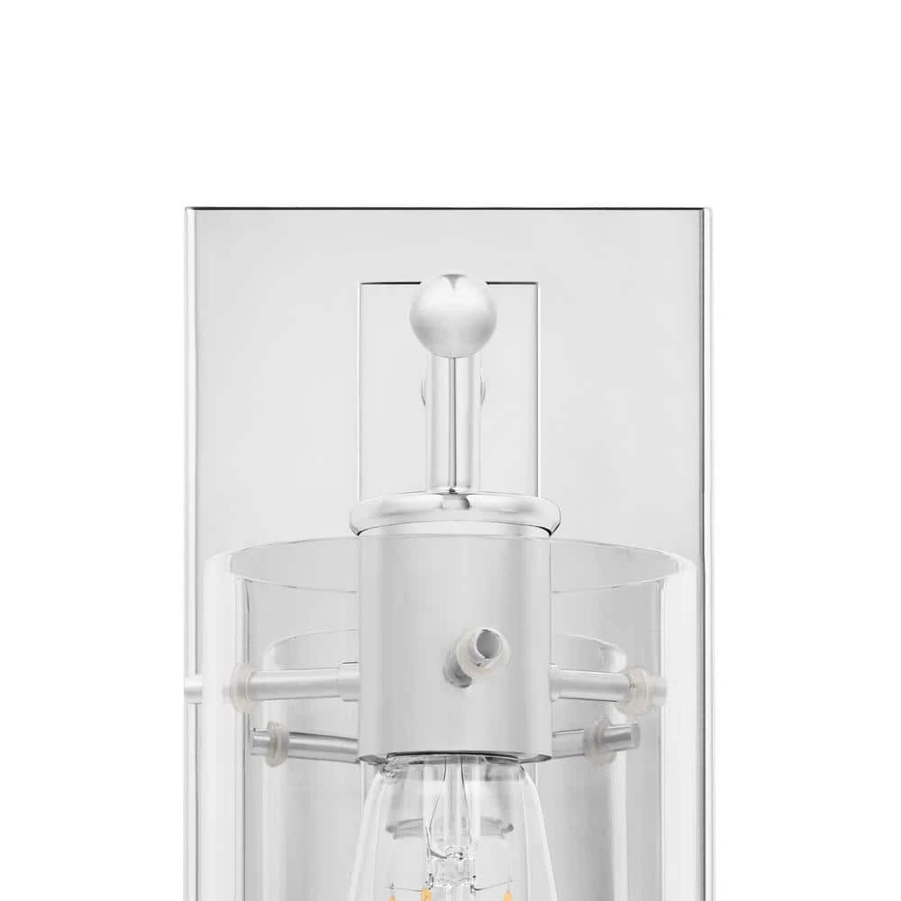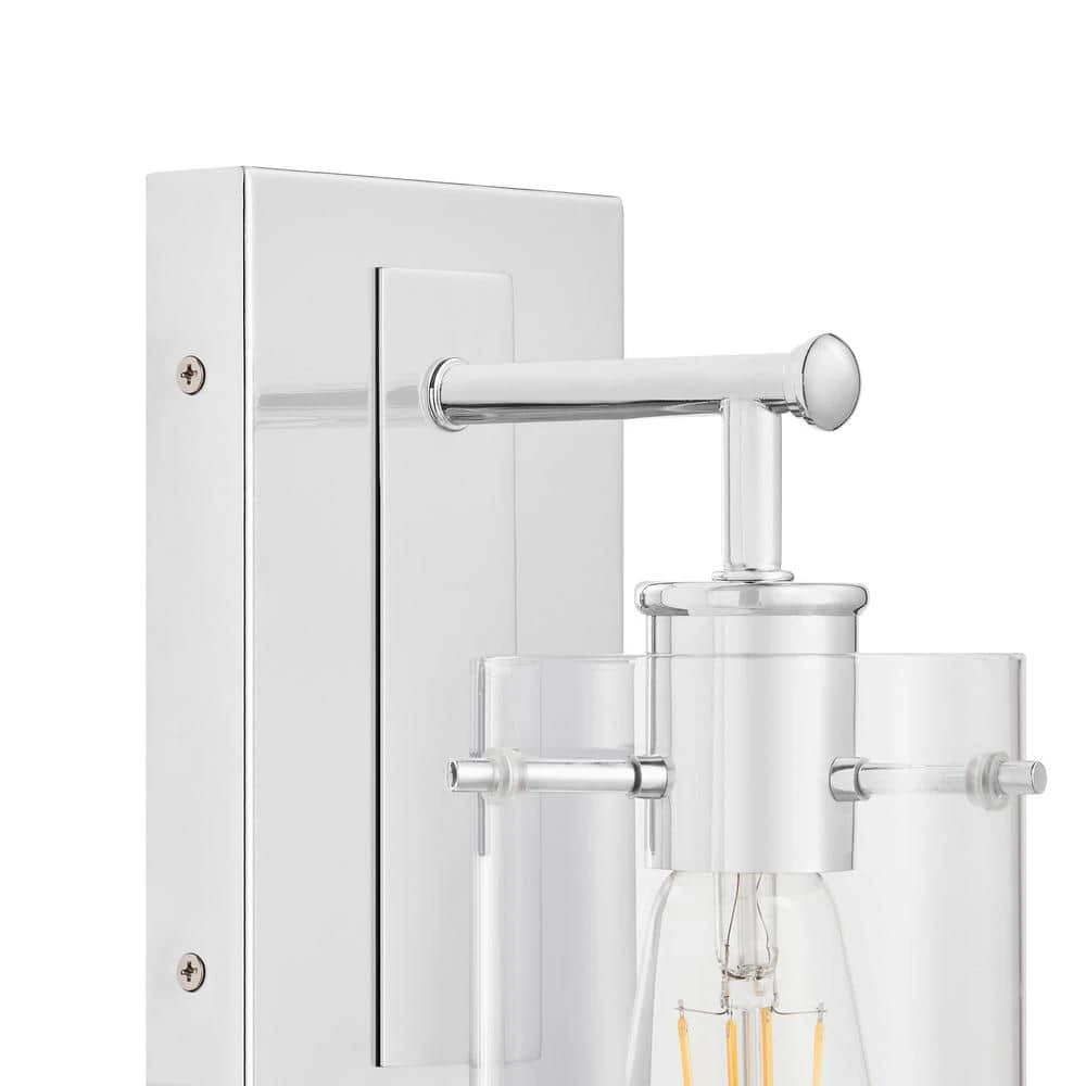 Add a touch of contemporary industrial style to your bathroom or bedroom with this chrome sconce light. This light features a 1-cylinder clear glass shade with open bottom, exposing the bulbs inside. Define your living space with the handsome look of this transitional sconce light.