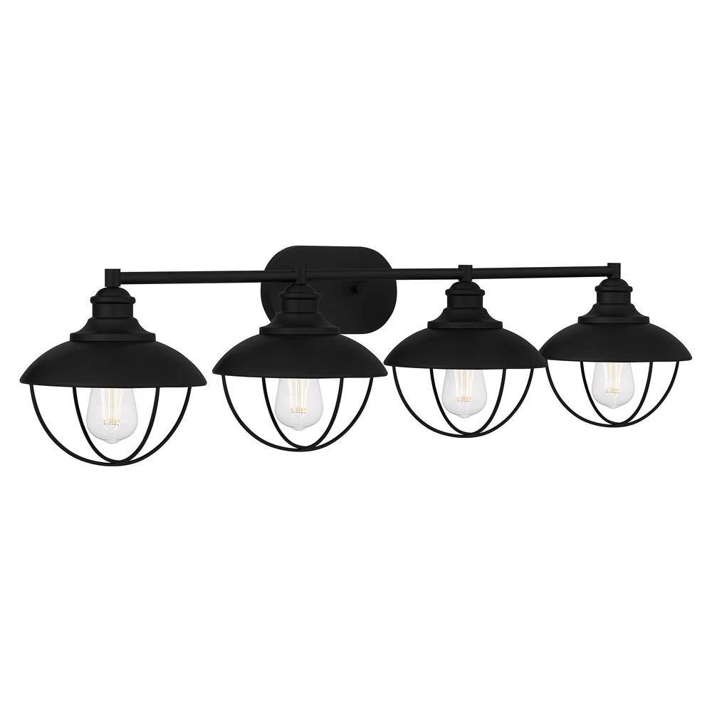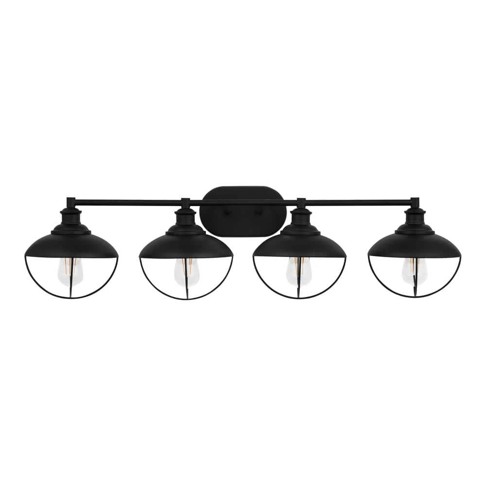 This vanity light offers a mix of contemporary and farmhouse to bring a cozy, yet elegant design to any bathroom. Offering a matte black finish, this steel-constructed fixture is adjustable to allow for an up or down installation. This 4-light vanity boasts an open metal shade design for a unique and timeless look.