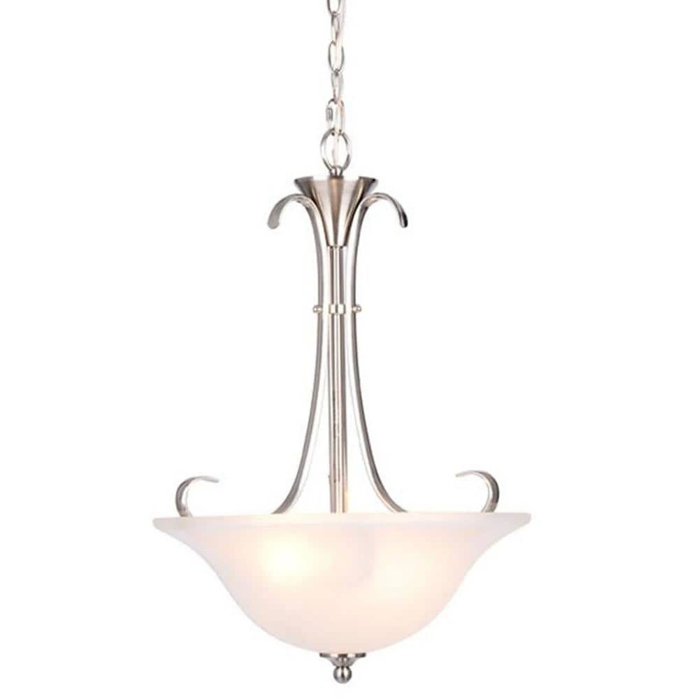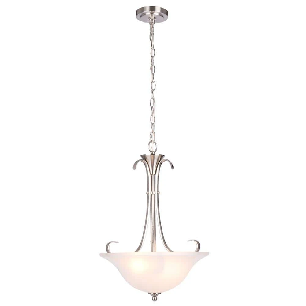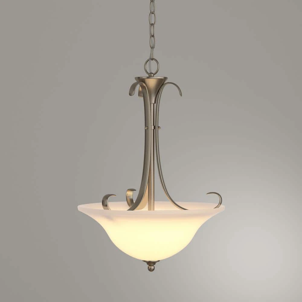 Bring contemporary elegance home. Scrolled arms, in a brushed nickel finish, meet a frosted glass shade, completing the Inverted Pendant Light’s in demand, modern style. A transitional statement piece, this Inverted Pendant Light rewards any dining room or kitchen with distinct style and ambient light. Updating light fixtures in your home is the most effective way to accomplish an alluring, yet simple, DIY remodel.