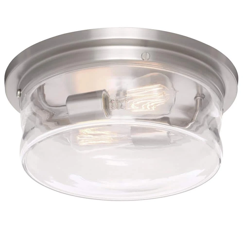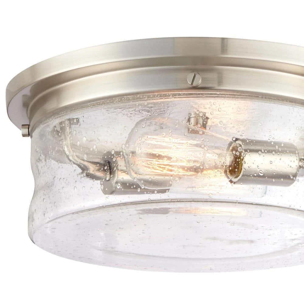Bring back the look of a vintage light with this 2-light flush mount from the Hampton Bay Collection. Clear seeded glass houses Edison bulbs and a brushed nickel finish blends beautifully with any home decor. ETL Listed for damp locations, making it a stylish choice for entryways, hallways, kitchens and laundry rooms. Includes two 60-Watt vintage light bulbs.