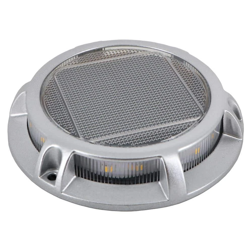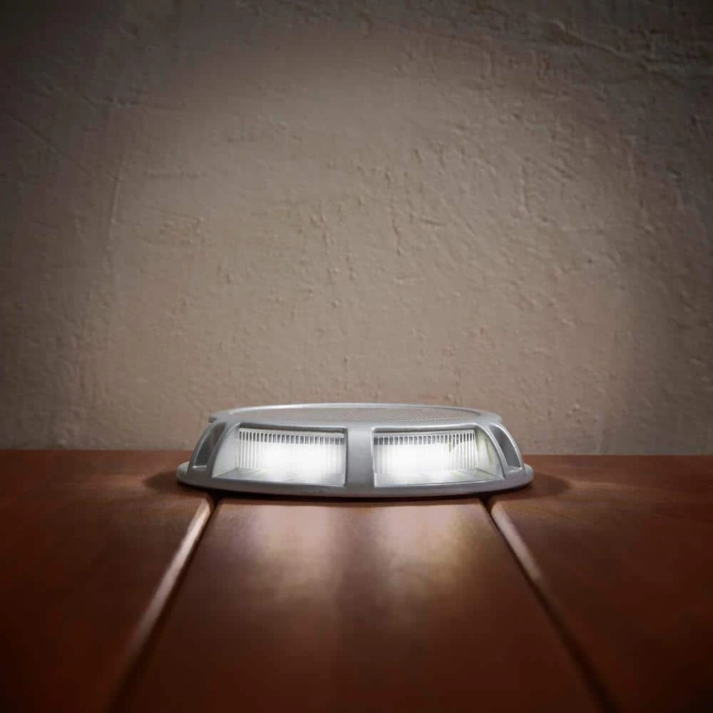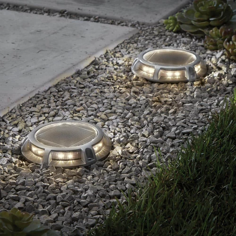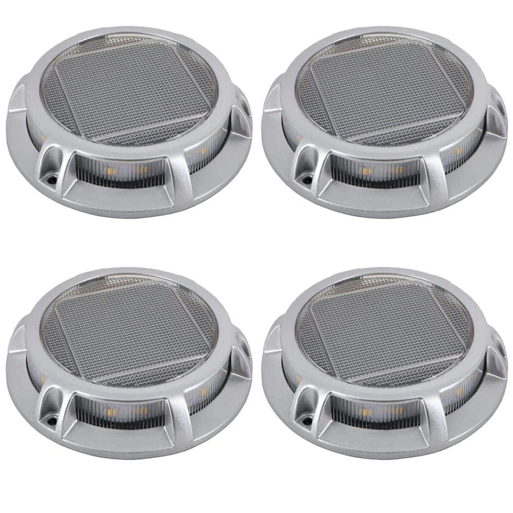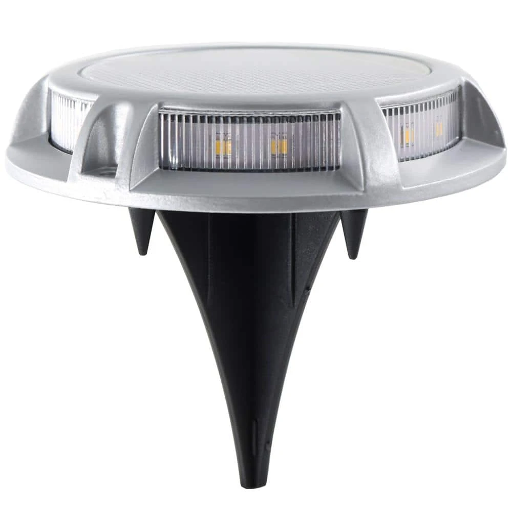 This solar aluminum LED light 4-pack by Hampton Bay offers an easy way to illuminate pathways or decks and rails. The lights can be installed in the ground using the included stakes or mounted directly on decks, steps or rails without the stakes using the provided screws. Each light has 3 integrated LED lights and produces 15 Lumens of light output. Installation is quick and easy with no wiring necessary and the lights are virtually maintenance-free with no bulbs to replace. The lights turn on automatically at dusk and operate up to 8-hours on a full charge. Each light uses 1 AA solar rechargeable battery (included).