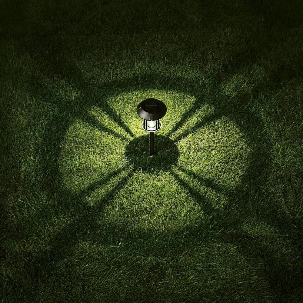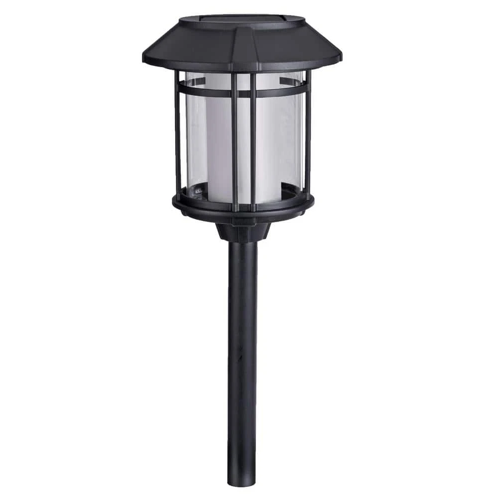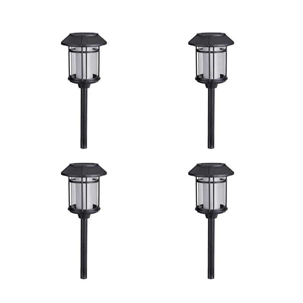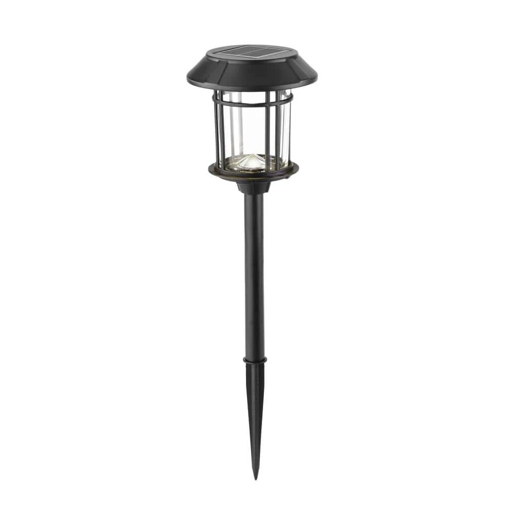 Add a stylish touch to your pathways or gardens with our lantern-style solar stake light. Made of durable plastic with a double-glass diffuser, this versatile light is ideal for year-round outdoor use. The integrated solar panel offers an energy-saving way to illuminate your outdoor areas. Features a 35 Lumens output. Set includes 4 lights.