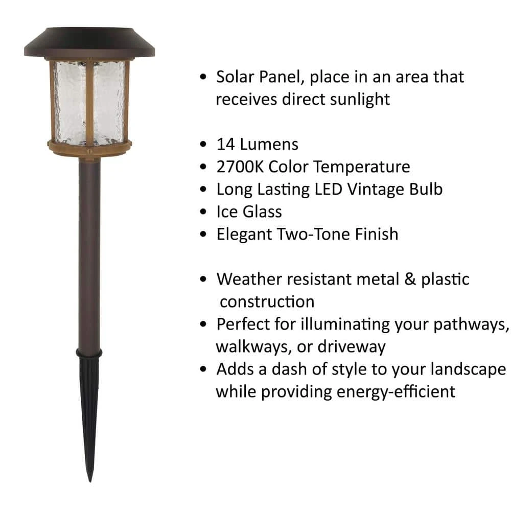 This 2-tone, bronze and warm wood Solar LED Outdoor Pathway Light features an elegant ice glass lens for a beautiful lighting effect on your walkway. The perfect way to enhance your home’s landscape, adds charm and elegance while increasing safety during the nighttime hours. Solar-powered means you can use them anywhere the Sunshines. With no wiring necessary and LED bulbs, these solar path lights are easily installed and practically maintenance free.