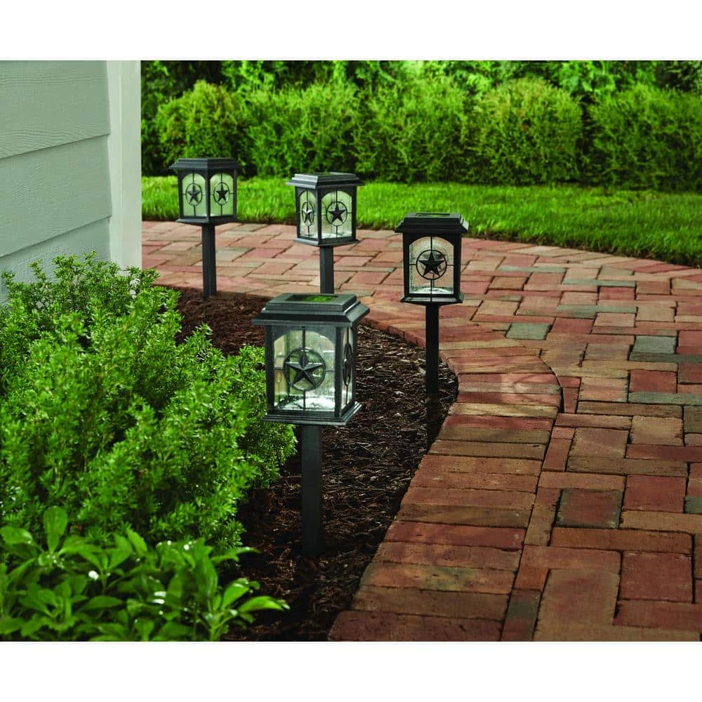The 4-pack Hampton Bay Solar LED Pathway lights creates bright 3000K warm white lighting that is perfect for illuminating your driveway, walkway, patio or garden. At 15 Lumens, you’ll enjoy 8 hours of uninterrupted illumination. The textured black finish with red highlights is applied to applied to a perfect mating of aluminum and weather resistant polymeric materials for years of maintenance-free operation (no bulbs to replace!). Included with your LED deck light are all necessary hardware and battery(s).