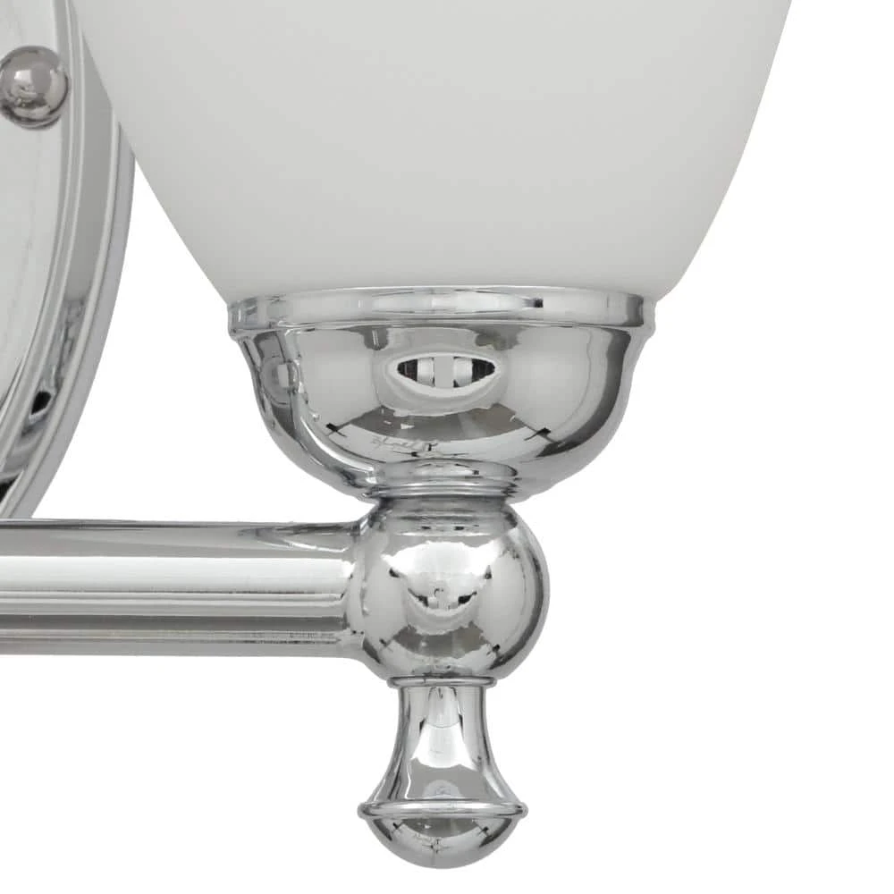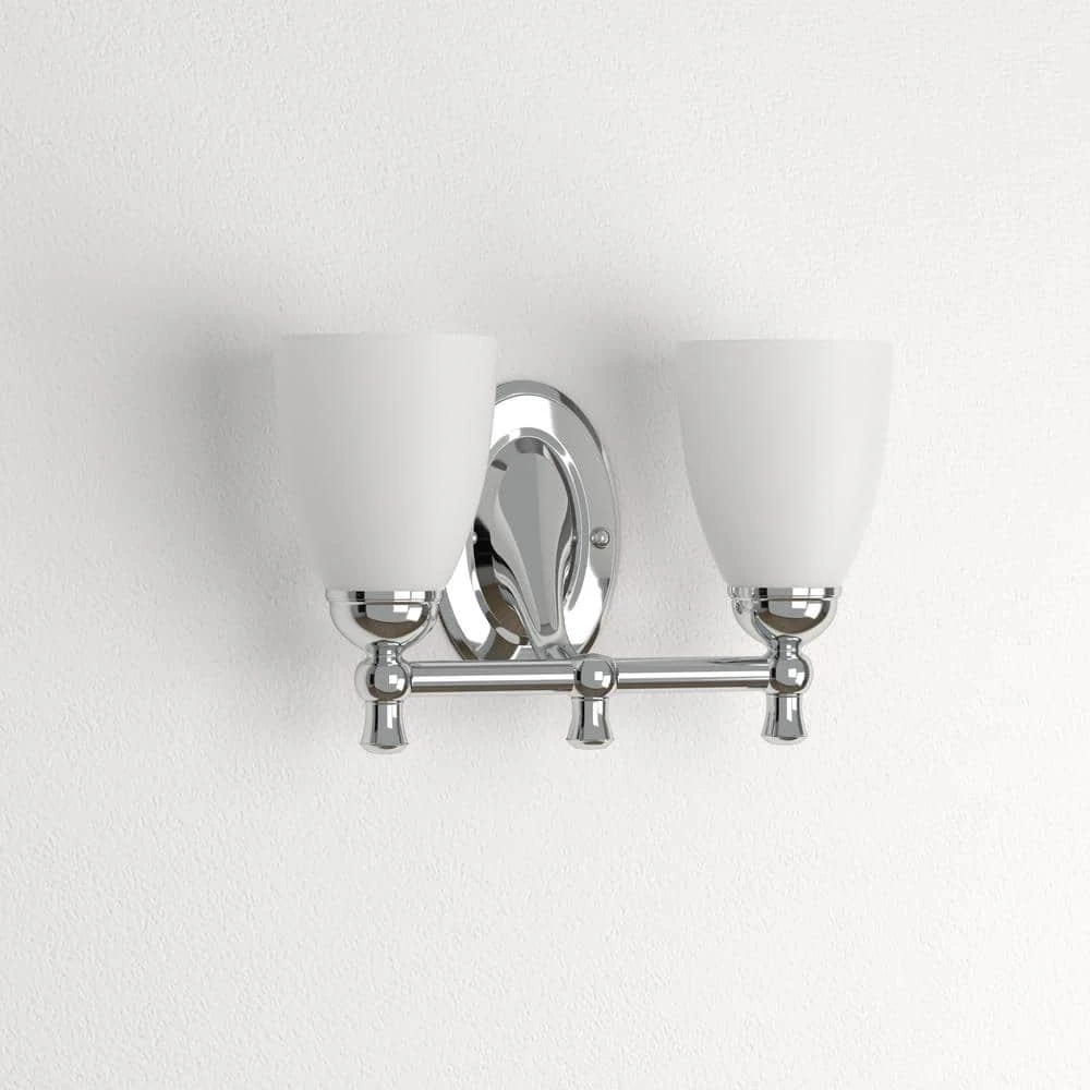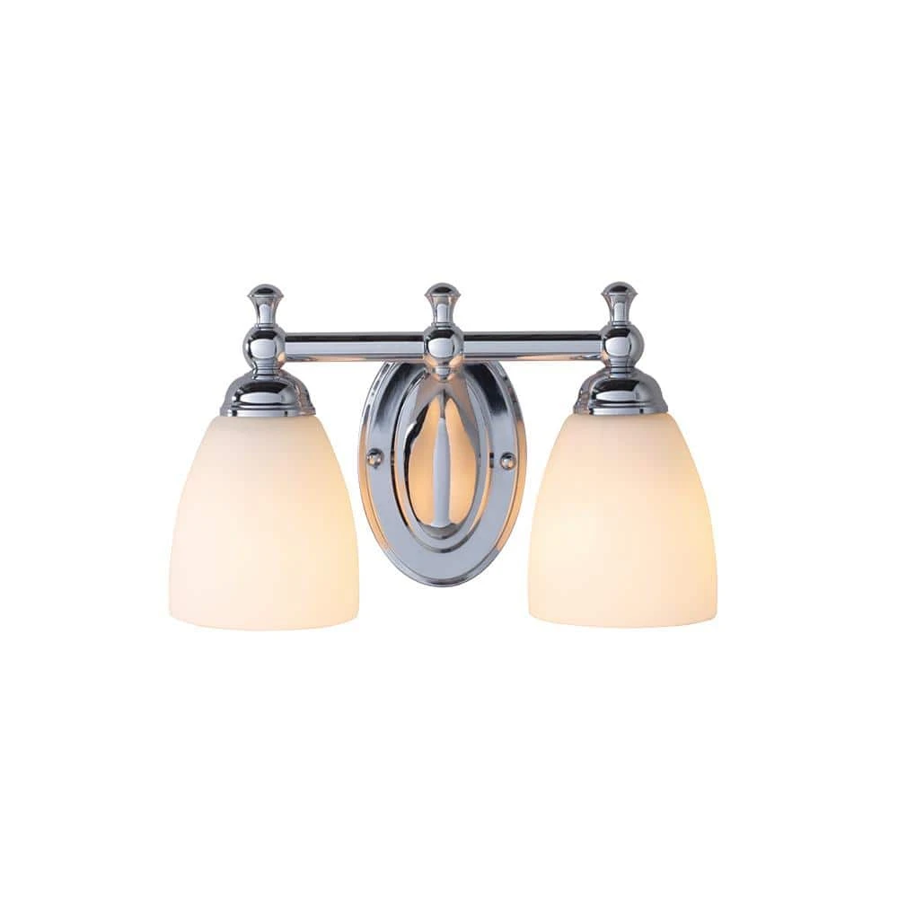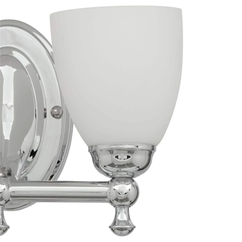The Solomone Collection features contemporary style vanity lighting that will provide ample task light where needed most in bathroom and powder room areas. The Solomone 13.4 inch wide vanity bar is finished in a cool toned polished chrome, designed to coordinate with existing bathroom hardware. The white glass bell shades are held in place by a straight arm and connect to a matching oval wall plate. The two glass shades are open at the bottom, allowing for directional light from the 60-watt bulbs inside. This versatile fixture can be mounted upwards or downwards for a customizable look.