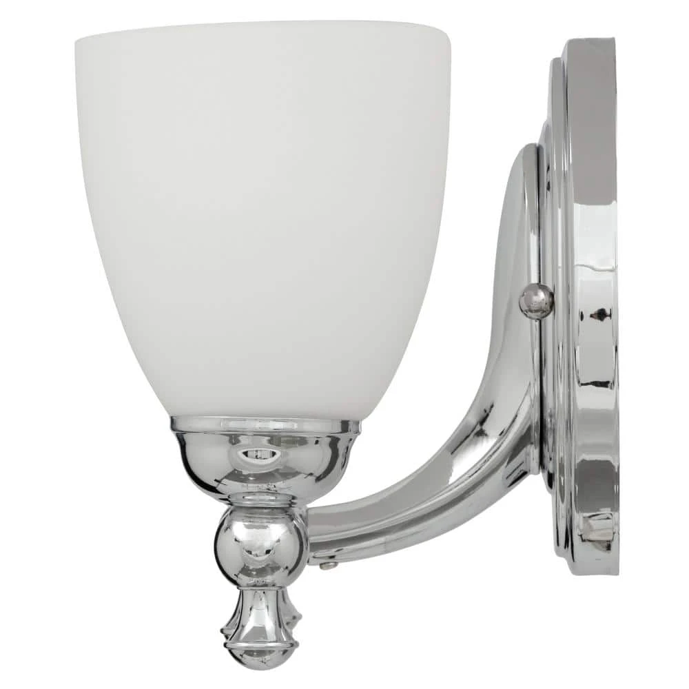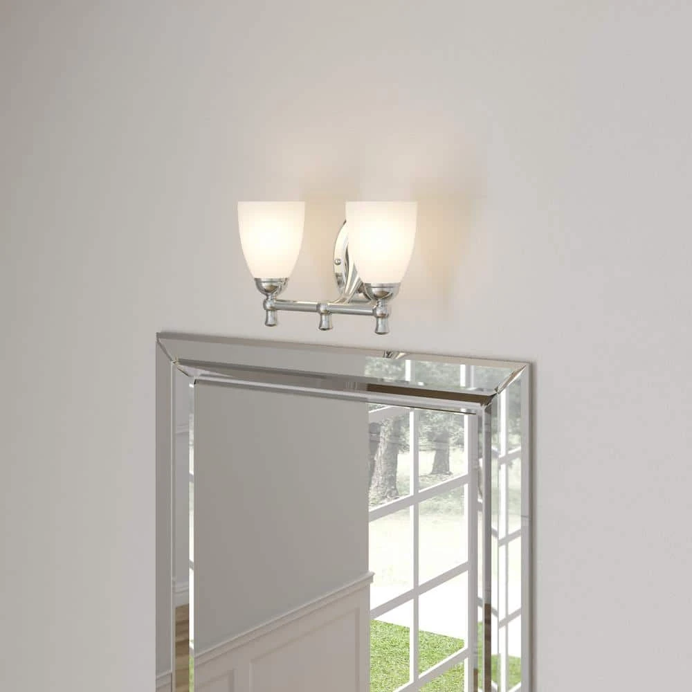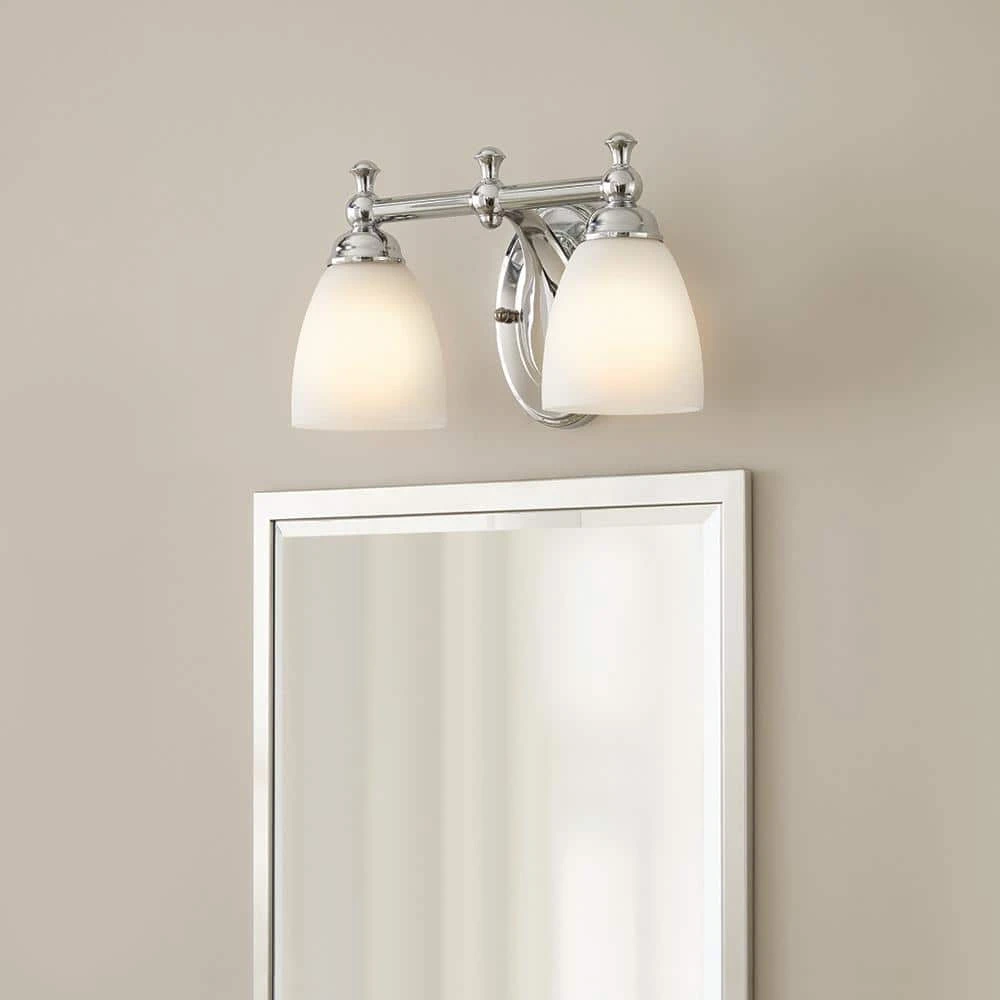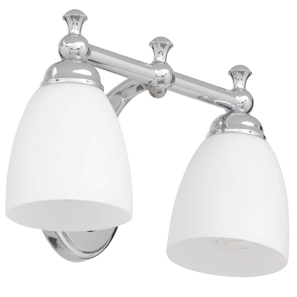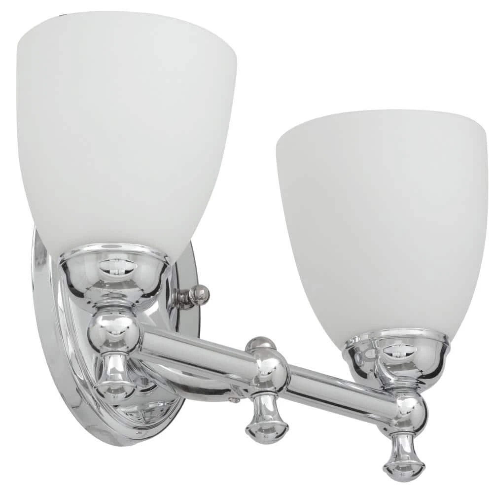 The Solomone Collection features contemporary style vanity lighting that will provide ample task light where needed most in bathroom and powder room areas. The Solomone 13.4 inch wide vanity bar is finished in a cool toned polished chrome, designed to coordinate with existing bathroom hardware. The white glass bell shades are held in place by a straight arm and connect to a matching oval wall plate. The two glass shades are open at the bottom, allowing for directional light from the 60-watt bulbs inside. This versatile fixture can be mounted upwards or downwards for a customizable look.