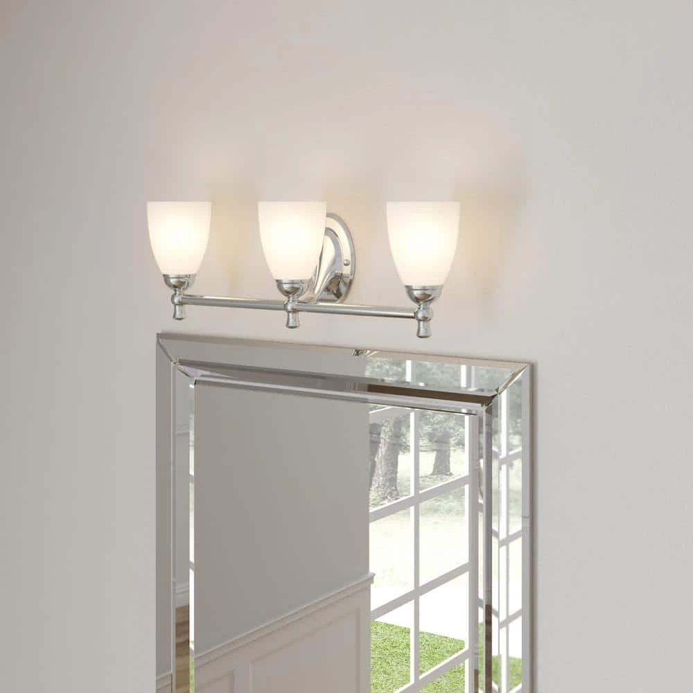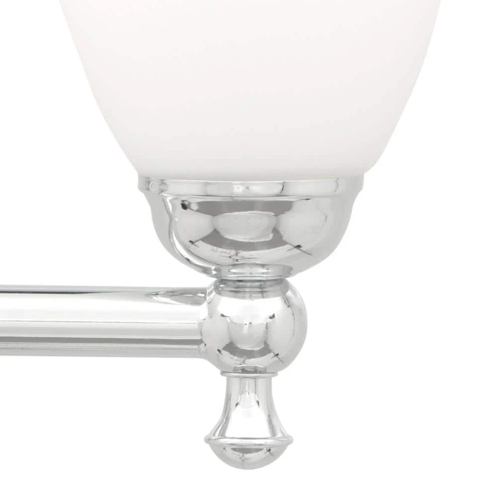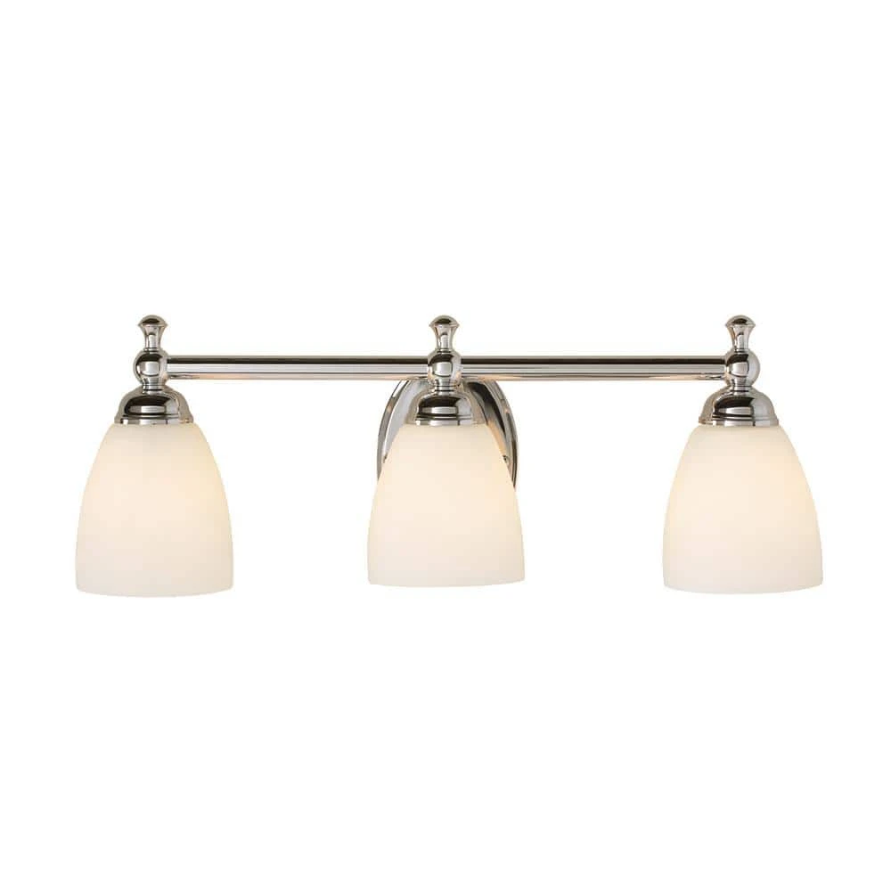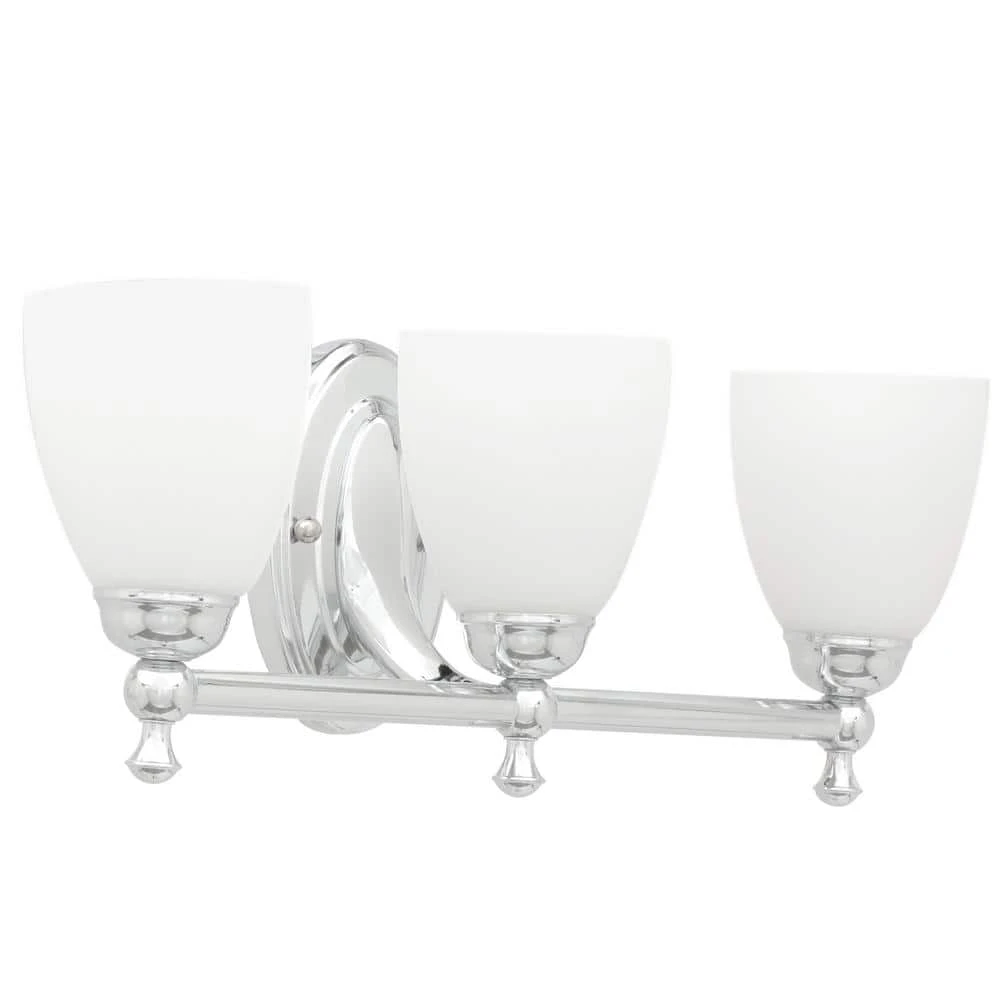The Solomone Collection features contemporary style vanity lighting that will provide ample task light where needed most in bathroom and powder room areas. The Solomone 22 inch bathoom vanity light is finished in a cool toned polished chrome, designed to coordinate with existing bathroom hardware. The white opal glass bell shades are held in place by a straight arm and connect to a matching oval wall plate. The three glass shades are open at the bottom, allowing for directional light from the 60-watt bulbs inside. This versatile fixture can be mounted upwards or downwards for a customizable look.