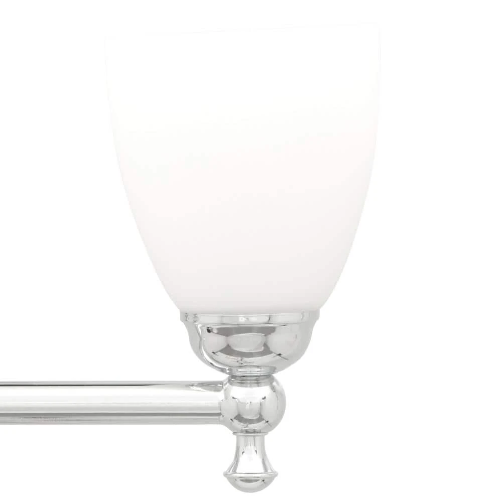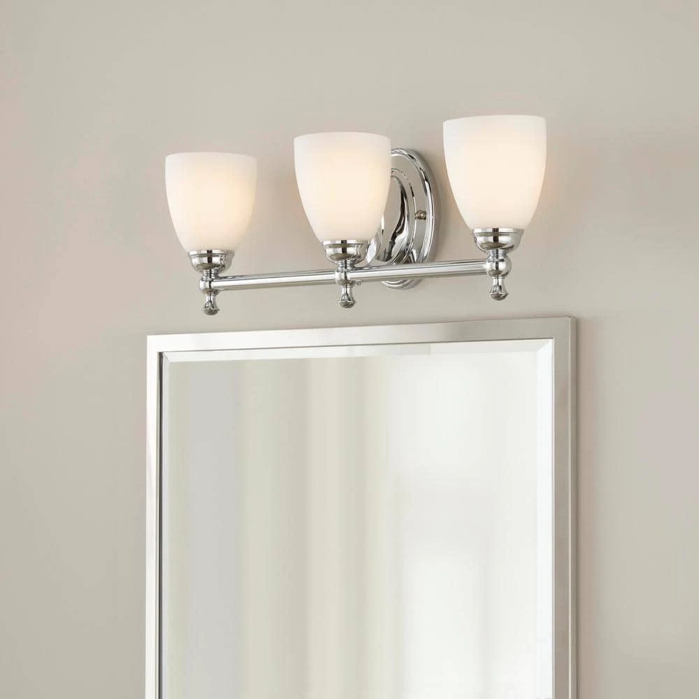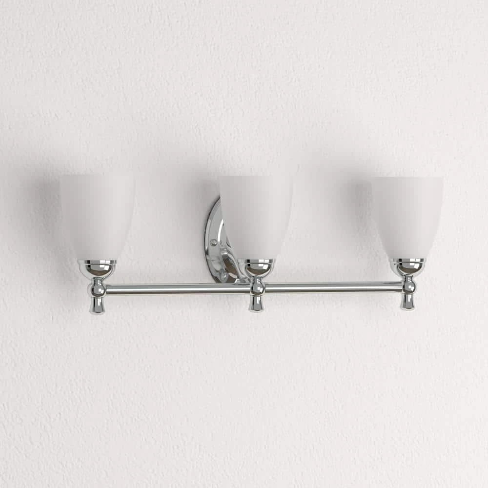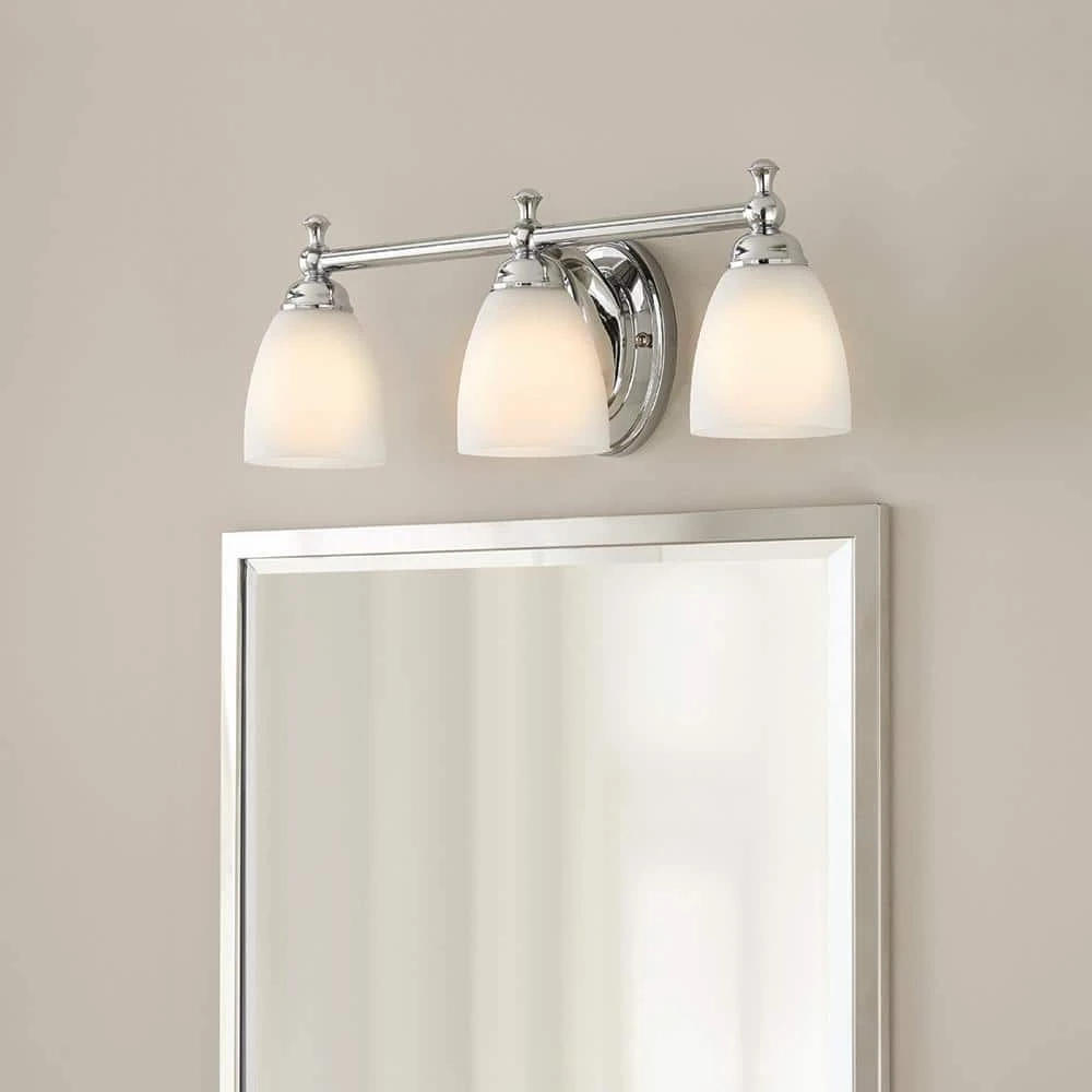 The Solomone Collection features contemporary style vanity lighting that will provide ample task light where needed most in bathroom and powder room areas. The Solomone 22 inch bathoom vanity light is finished in a cool toned polished chrome, designed to coordinate with existing bathroom hardware. The white opal glass bell shades are held in place by a straight arm and connect to a matching oval wall plate. The three glass shades are open at the bottom, allowing for directional light from the 60-watt bulbs inside. This versatile fixture can be mounted upwards or downwards for a customizable look.