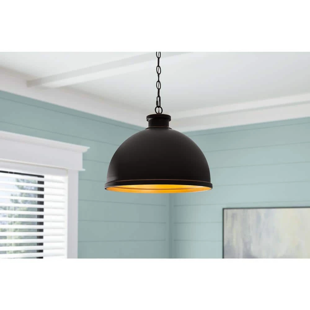 With a trendy oil rubbed bronze aluminum shade finished with a matte gold interior, the Tallulah Pendant Light is perfect for bringing a turn-of-the-century industrial modern look to any area. The fully adjustable hanging chain allows you to customize the fixture to your specific needs and looks great above a dining room table or hung as a set above a kitchen island. This modern industrial light features a sleek dome design for the shade that places it firmly in a timeless contemporary style. The classic hanging cord and chain plus matching oil rubbed bronze canopy and shade accent your minimalist industrial decor.