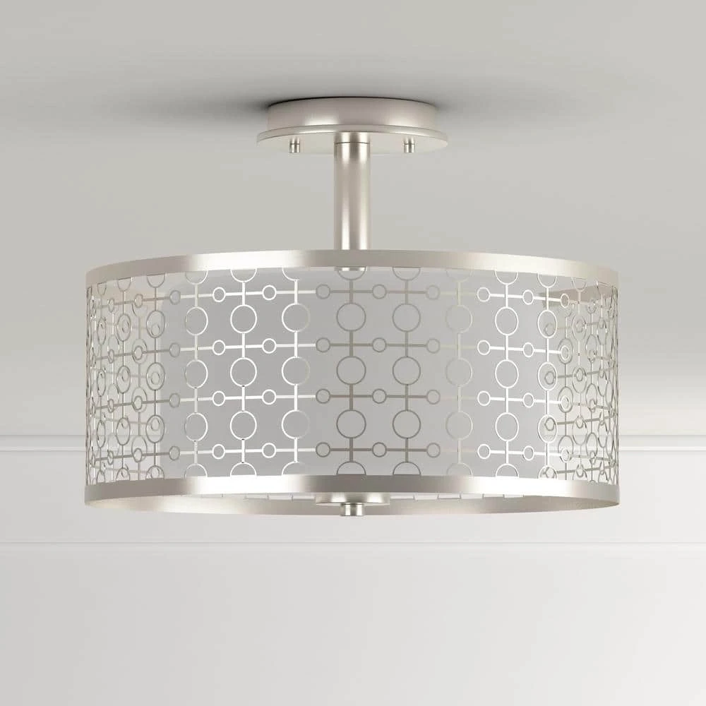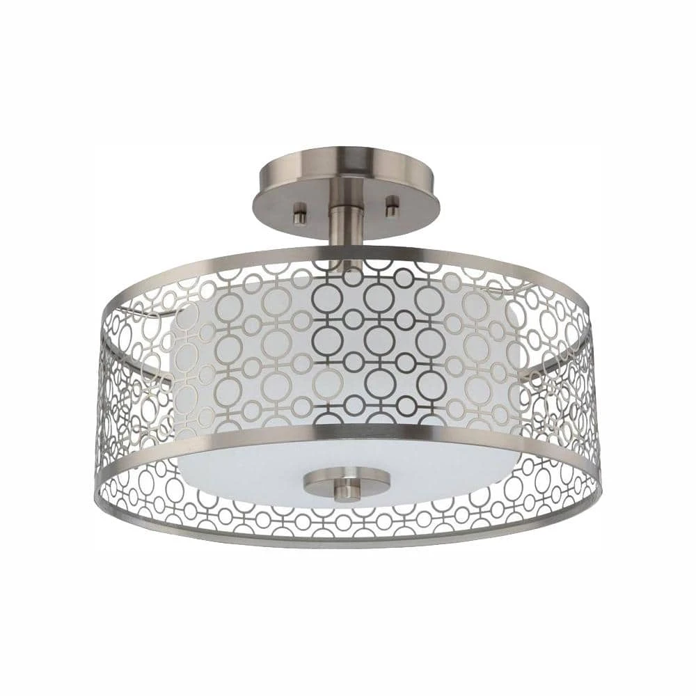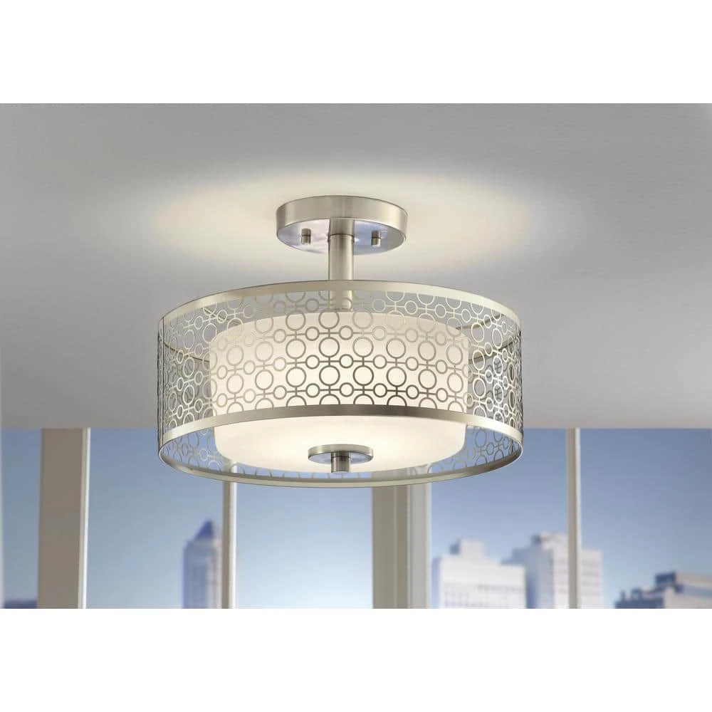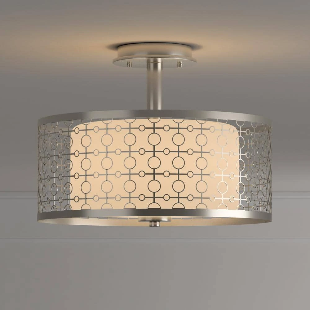 Go ahead. Mingle with your favorite home decor accents to find a place for this fun, flirty fixture. Subtle, parchment-like glass shades offer a discreet pattern and refreshing look when illuminated. A decorative metal frame, that highlights alternating concentric, circular shapes surrounds all fixtures. The Brushed Nickel finish provides a nice, softly patterned diffused light for a variety of room settings.