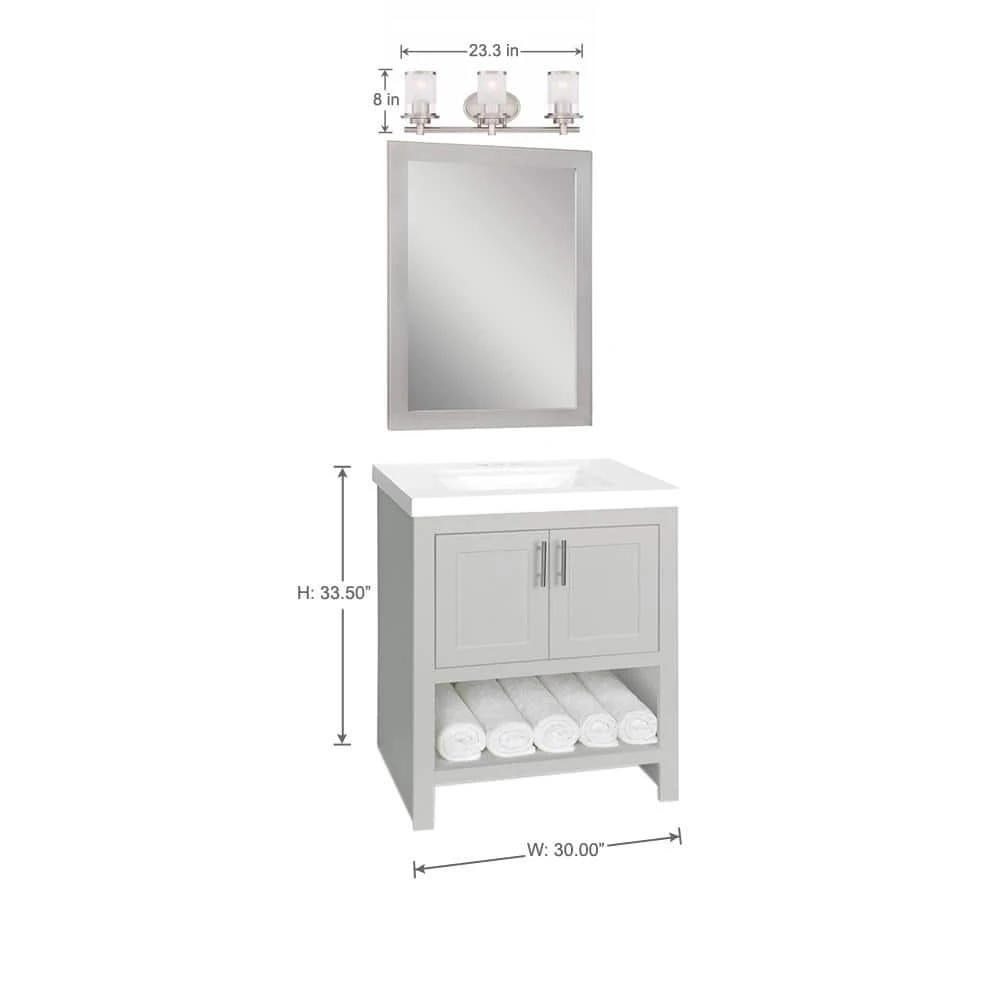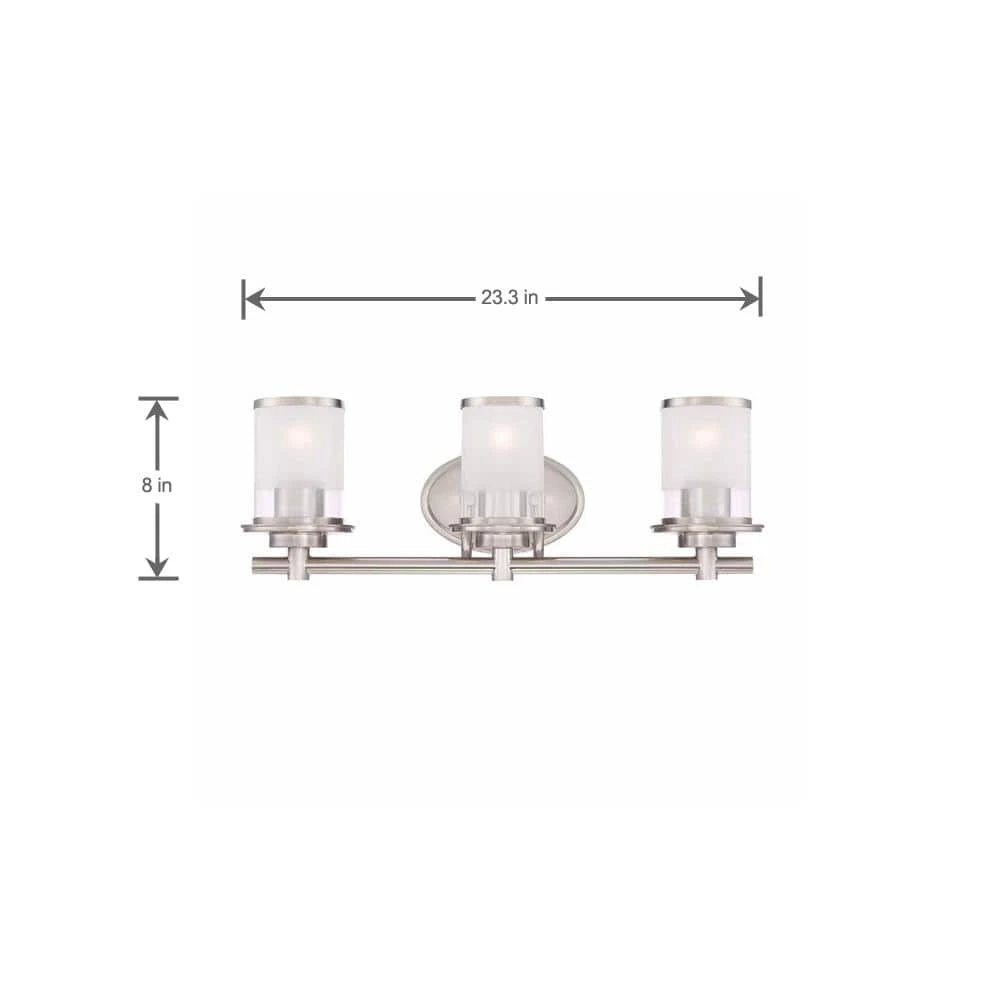 Brighten your bathroom with this Hampton Bay 3-light bath vanity. Featuring a stylish brushed nickel finish and frosted glass shades with rings, it adds a contemporary touch to your decor. Install it with the shades in the up or down position to suit your lighting needs. This fixture is made of steel for long-lasting use and rated for damp locations.