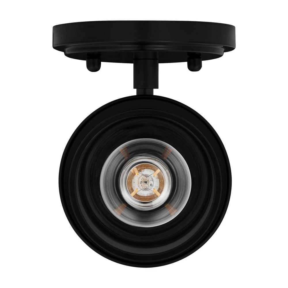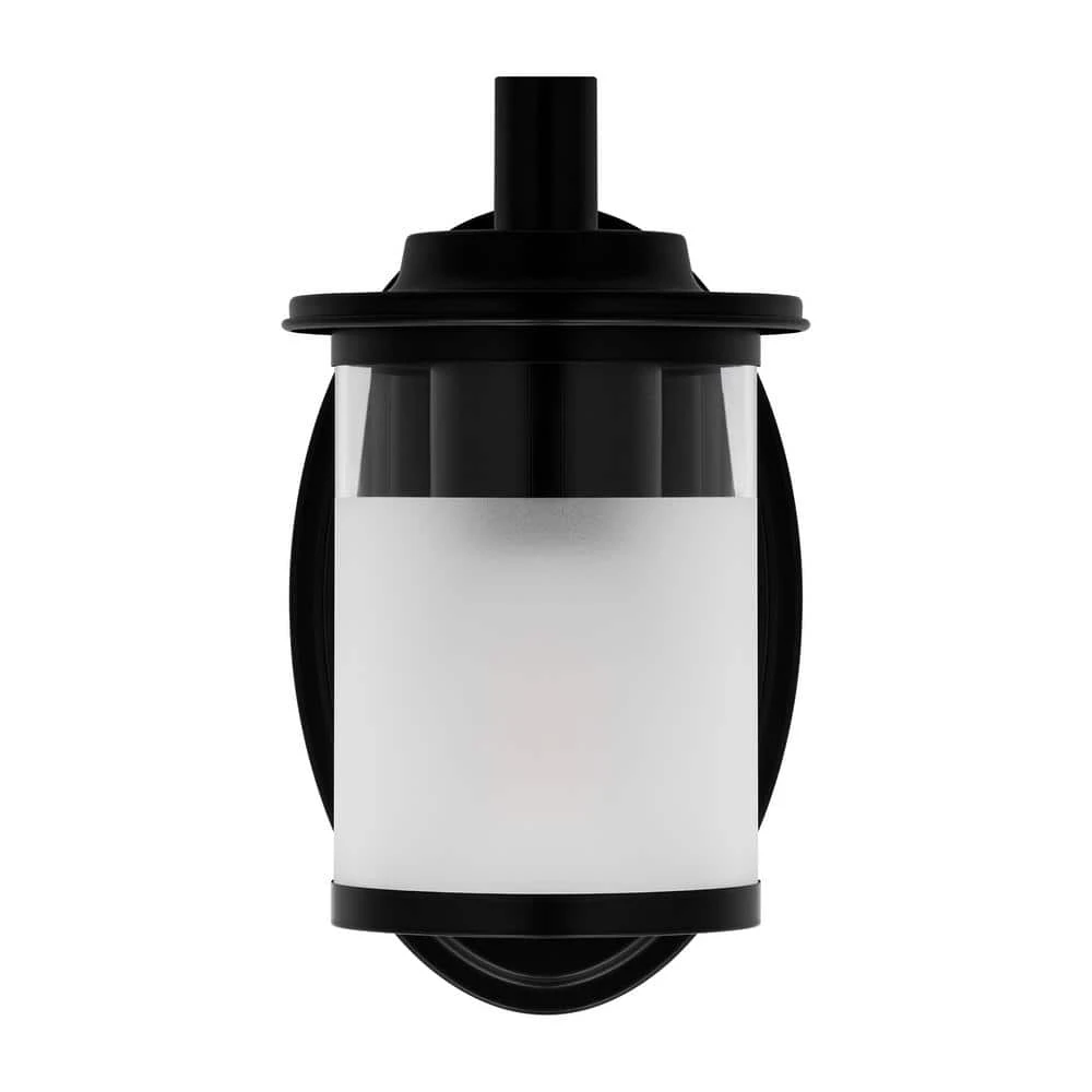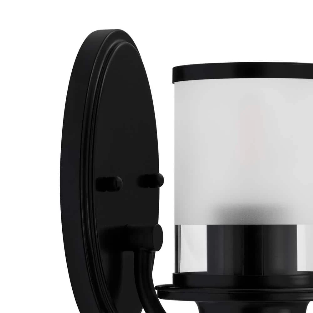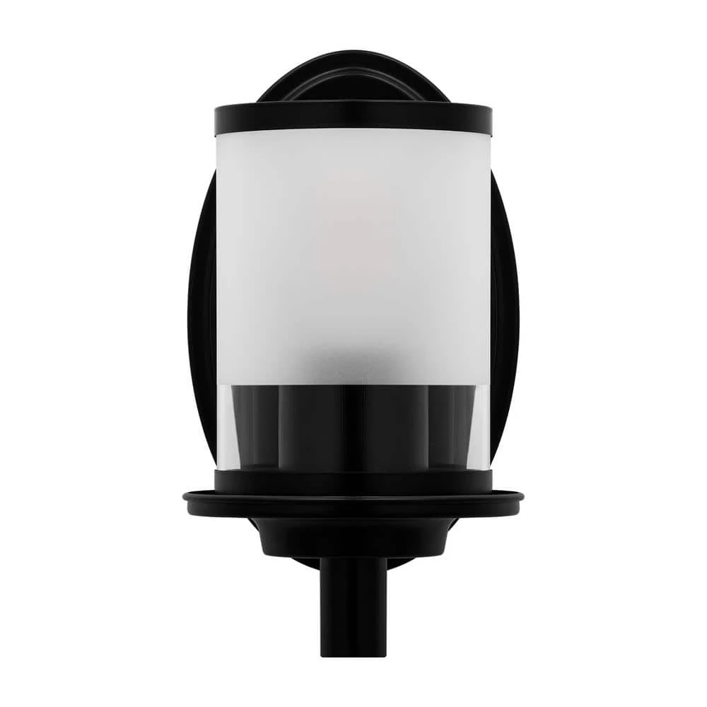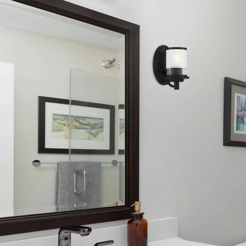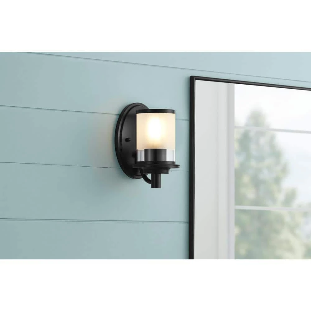 This Hampton Bay Wall Sconce will be sure to add Modern Elegance to your bath. It features a protective Matte Black finish, a partially frosted glass shade and an edged metal ring detail. The sturdy steel construction means it will last and can be mounted in the up or down position.