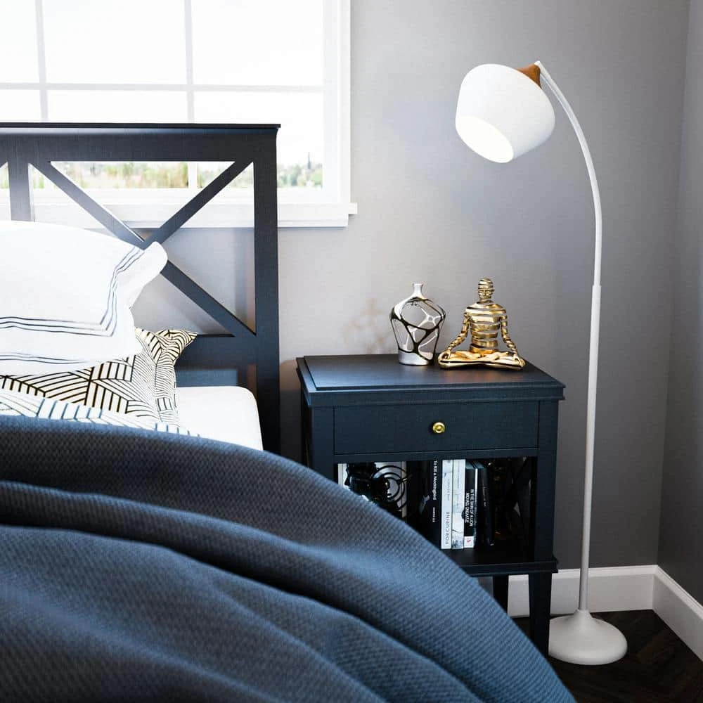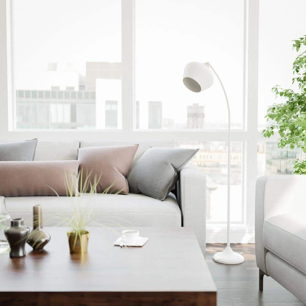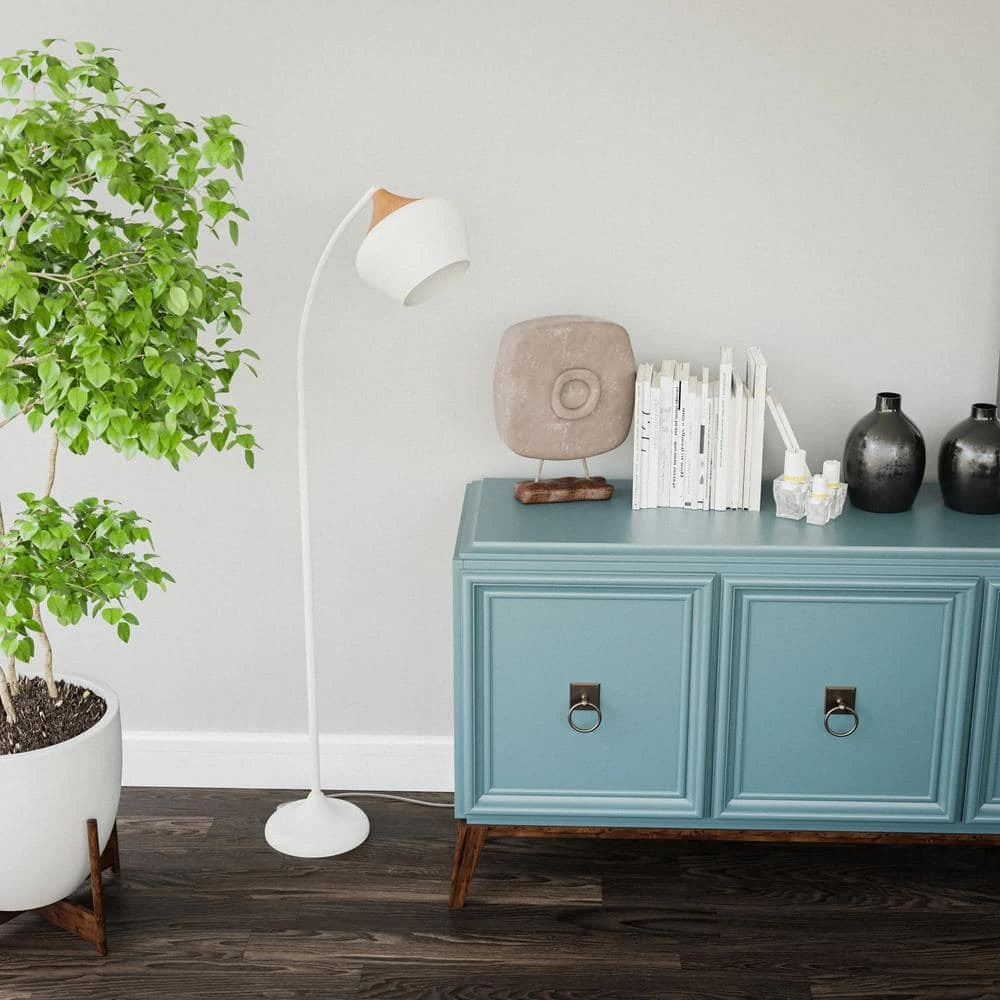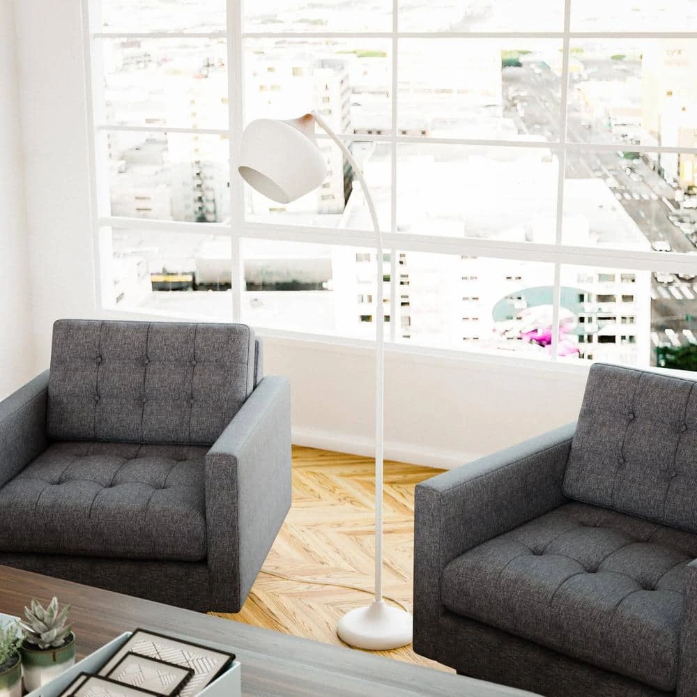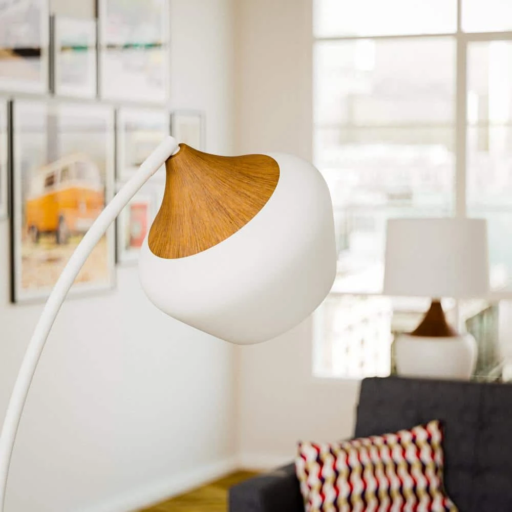 The Turin Floor Lamp’s arc-style profile allows for room filling light in a small footprint. The Turin features a smooth matte white finish with an eye-catching contemporary wood accent on the metal dome shade – ideal for complementing your retro modern living room. Place this lamp beside your living room sofa or work from home desk for strong directional task lighting.