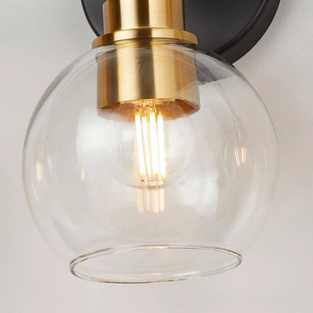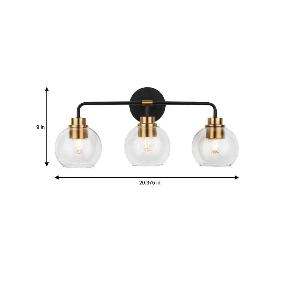 Mid Century comes alive with this beautiful vanity light. Aged bronze frame with aged brass accents, is adorned with clear blown glass shades. LED bulbs are included and provide ample soft yet usable light.