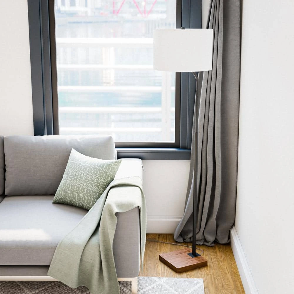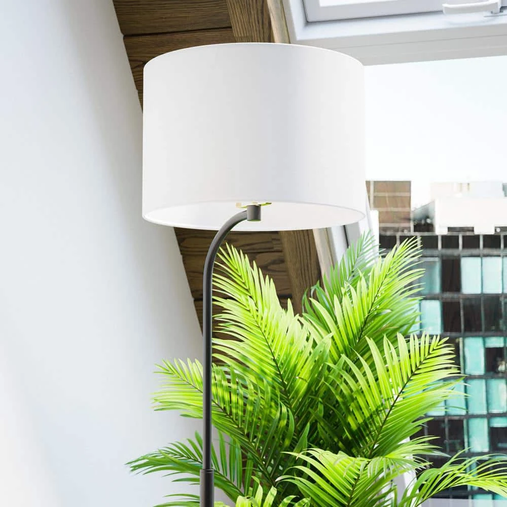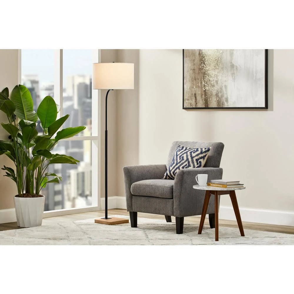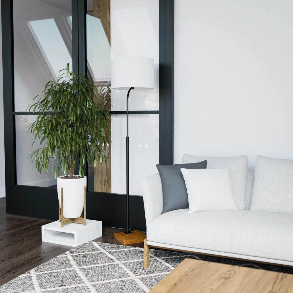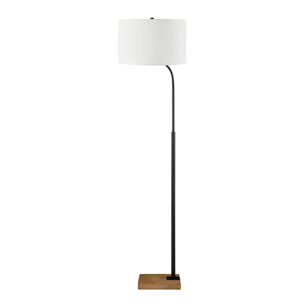 The Warlington Floor lamp’s contemporary style is sure to bring post modern vibes to your retro throwback living room. A geometric square wood offset base contrasts with the matte black lamp body and stark white drum shade, and the offset nature of the base allows you to tuck it under furniture to save space. The crisp white shade creates brilliant, room-filling light – perfect for use as a reading light in living rooms, bedrooms, or home offices.