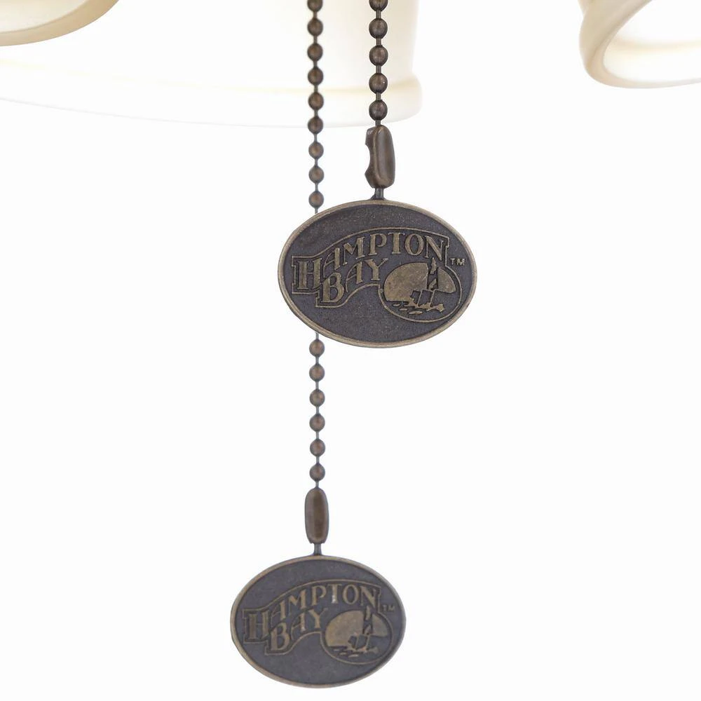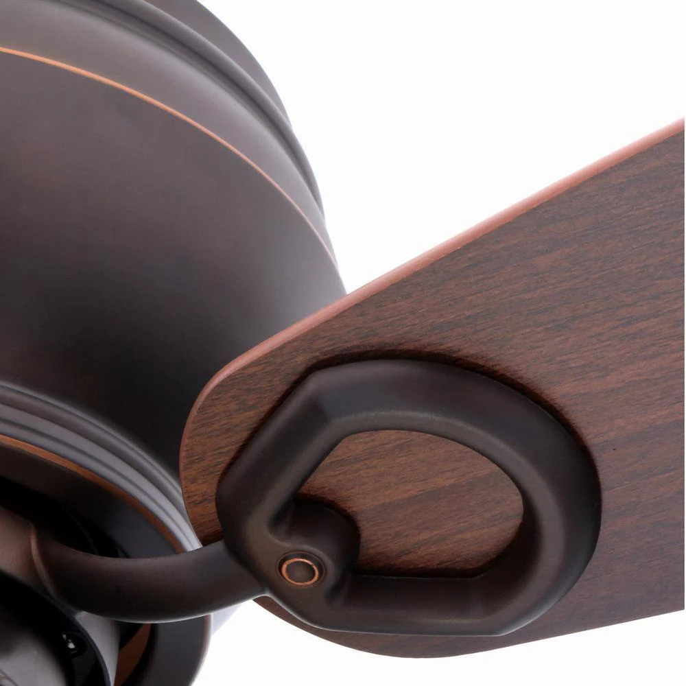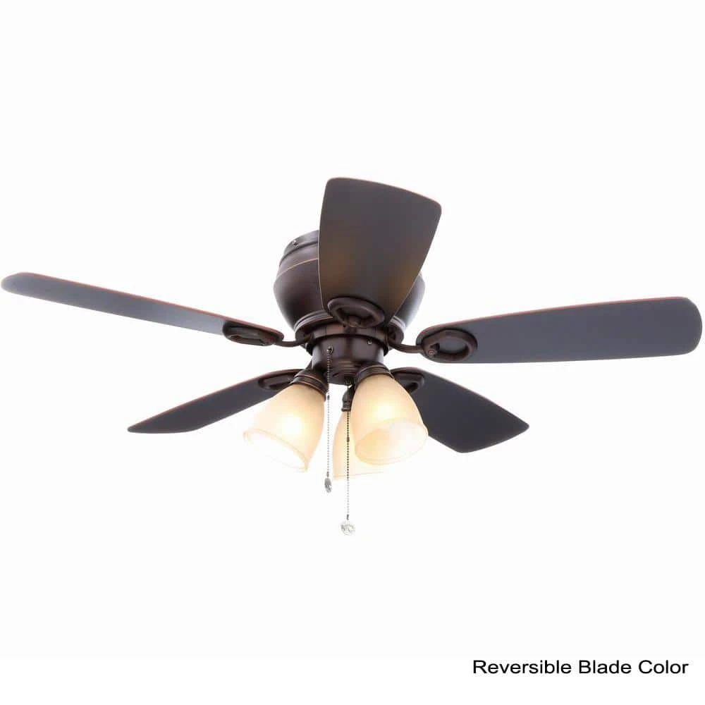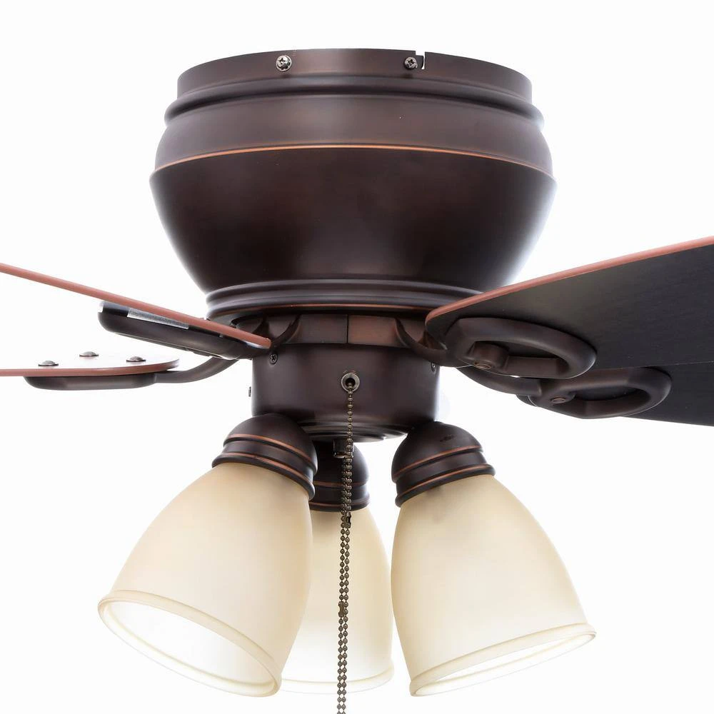 Recapture the beauty of times gone by with the rich finishes and high detail of the Hampton Bay Whitlock Mediterranean Bronze Ceiling Fan. This fan features a 3-light kit with sandstone glass shades and five reversible blades in dark cherry and English oak finish for a versatile look that complements a wide variety of room decor. Uses three 9.5-Watt LED bulbs (not included).