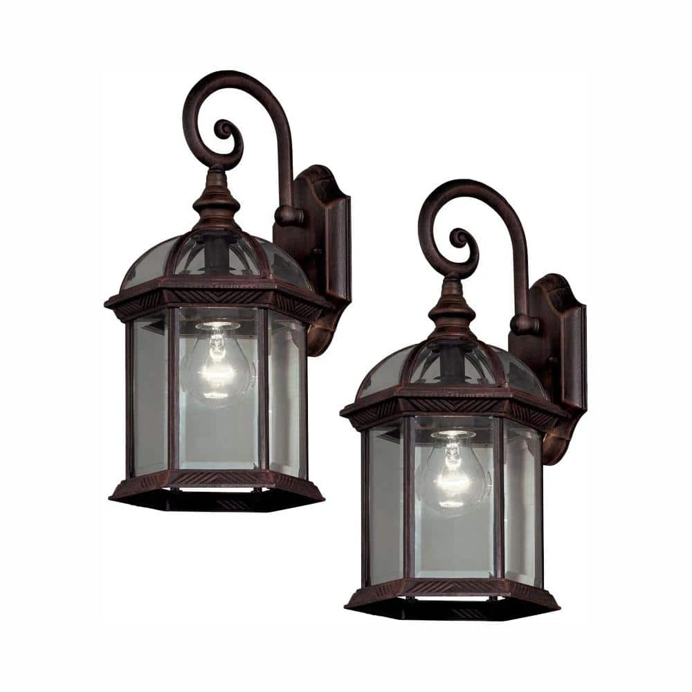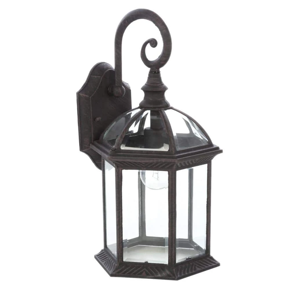 The Hampton Bay 2 pack of outdoor wall light will add a classic, American style to the exterior of your home. The lanterns feature a deep, weathered bronze finish that has been blackened with rich bronze under-tones for a rustic look. The clear glass sides and hexagon shaped frames are complimented by matching sloped roofs, allowing these wall lights to provide all-around illumination in porch areas, walkways, and driveways. Each fixture uses a single 100-watt bulb, and LED light bulbs can be used for energy efficiency. The bottom of each wall lantern is open to allow easy access to change the bulb.