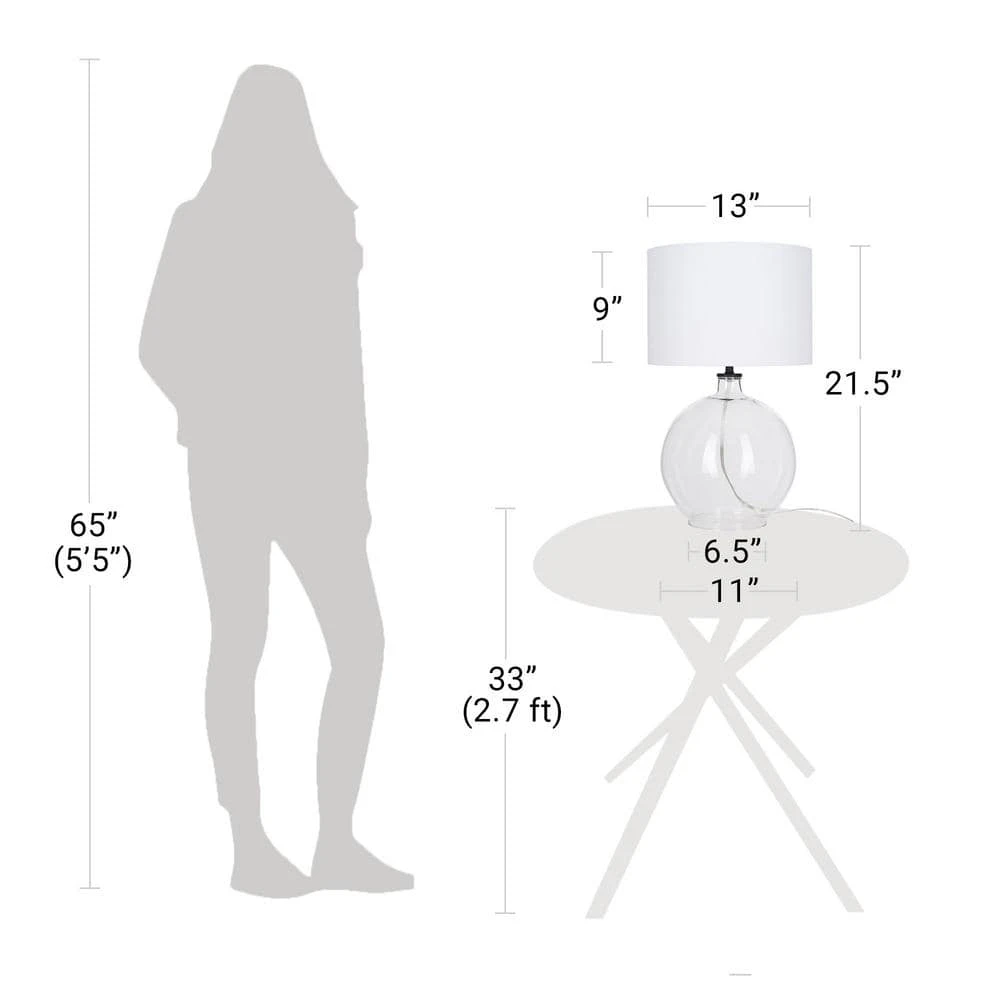 - Assembled Lamp Dimensions: 13″ W x 21.5″ H; clear round lamp body measures 6.5″ Dia. at base and 11″ Dia. at widest point